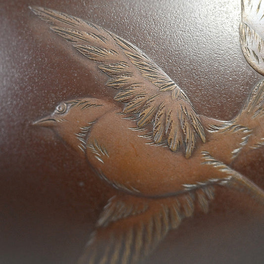 Superb Japanese Bronze Vase ー内免 紫峰 "玉型雲雀模様 花瓶"
