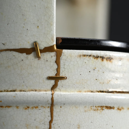 A spectacular Te-oke Mizusashi with Kintsugi Gold Repairs ー大樋手桶 水さし