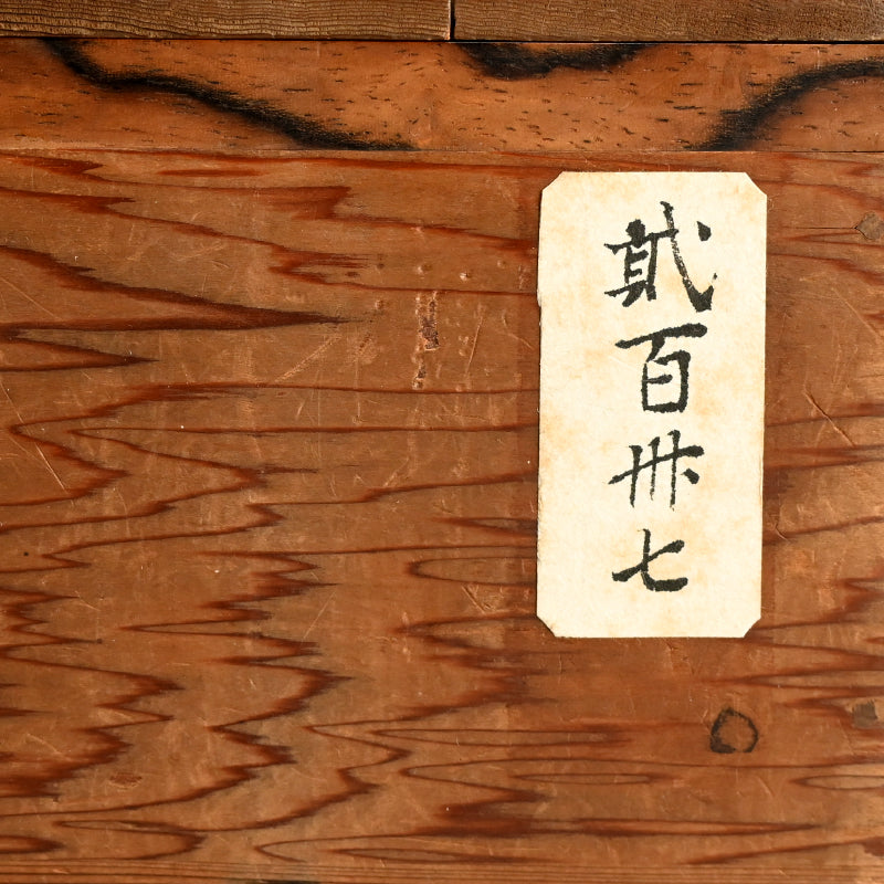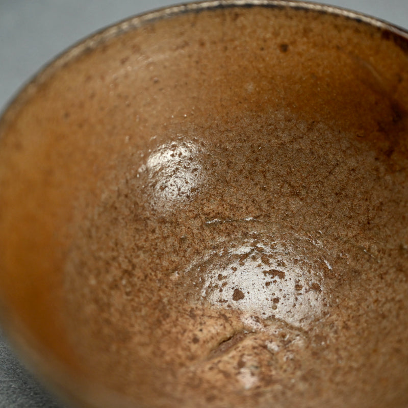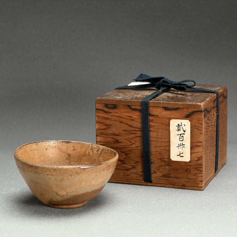 桃山時代から江戸時代初期の間に作られた唐津茶碗です。黒柿の縁取りが施され、年月を経て黒ずんだ柾目杉の箱に収められています。やや形が崩れていますが、茶碗の直径は11~12cm、高さは5~6cmで 驚くほど良好な状態です。縁の部分に古い漆の補修跡がいくつかあり、この茶碗が長年大切に扱われてきたことを証明しています。