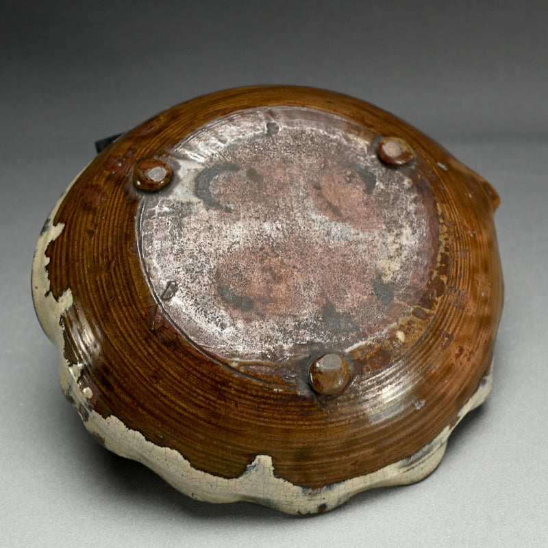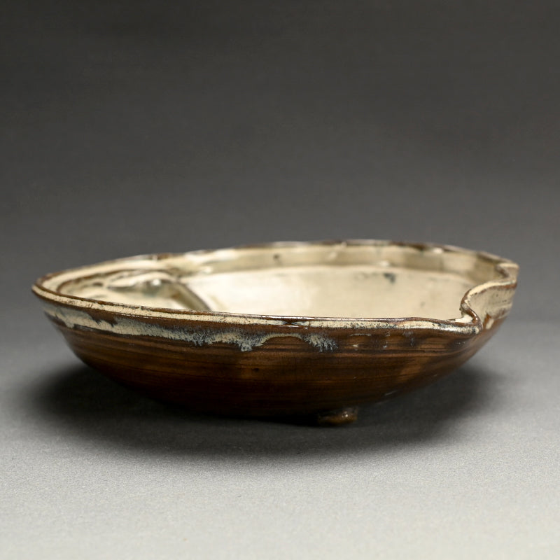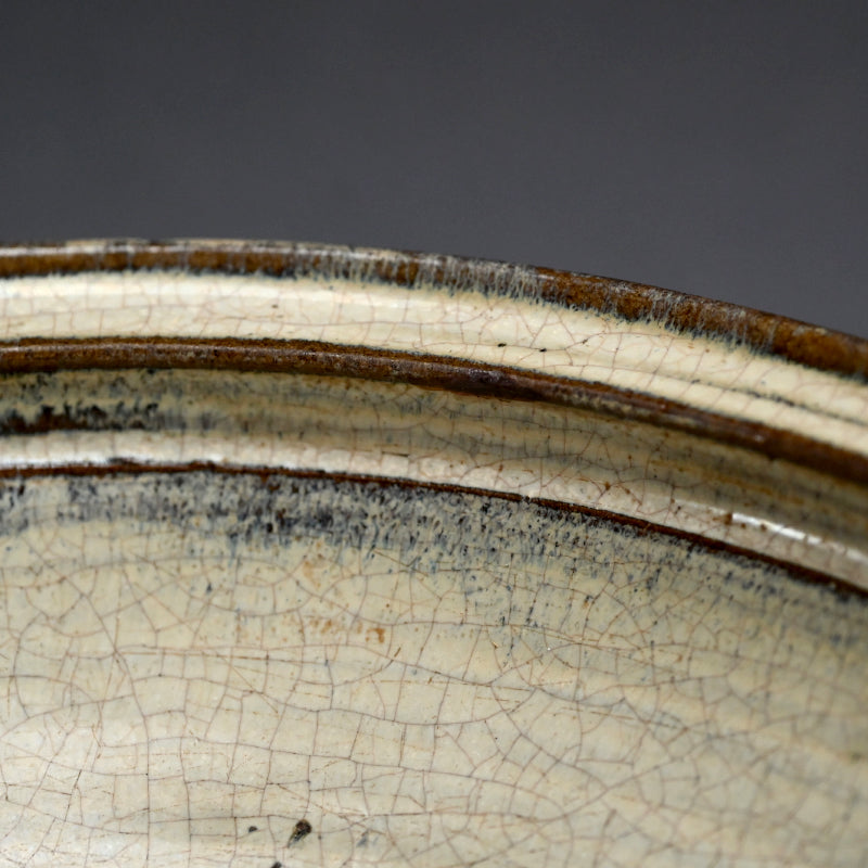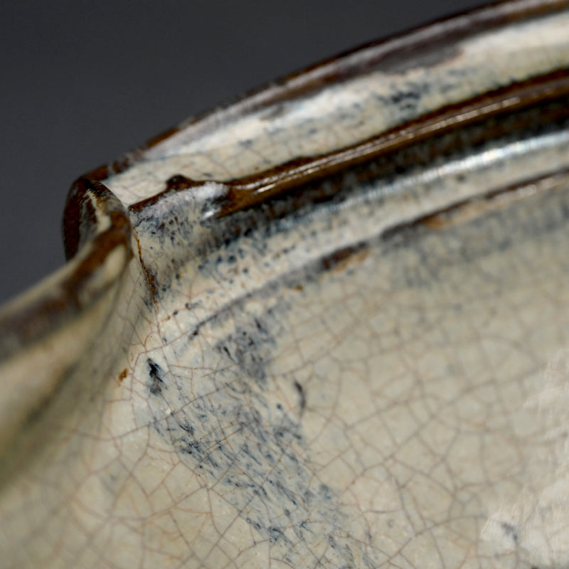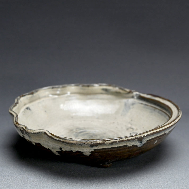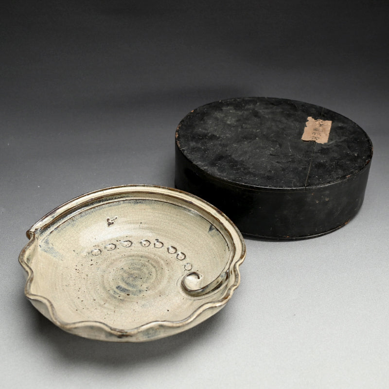 江戸中期に唐津窯で作られた、泡沫のなまこ色で覆われたアワビ貝の形をした美しい鉢です。「唐津鮑型鉢」と題された黒漆塗りの曲物円形箱に収められています。鉢の直径は約29cm、高さは7cmで 状態は良好です。