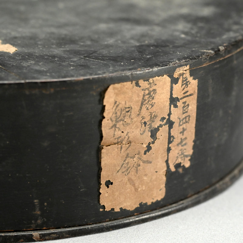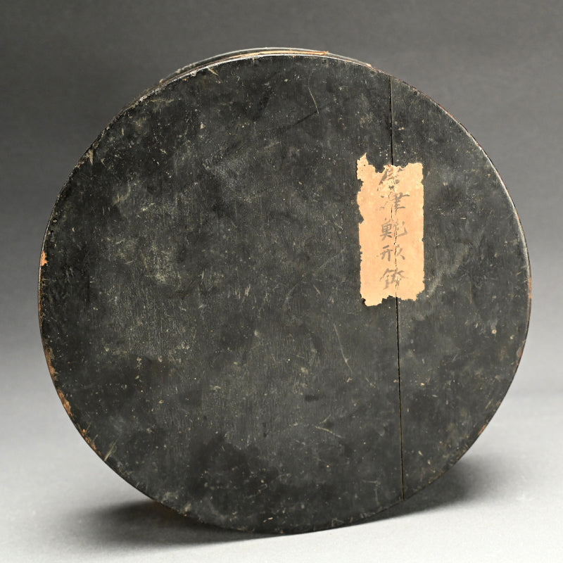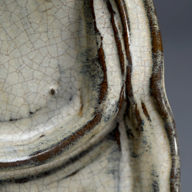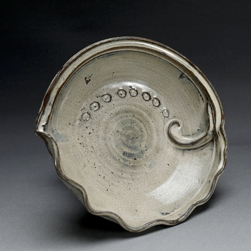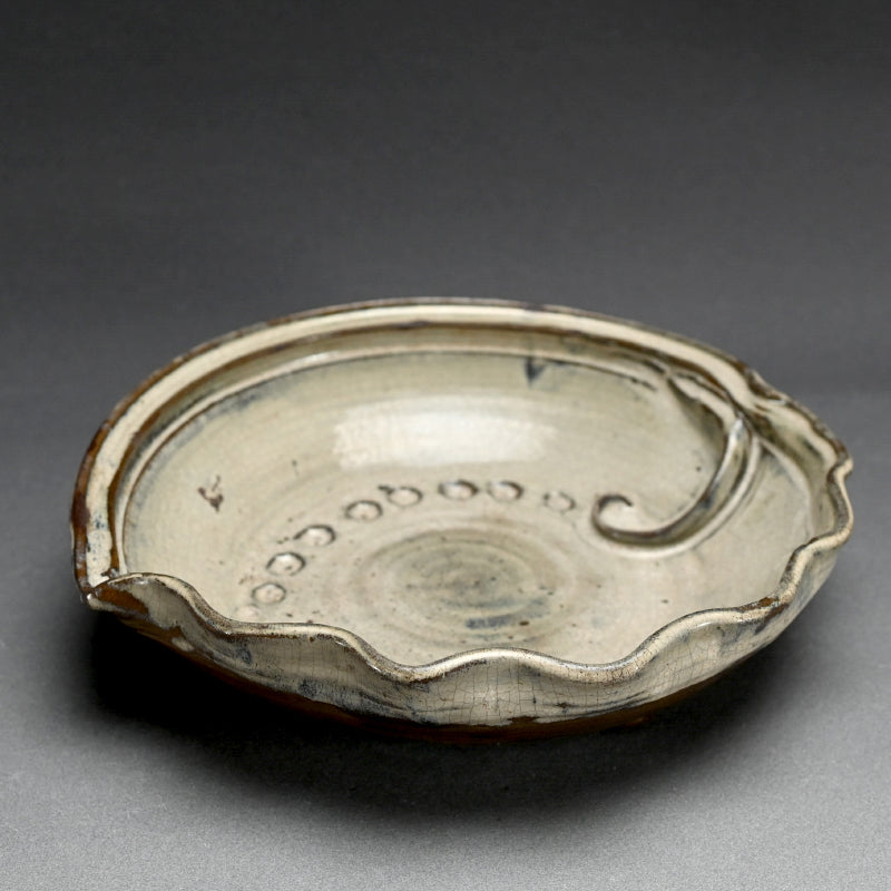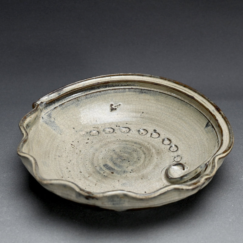 江戸中期に唐津窯で作られた、泡沫のなまこ色で覆われたアワビ貝の形をした美しい鉢です。「唐津鮑型鉢」と題された黒漆塗りの曲物円形箱に収められています。鉢の直径は約29cm、高さは7cmで 状態は良好です。