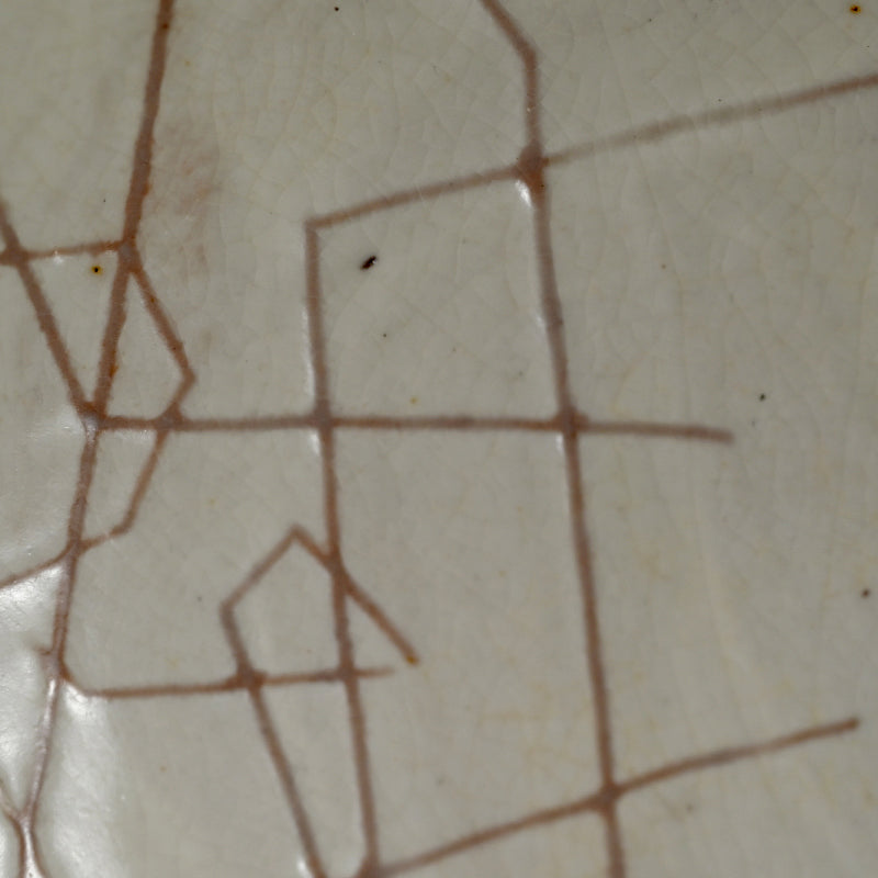 A large serving bowl with incised designs in cloudy pale glaze by Kumakura Junkichi enclosed in the original signed wooden box titled simply Hachi. It is 25 cm (10 inches) diameter, 8.5 cm (3-1/2 inches) tall and in excellent condition.