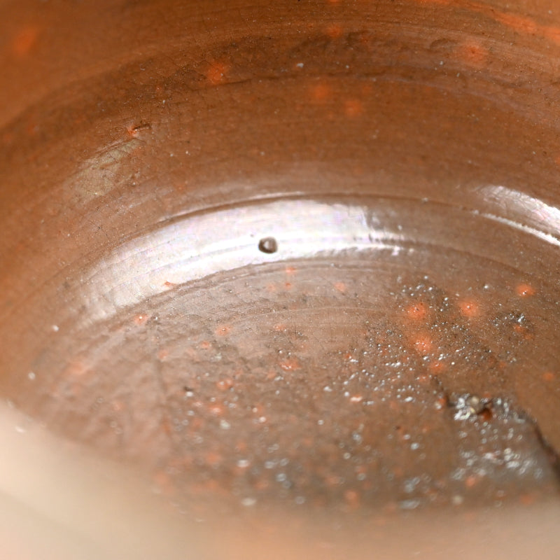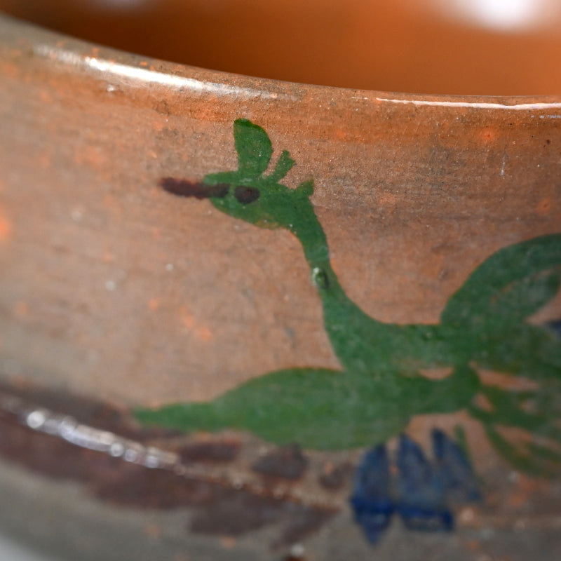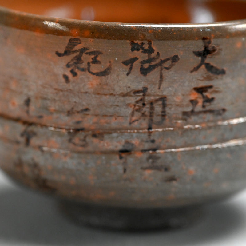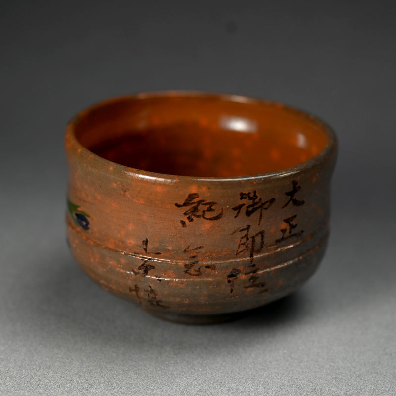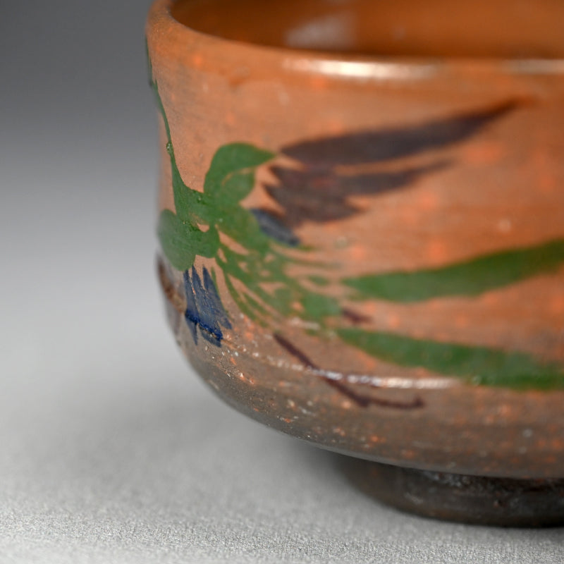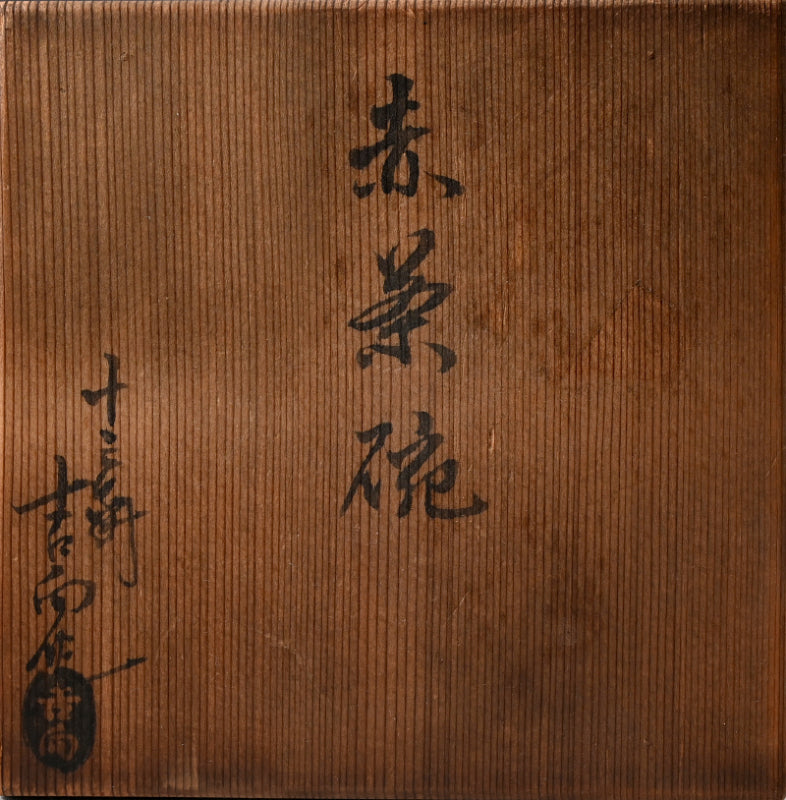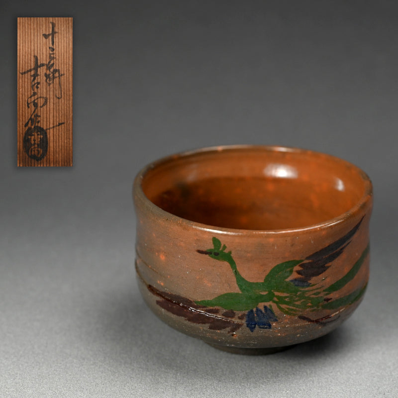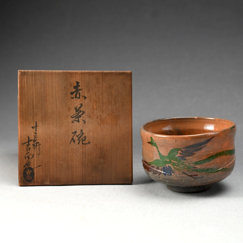 An aka-Raku Chawan decorated with a phoenix by Jusanken Kikko sealed on bottom with what appears to read “the 7th Kyoto Gosho Hakurankai enclosed in the original signed wooden box. It is 12 cm ( just less than 5 inches) diameter, 89 cm (3-1/8 inches) tall and is in excellent condition.