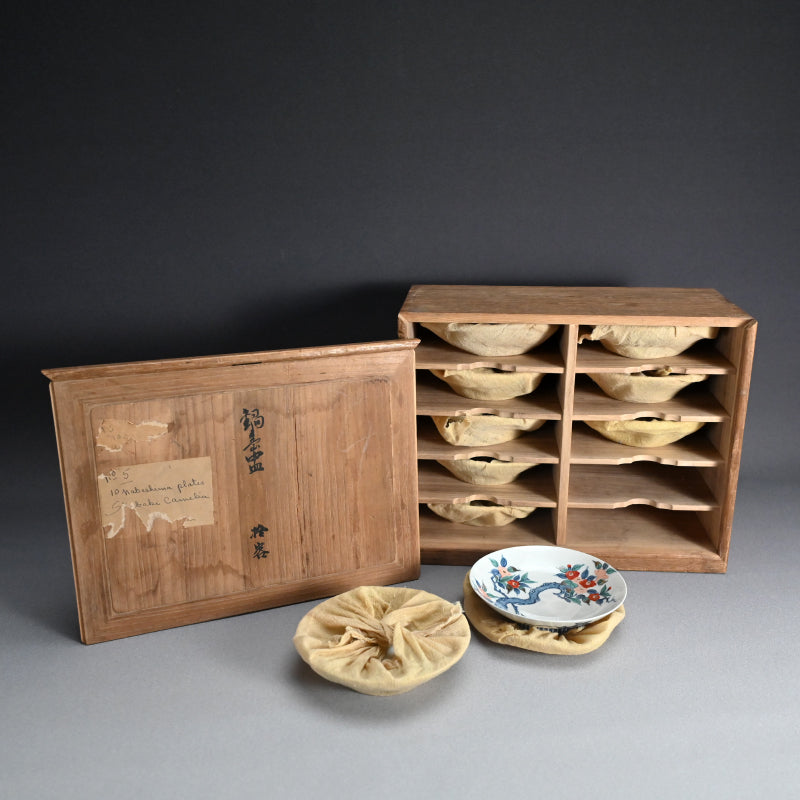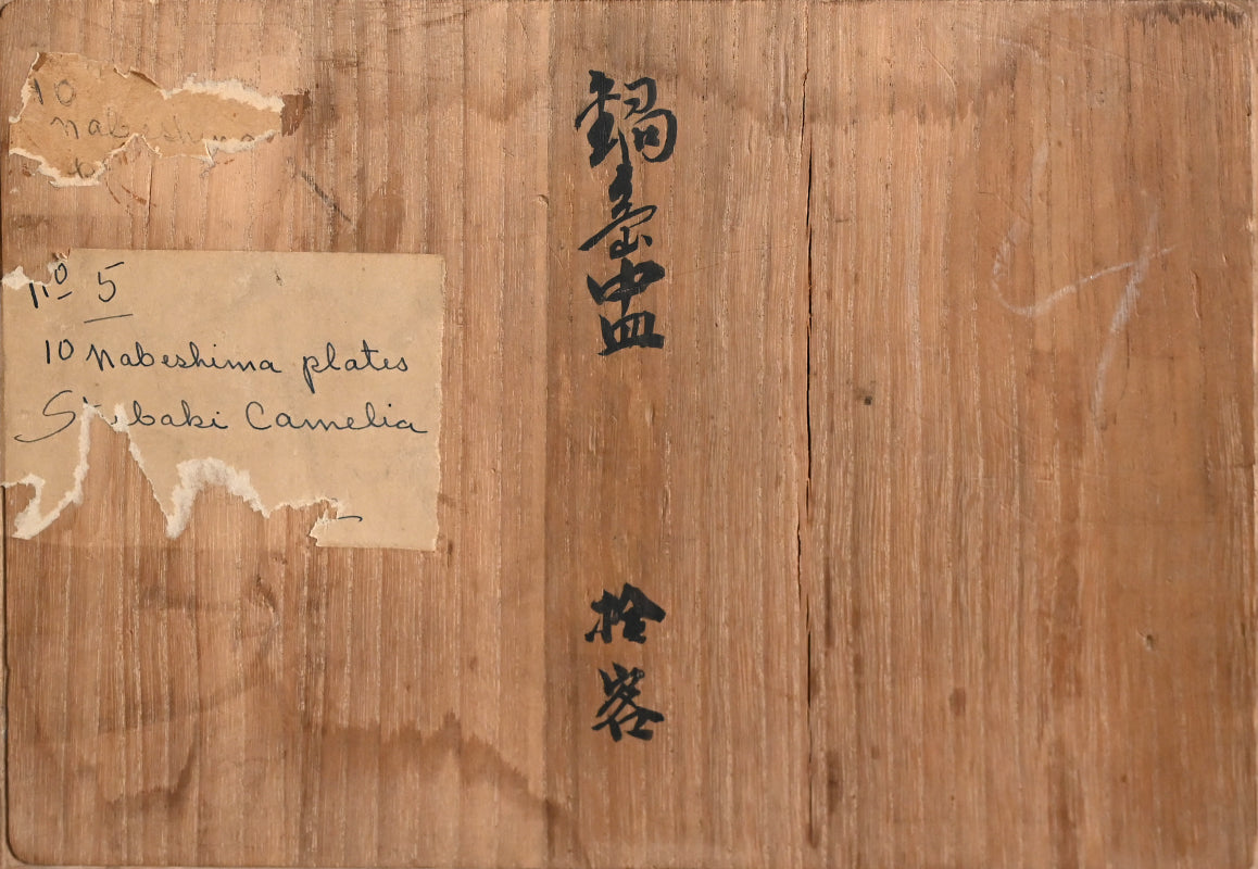 19世紀後半に作られた、赤、ピンク、緑、釉下彩で花咲く木々が手作業で装飾された鍋島皿10枚入りの優美な箱入りセットです。縁に向かって急なカーブを描く頬と、特徴的な高台が特徴で、時代を感じさせる黒ずんだ特注の桐箱に収められており、それぞれが専用の収納スペースに収められています。「鍋島中皿十客」と題された箱に入っており、後から貼られた紙ラベルには、手書きの英語で「鍋島皿10枚、椿 (原文ママ)」と記されています。