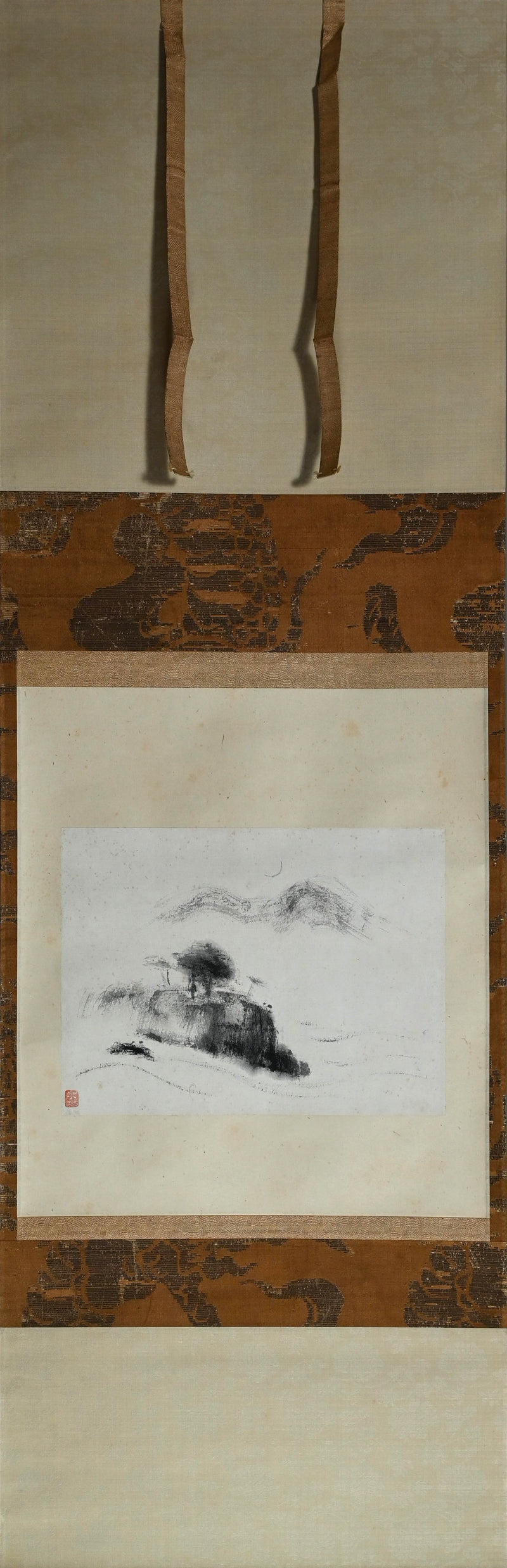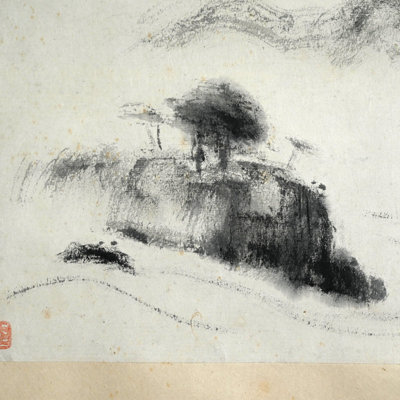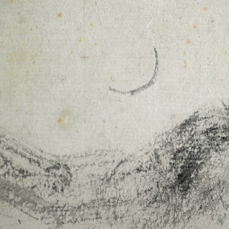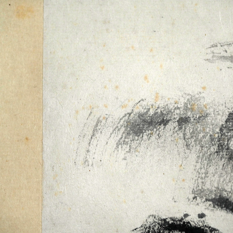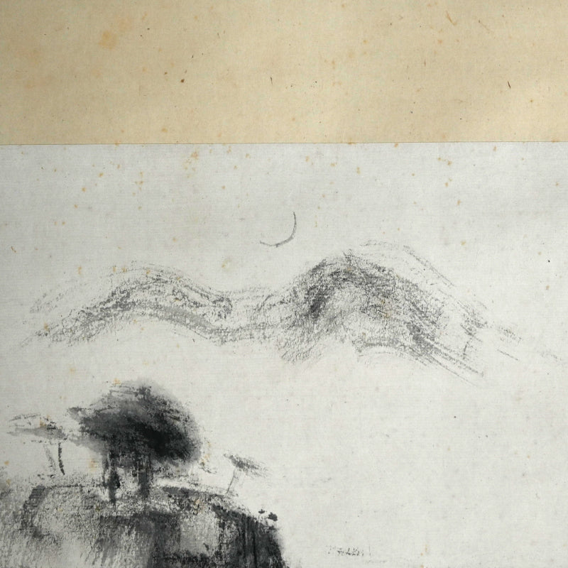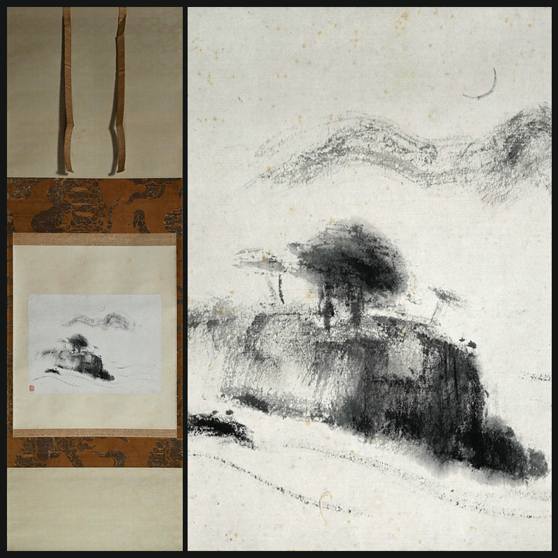 山の上に昇る細い月、木々の間を流れる水あるいは霧、そして前面の岩山。藤井達吉による手漉きの小原紙に乾筆で描かれたこの絵は、原本署名入りの「二日月」木箱に収められています。江戸時代の銀襴布で縁取りされた卵殻紙に、陶器のローラーで表装されています。本幅は42cm×134cm(16.5×52.3/4インチ)で、経年のわずかなシミはあるものの、全体的に良好な状態です。