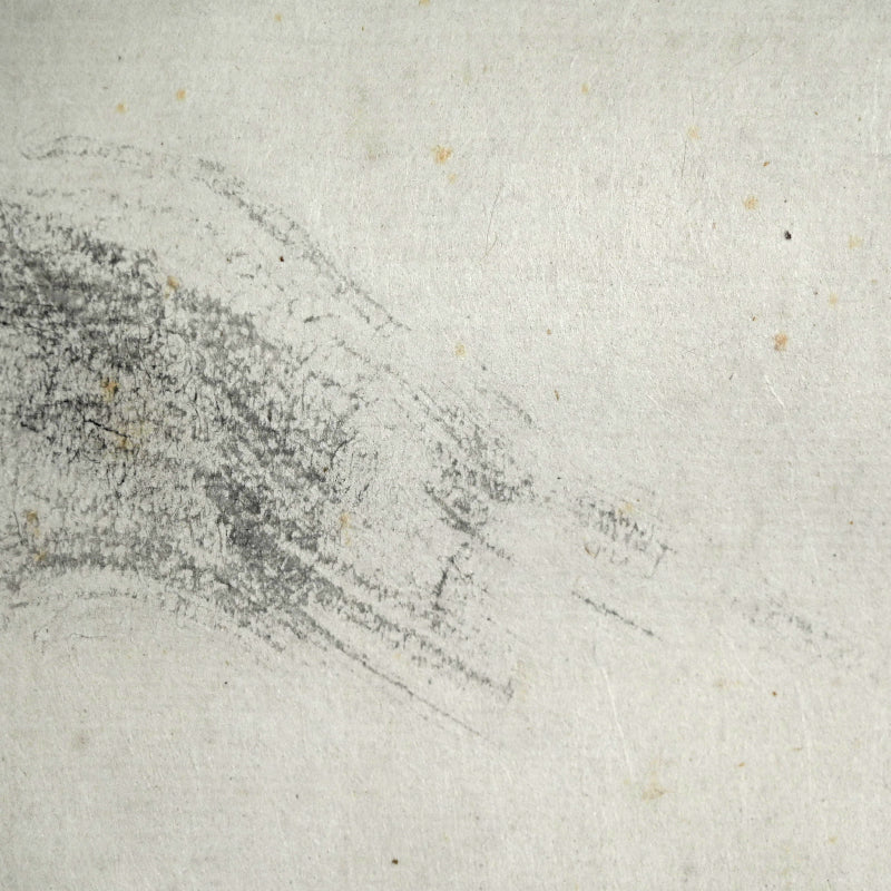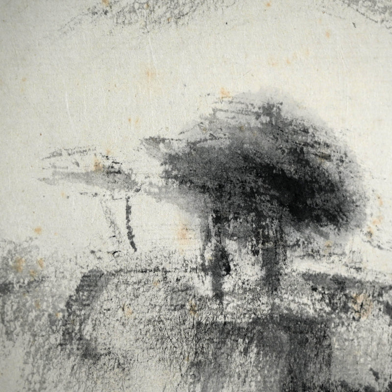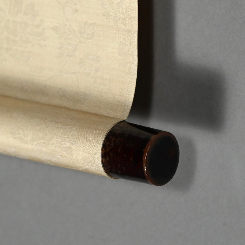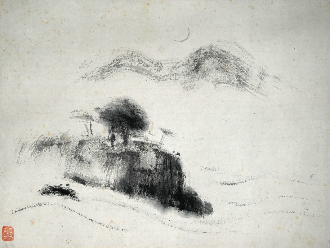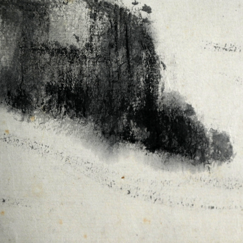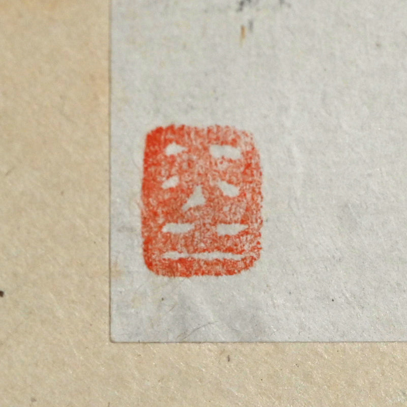 山の上に昇る細い月、木々の間を流れる水あるいは霧、そして前面の岩山。藤井達吉による手漉きの小原紙に乾筆で描かれたこの絵は、原本署名入りの「二日月」木箱に収められています。江戸時代の銀襴布で縁取りされた卵殻紙に、陶器のローラーで表装されています。本幅は42cm×134cm(16.5×52.3/4インチ)で、経年のわずかなシミはあるものの、全体的に良好な状態です。