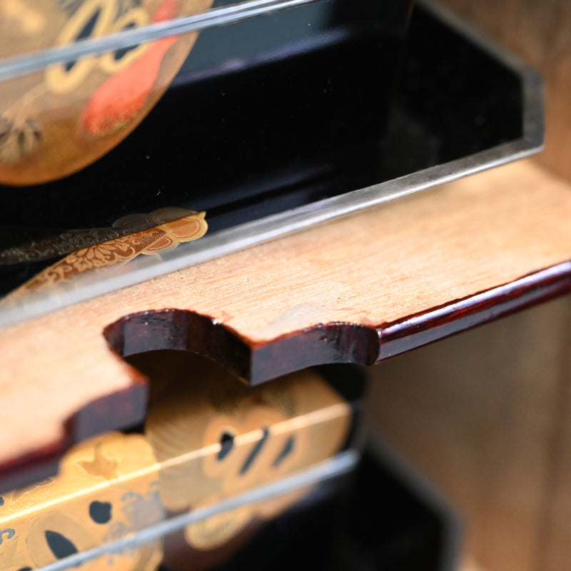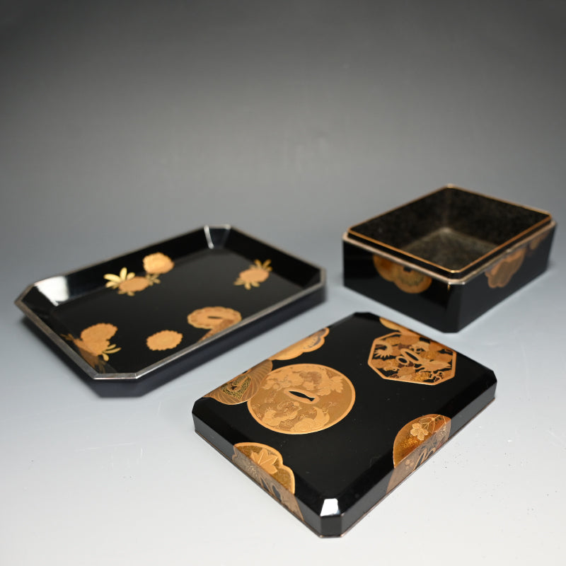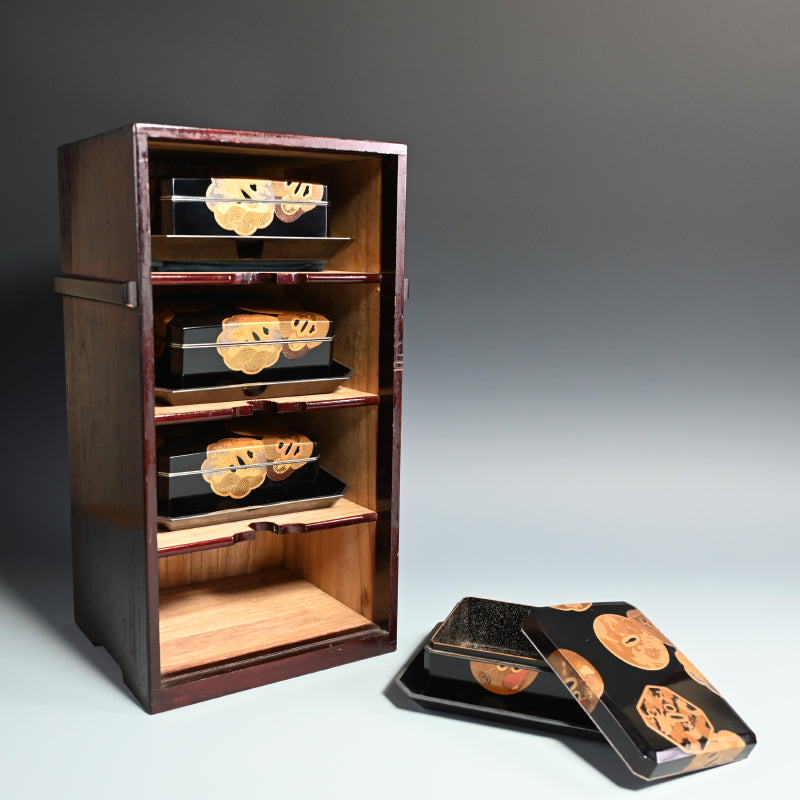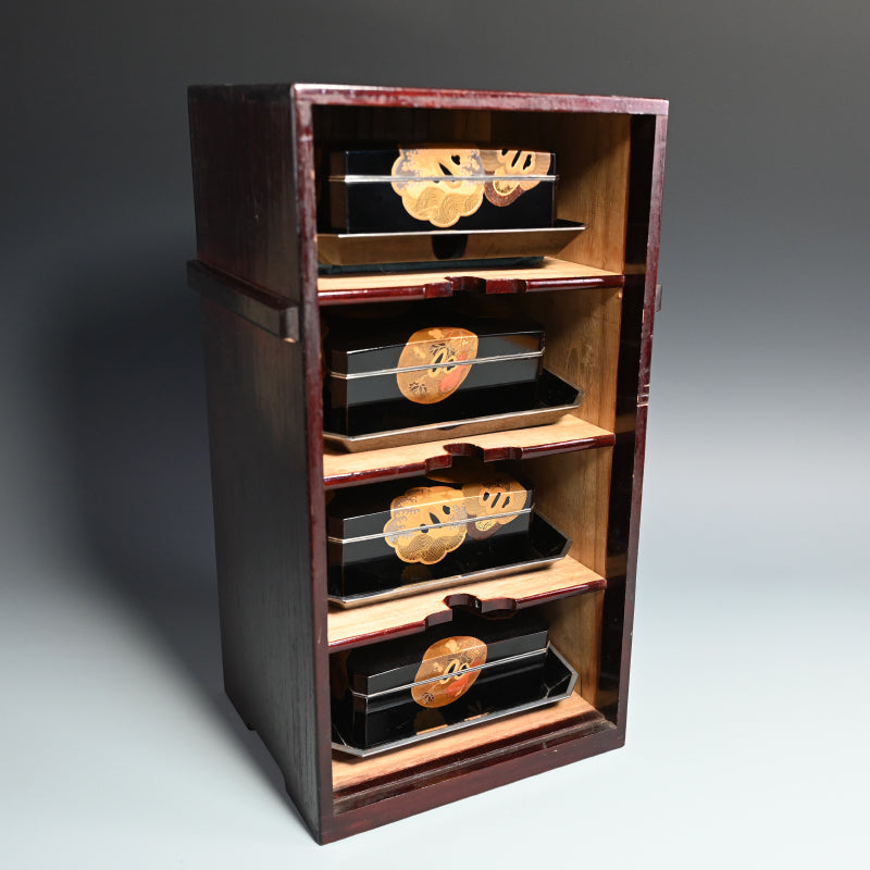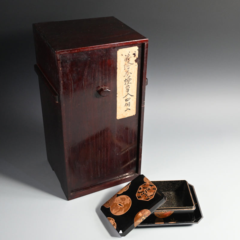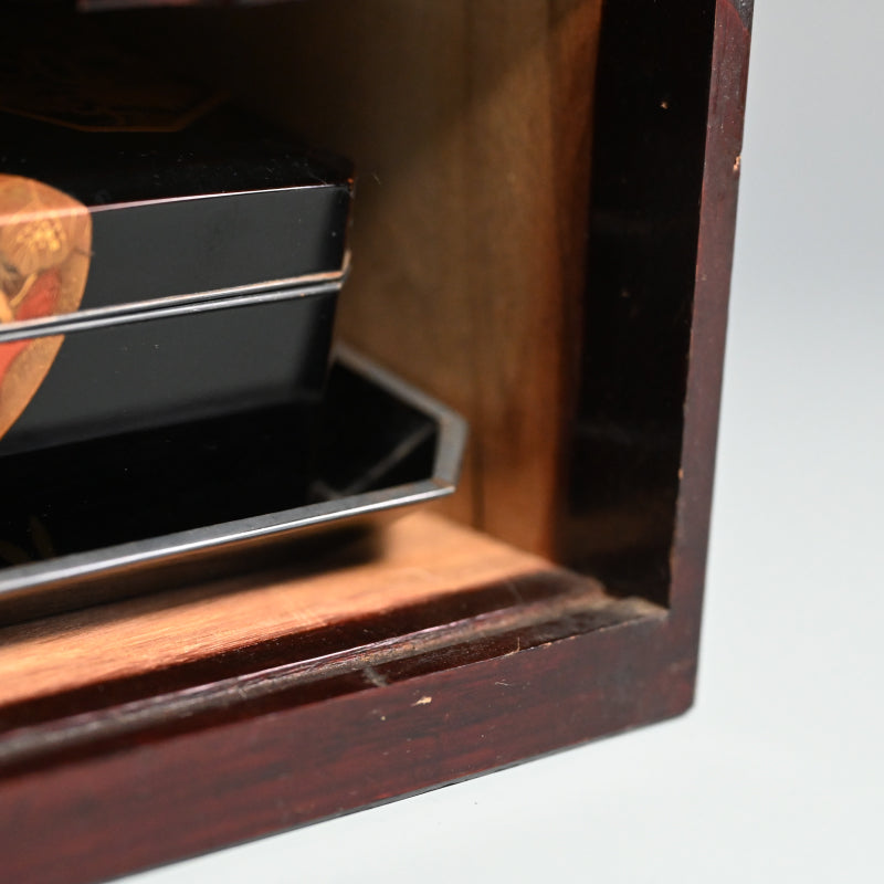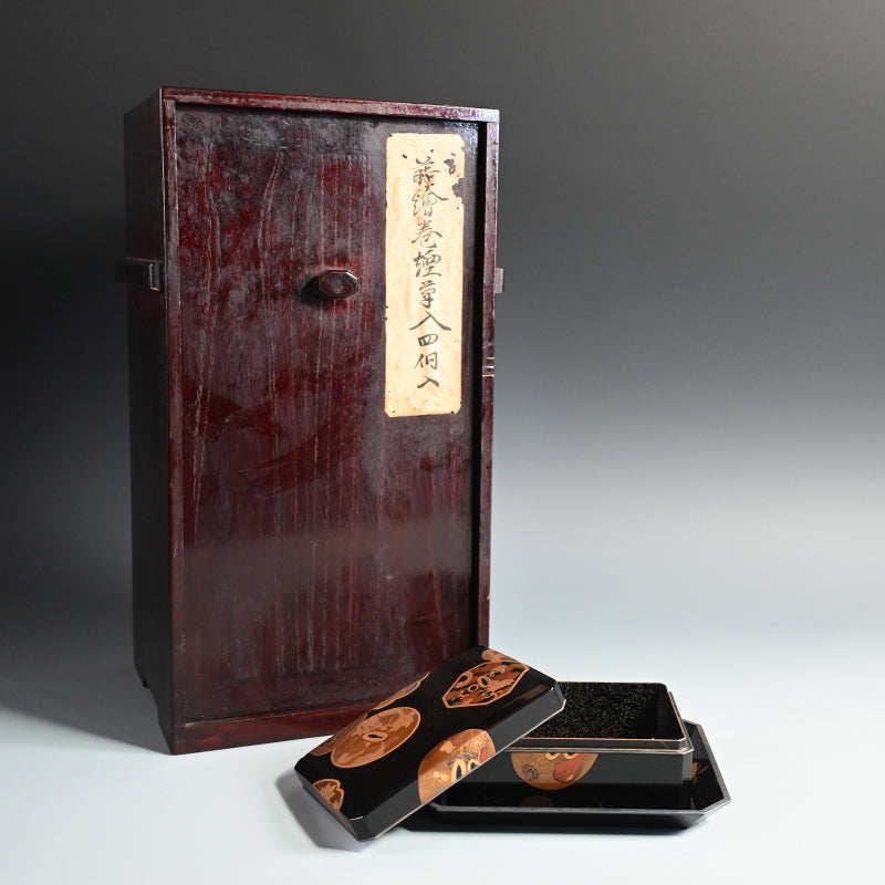 20世紀初頭の漆黒の鏡面に金の鍔をあしらった美しい漆塗りの木箱4個と盆を、4段の黒漆塗りの木箱に収めました。内側は銀梨地で、桜が散りばめられています。盆の縁は純銀製で、良心銘が入っています。箱のサイズは13.5 x 10.5 x 5.7 cm、盆のサイズは17.6 x 14.6 x 1.7 cmで、全体的に良好な状態です。