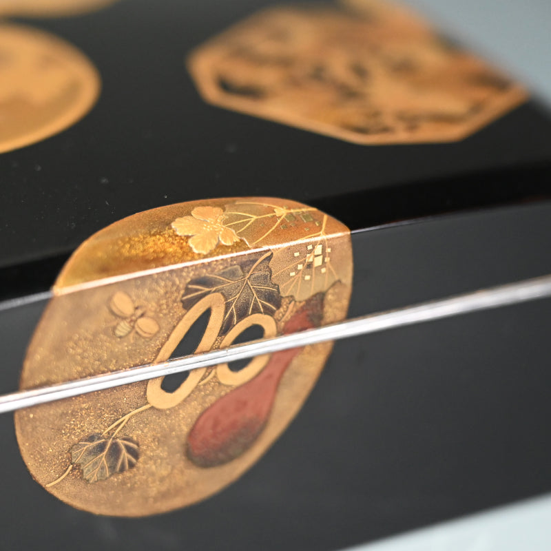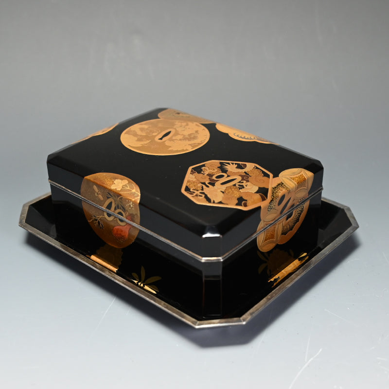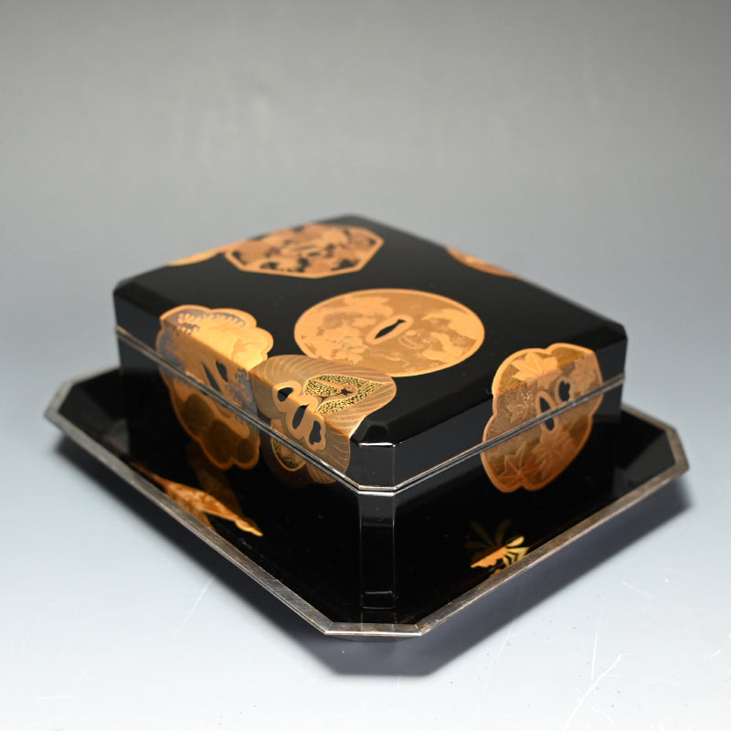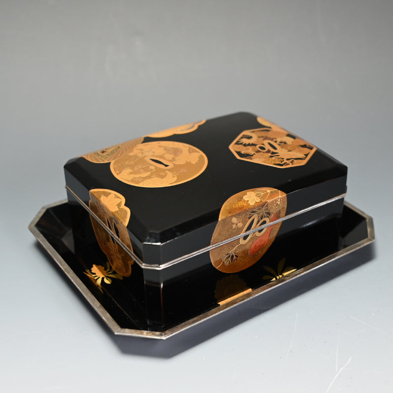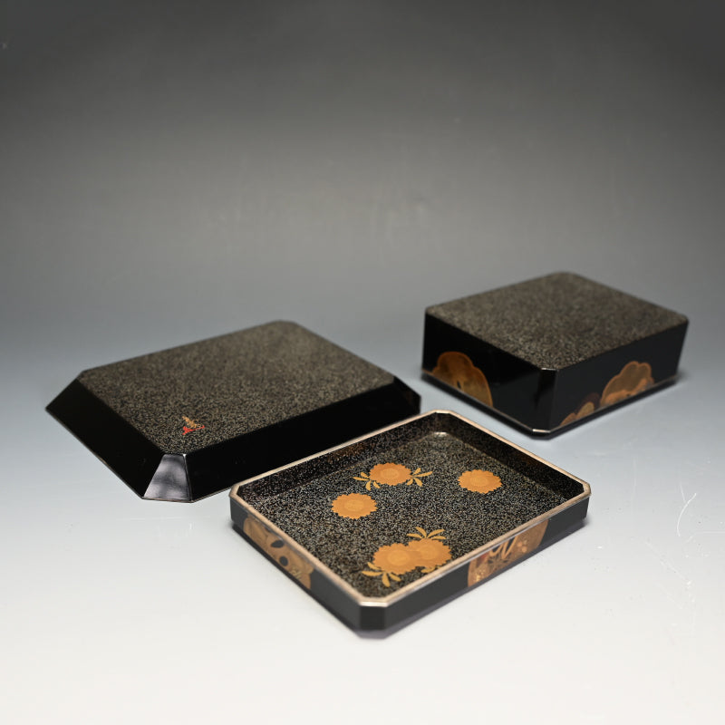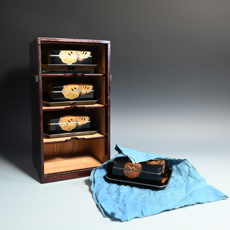 20世紀初頭の漆黒の鏡面に金の鍔をあしらった美しい漆塗りの木箱4個と盆を、4段の黒漆塗りの木箱に収めました。内側は銀梨地で、桜が散りばめられています。盆の縁は純銀製で、良心銘が入っています。箱のサイズは13.5 x 10.5 x 5.7 cm、盆のサイズは17.6 x 14.6 x 1.7 cmで、全体的に良好な状態です。