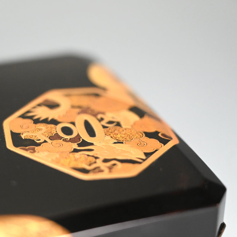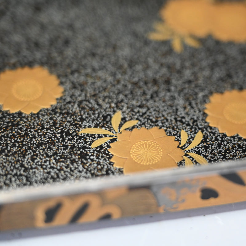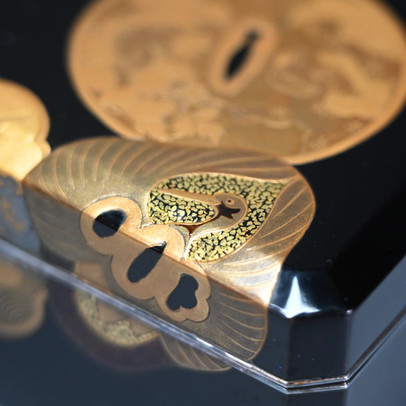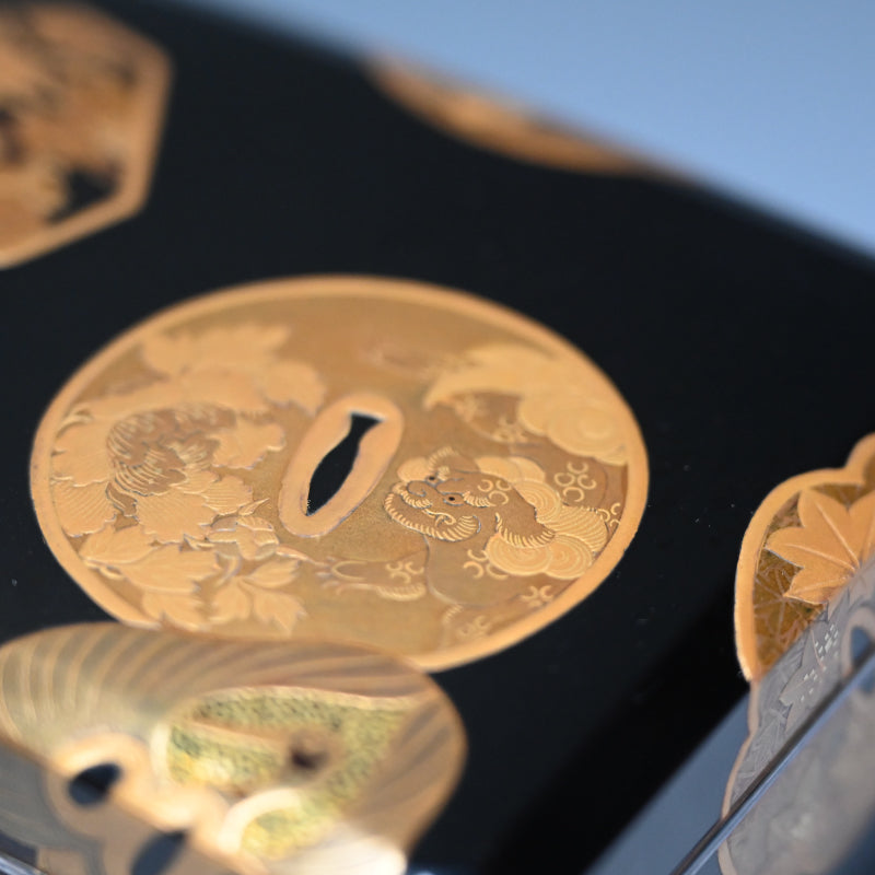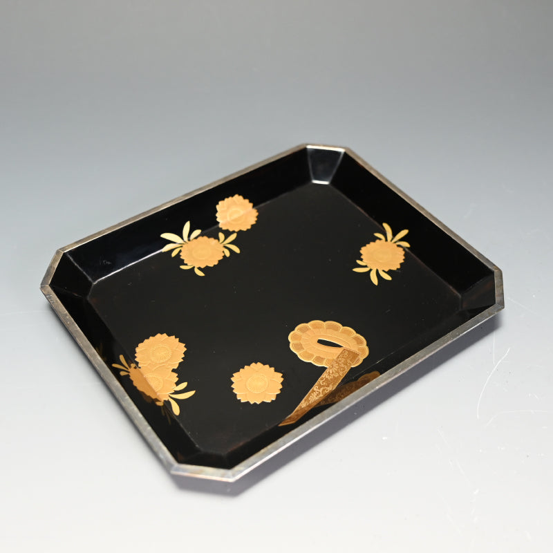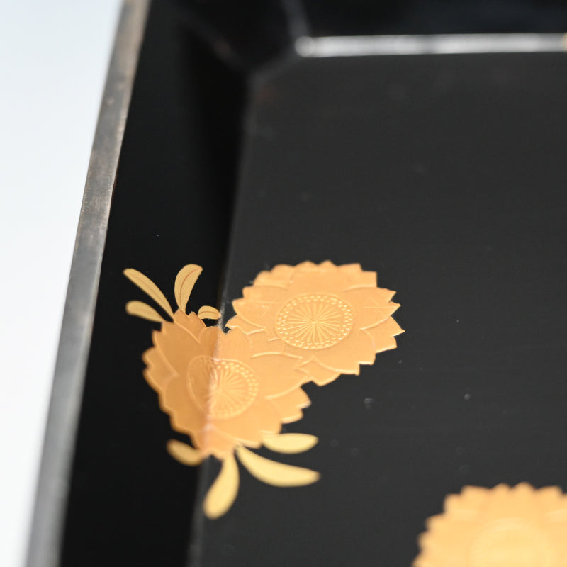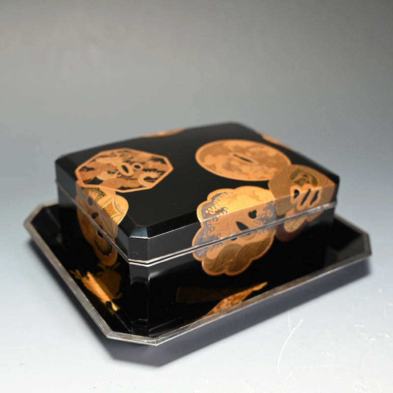 20世紀初頭の漆黒の鏡面に金の鍔をあしらった美しい漆塗りの木箱4個と盆を、4段の黒漆塗りの木箱に収めました。内側は銀梨地で、桜が散りばめられています。盆の縁は純銀製で、良心銘が入っています。箱のサイズは13.5 x 10.5 x 5.7 cm、盆のサイズは17.6 x 14.6 x 1.7 cmで、全体的に良好な状態です。