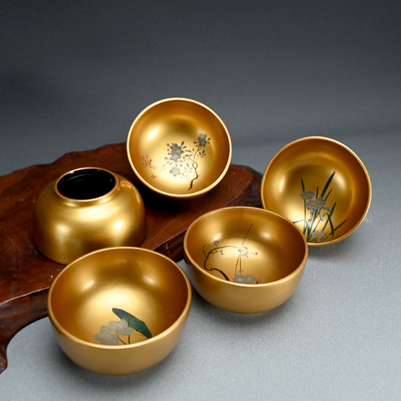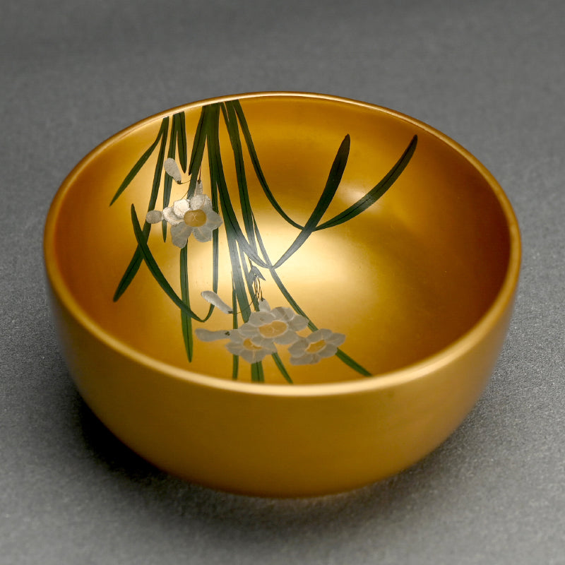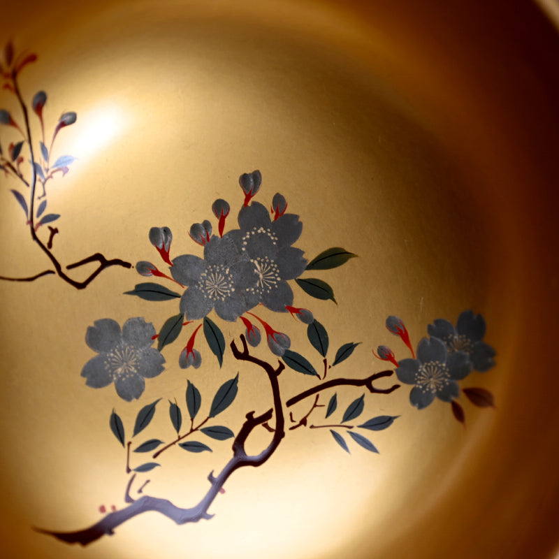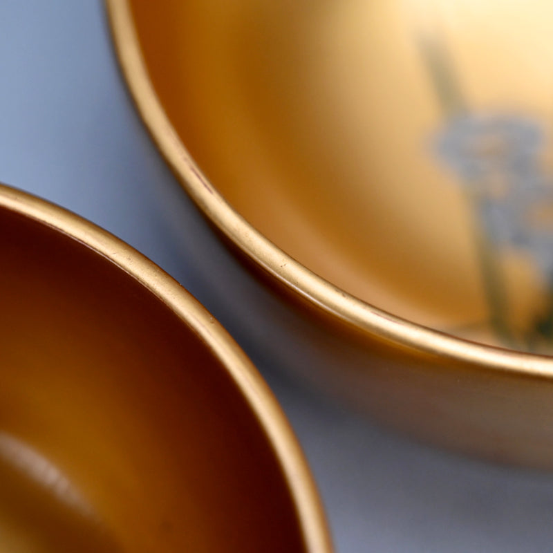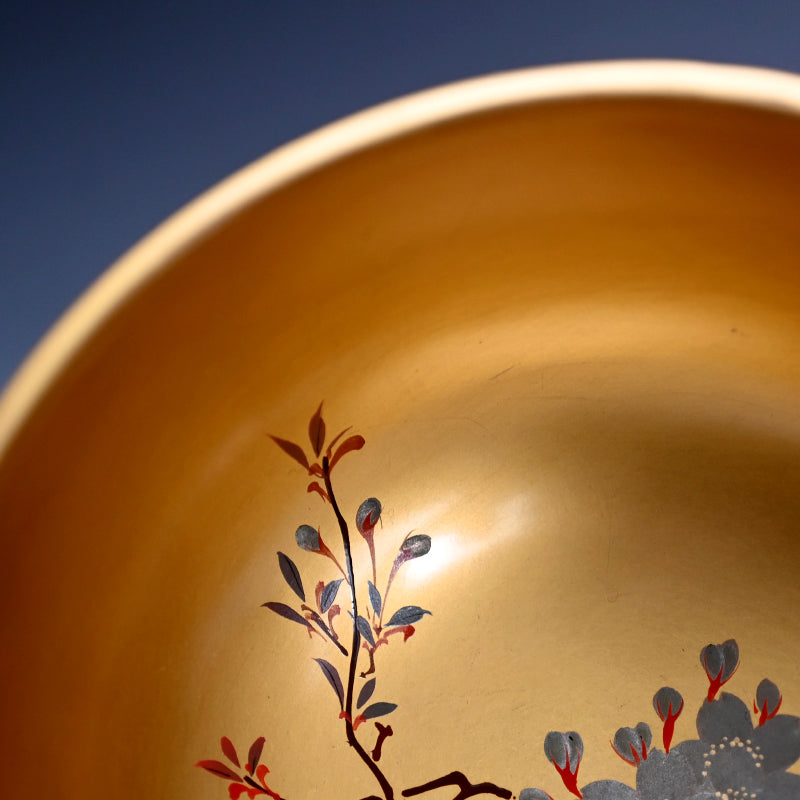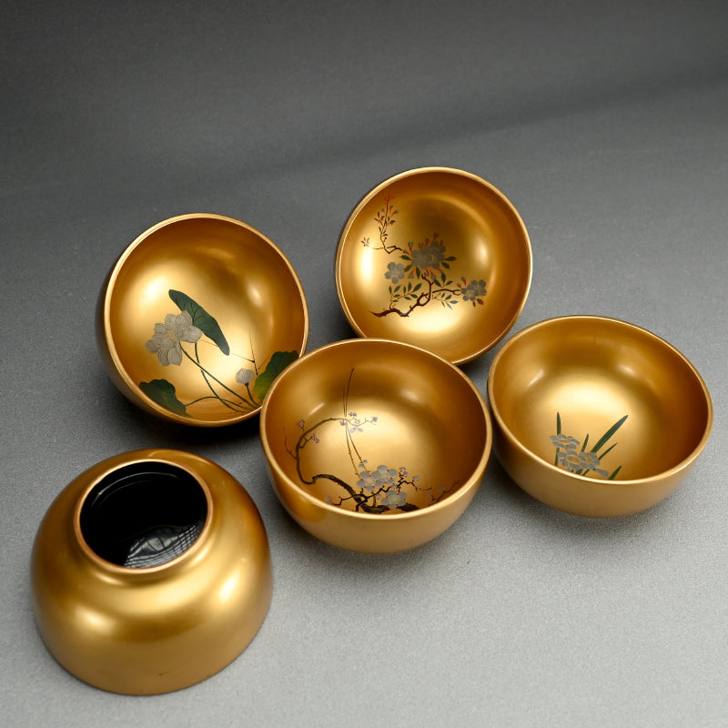 5つの木製碗セットです。美しい金色で覆われており、それぞれの内側には梅、蓮、桜、アヤメ、藤などの季節の花が飾られています。各ボウルは直径12cm、高さ6cmで、すべて20世紀初頭のものです。状態は良好です。