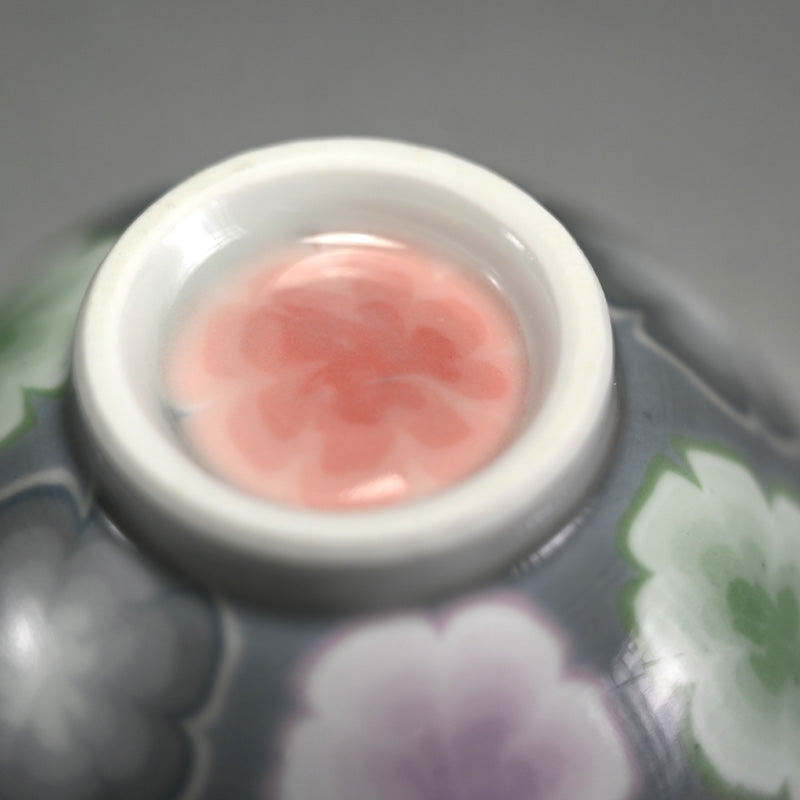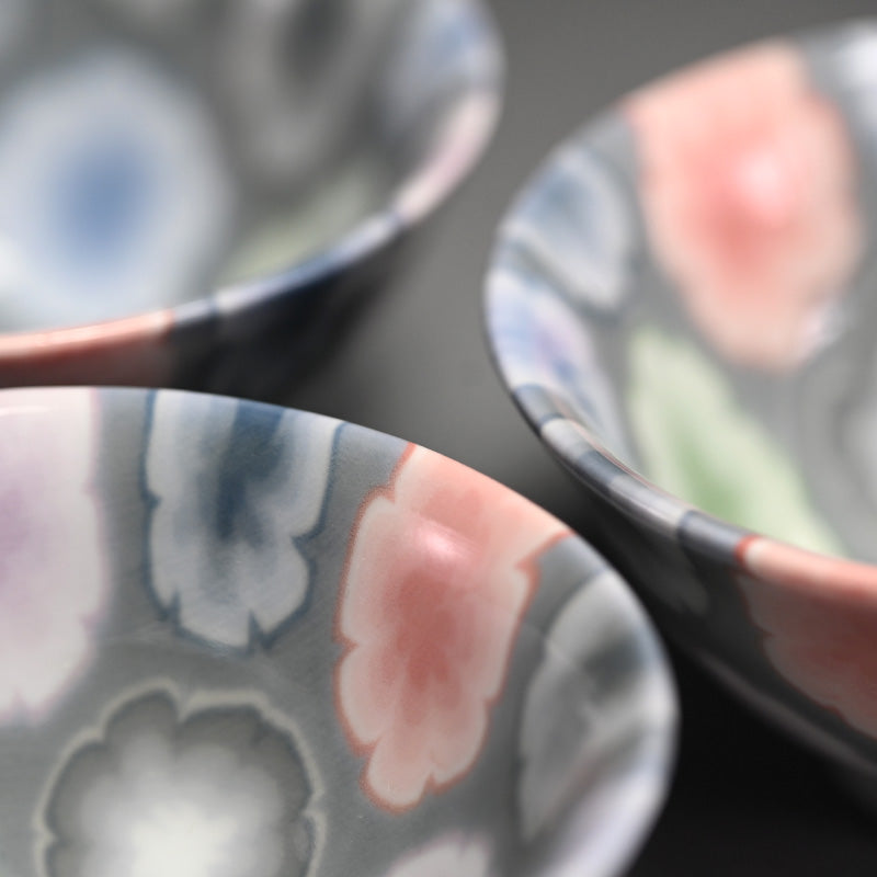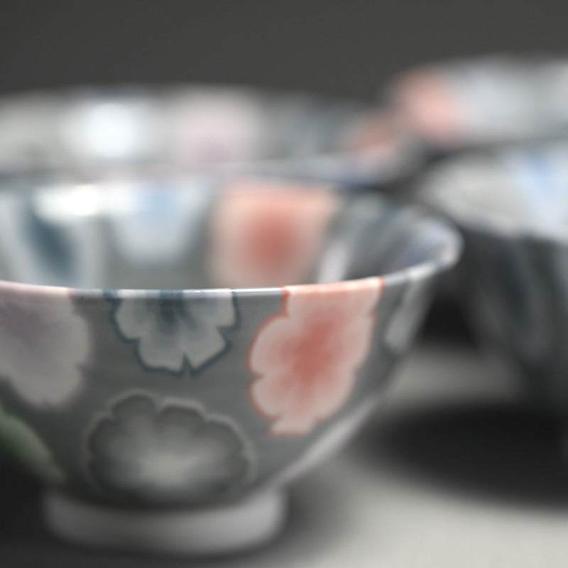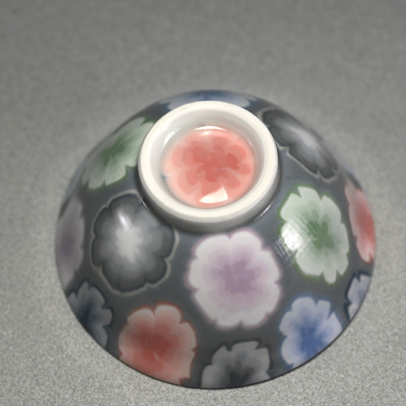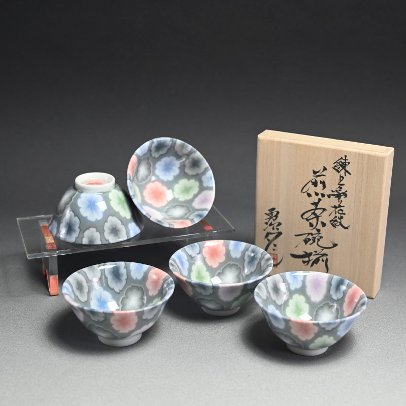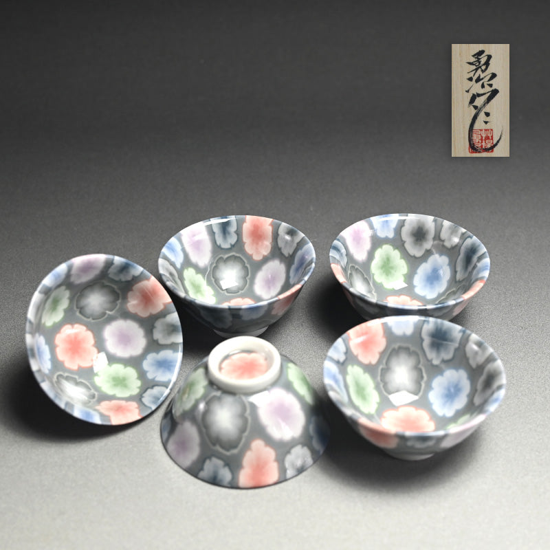 草場勇次 作、灰色の陶器にパステルカラーの粘土で花を描いた煎茶碗 5 客のセットです。オリジナルの署名入り木箱入り。「練り上げ彩り花紋 煎茶碗 揃」と題された箱入り。各サイズは直径約 9.3 cm、高さ 4.8 cmで、すべて良好な状態です。アーティストから直接譲り受けました。