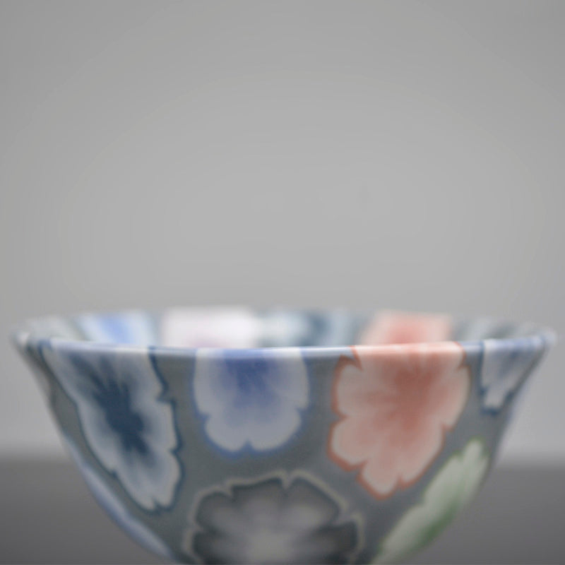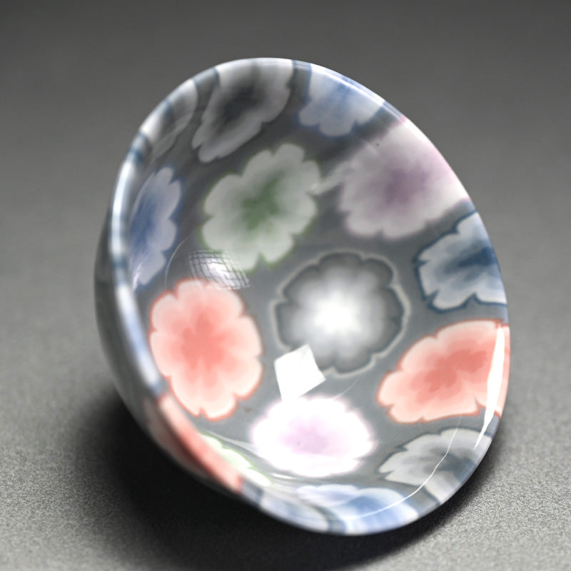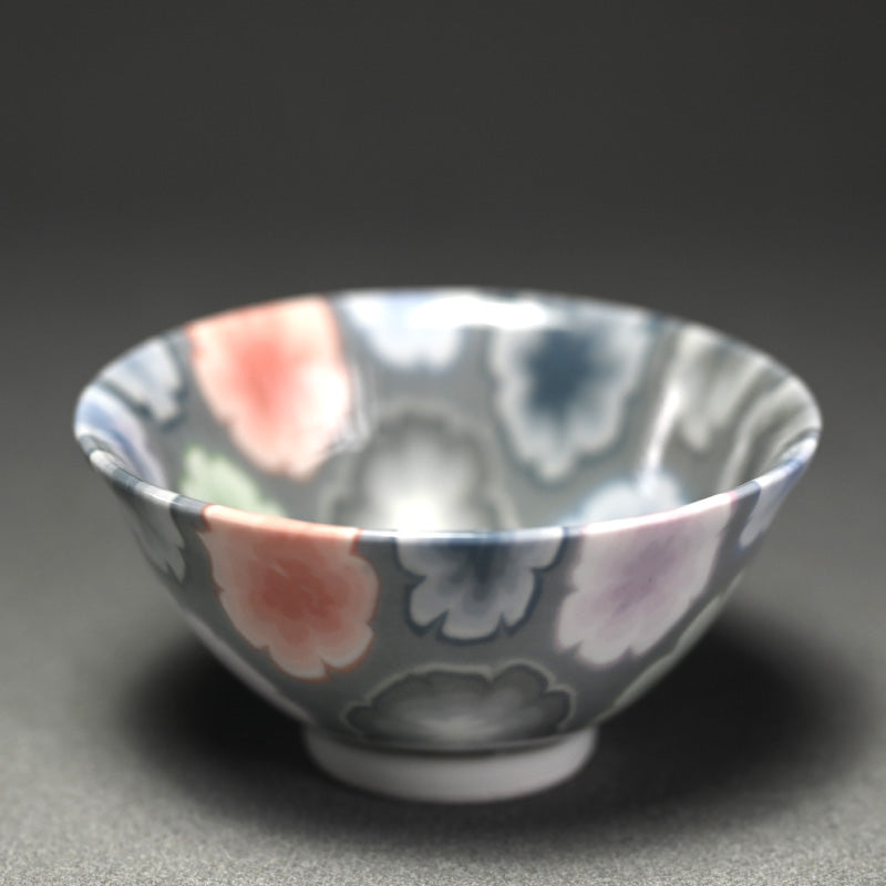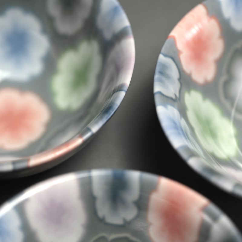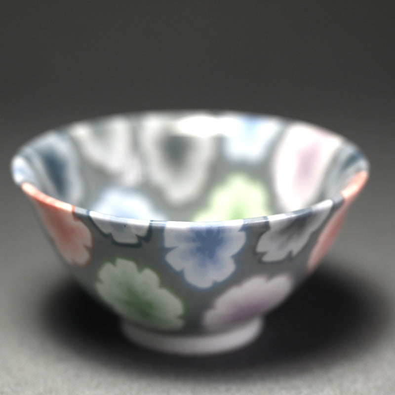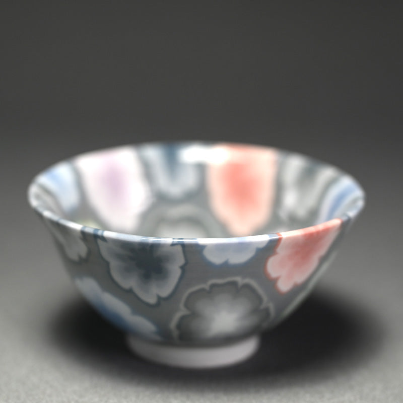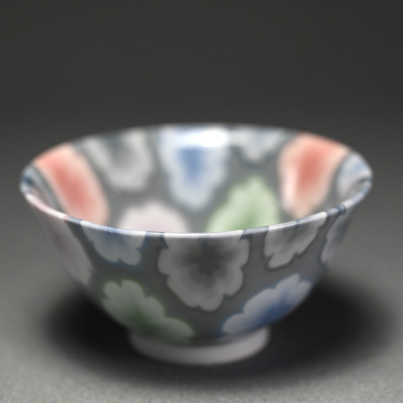 草場勇次 作、灰色の陶器にパステルカラーの粘土で花を描いた煎茶碗 5 客のセットです。オリジナルの署名入り木箱入り。「練り上げ彩り花紋 煎茶碗 揃」と題された箱入り。各サイズは直径約 9.3 cm、高さ 4.8 cmで、すべて良好な状態です。アーティストから直接譲り受けました。