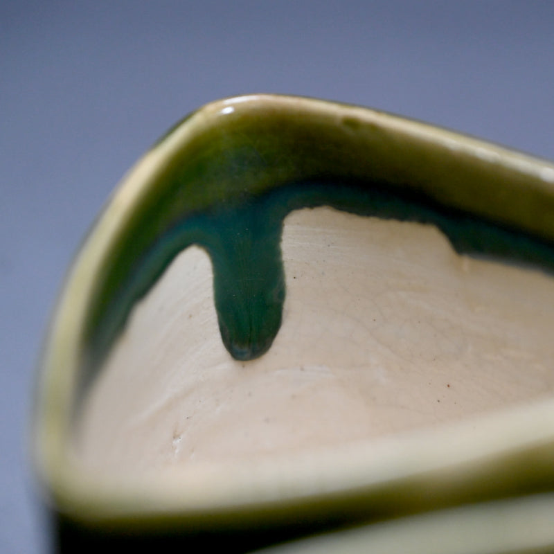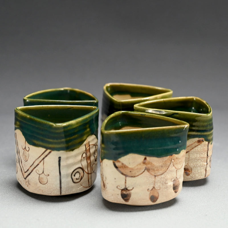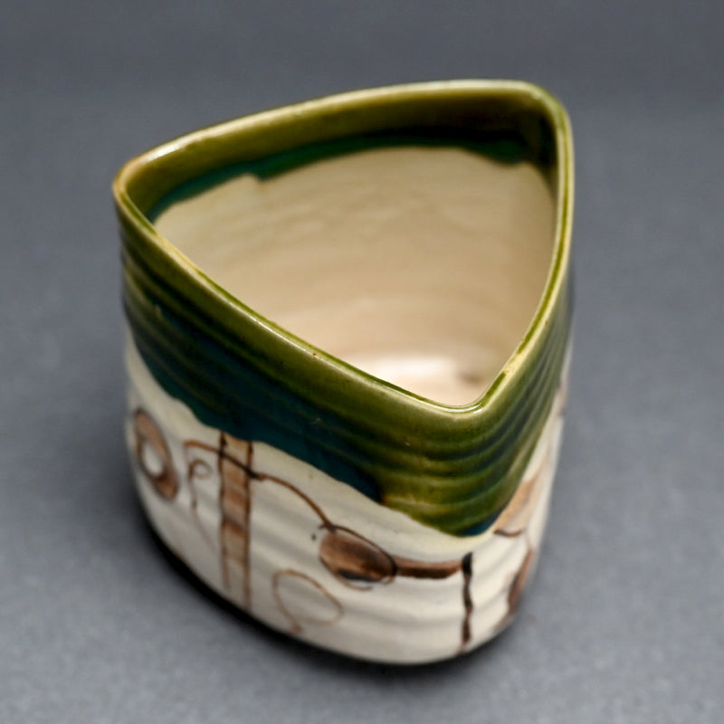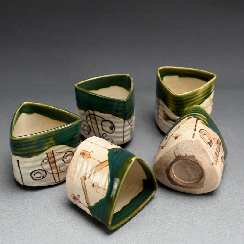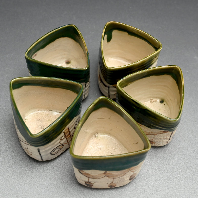 加藤作助による丸みのある三角形の織部向付皿5つセットが古い木箱に入っています。サイズは 9.5 x 9 x 9.5 cmで 全て良好な状態です。