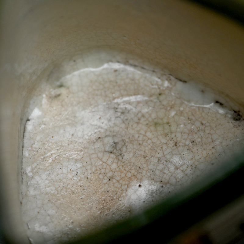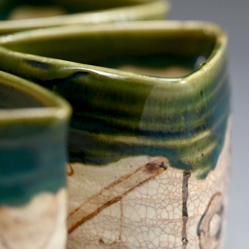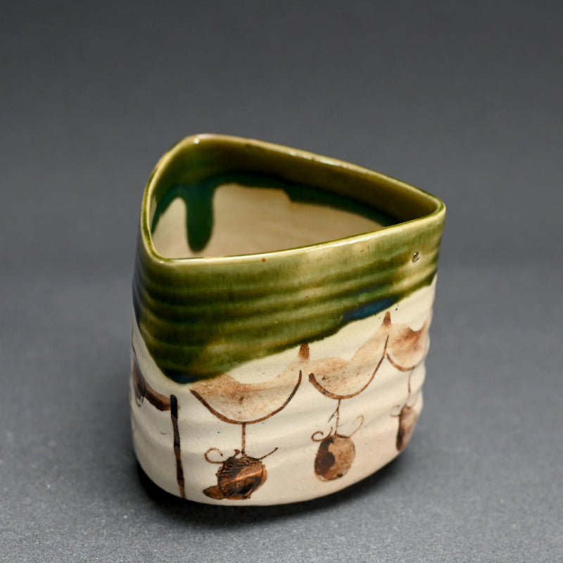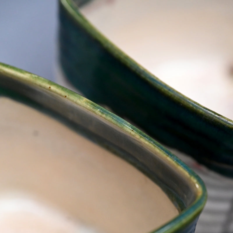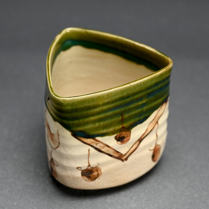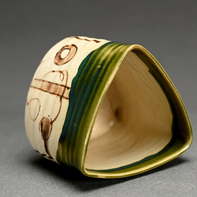 加藤作助による丸みのある三角形の織部向付皿5つセットが古い木箱に入っています。サイズは 9.5 x 9 x 9.5 cmで 全て良好な状態です。