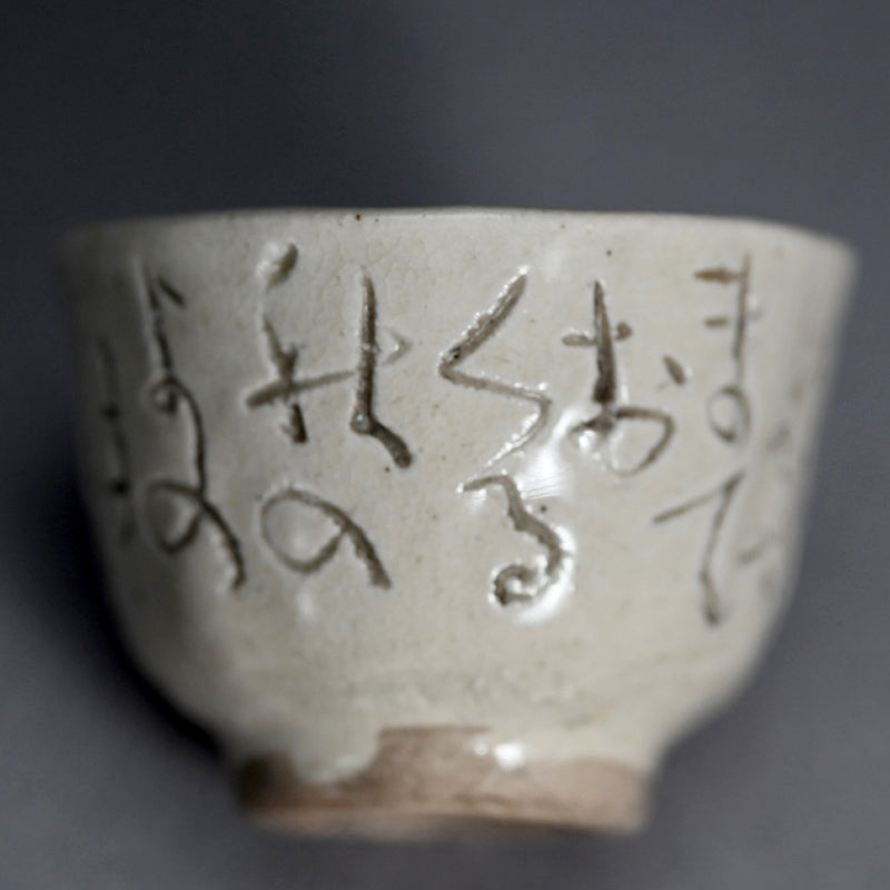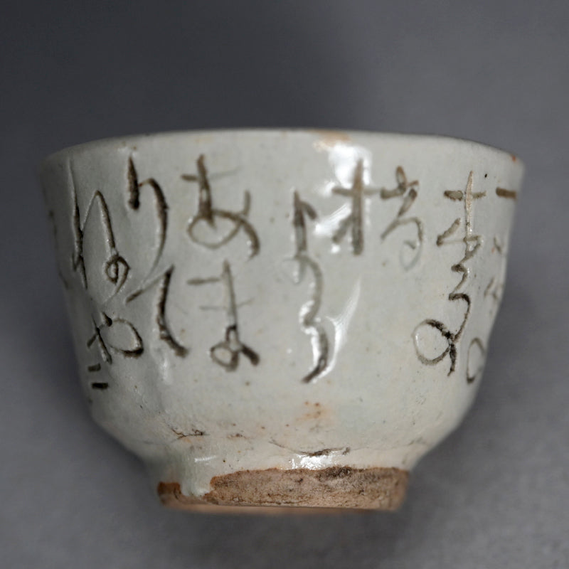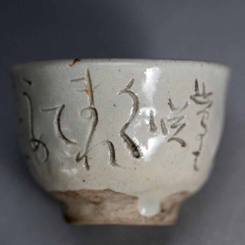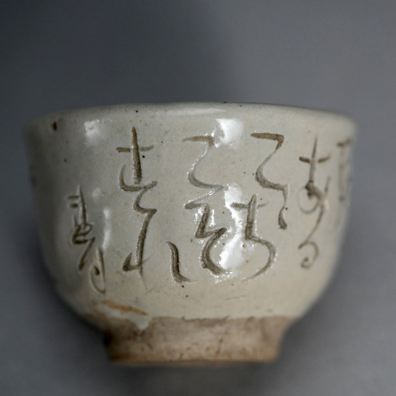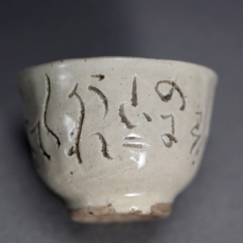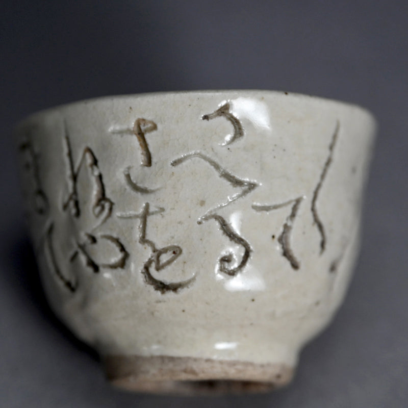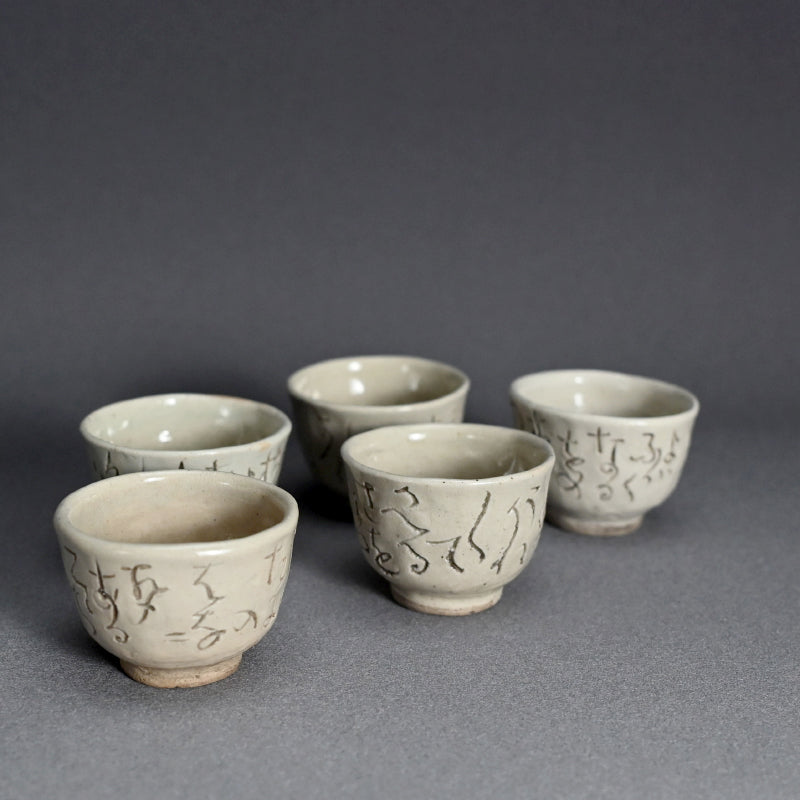 芸術家/尼僧の太田垣蓮月による詩が刻まれた、指でつまむタイプの煎茶碗5客セットです。シンプルに「ちやわん」と題された 署名入りの珍しいオリジナルの木箱に収められています。このセットのために特別に作られた箱は 片側が切り取られているため、小さく繊細なボウルを簡単に取り出せます。各カップの直径は6cm、高さは4.5cmで すべて良好な状態です。