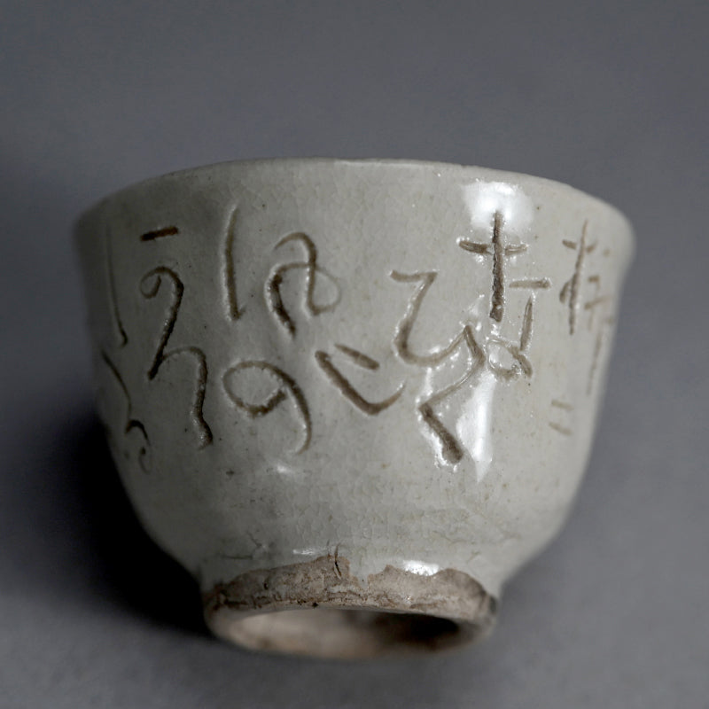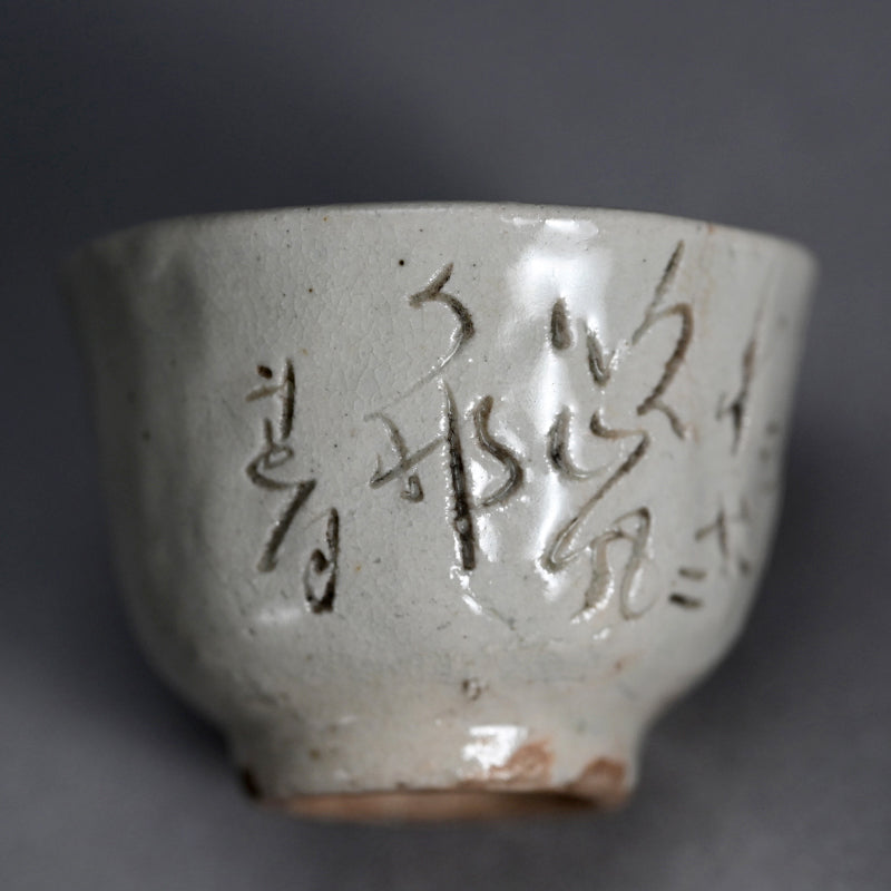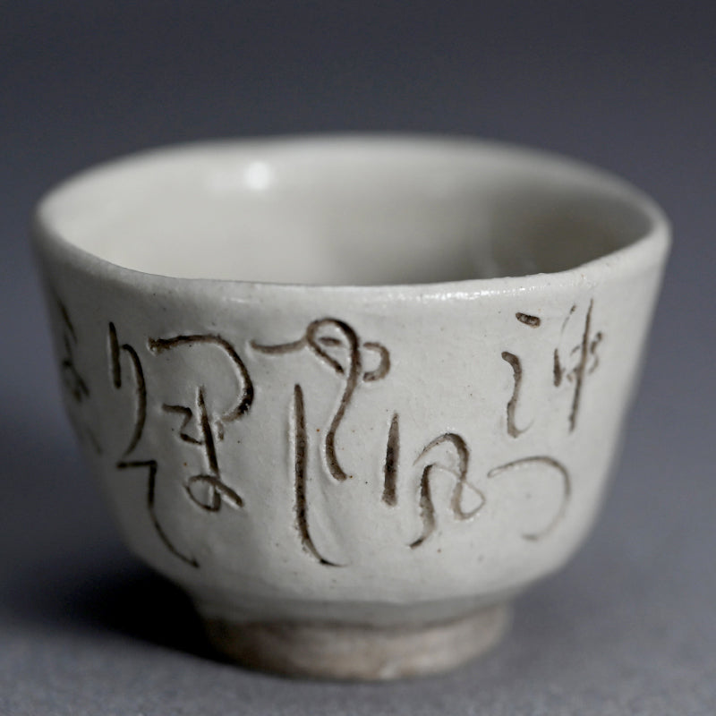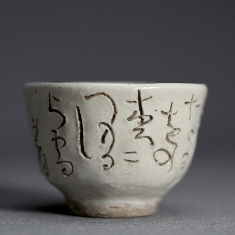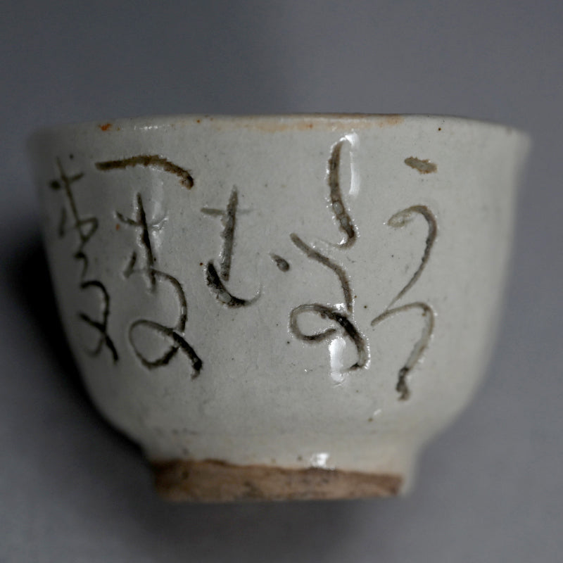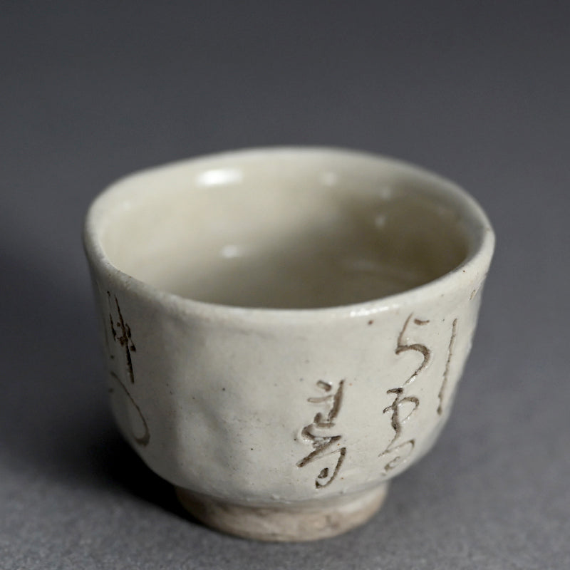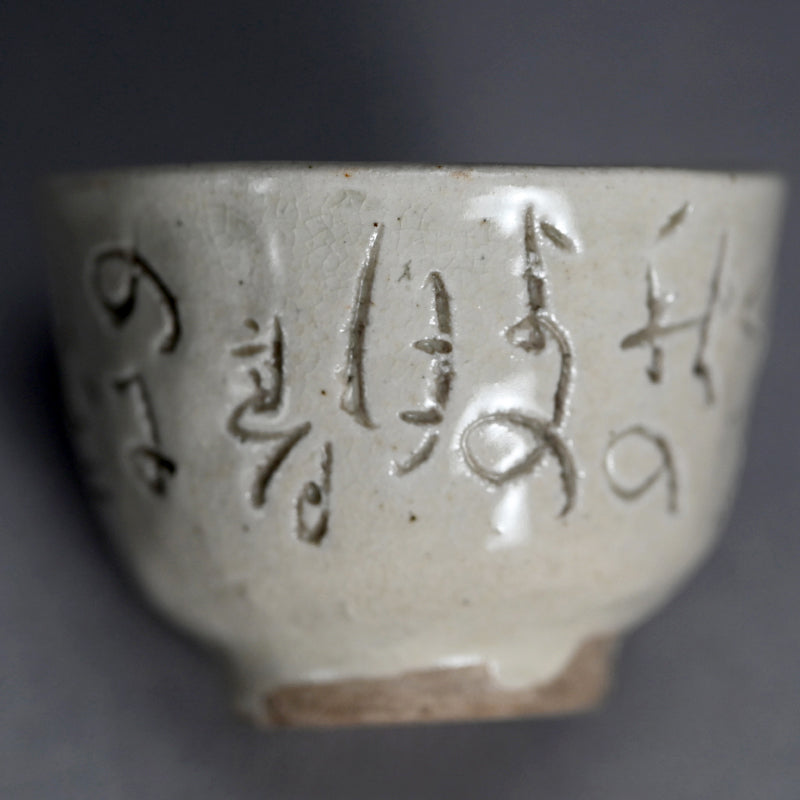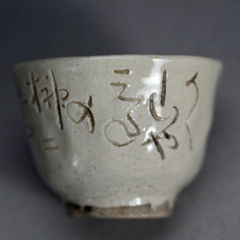 芸術家/尼僧の太田垣蓮月による詩が刻まれた、指でつまむタイプの煎茶碗5客セットです。シンプルに「ちやわん」と題された 署名入りの珍しいオリジナルの木箱に収められています。このセットのために特別に作られた箱は 片側が切り取られているため、小さく繊細なボウルを簡単に取り出せます。各カップの直径は6cm、高さは4.5cmで すべて良好な状態です。