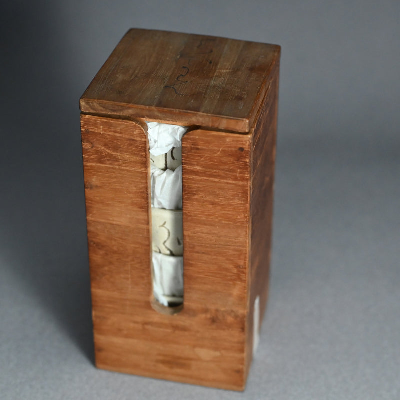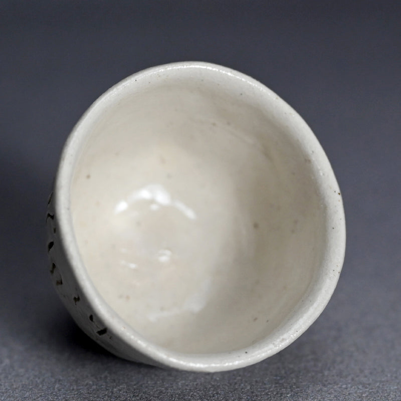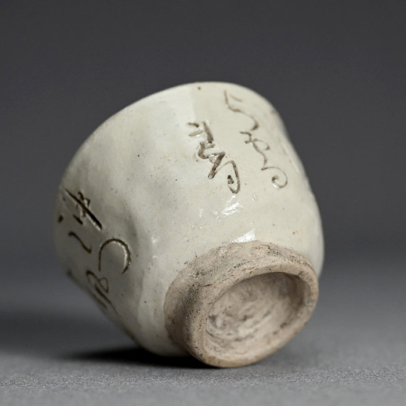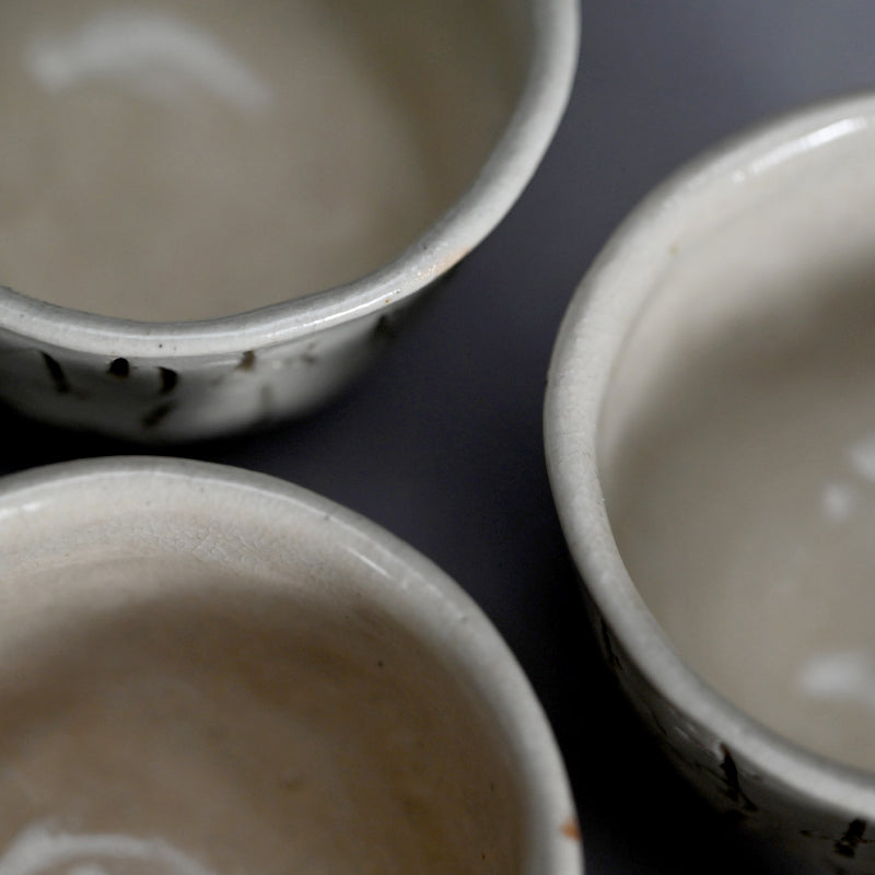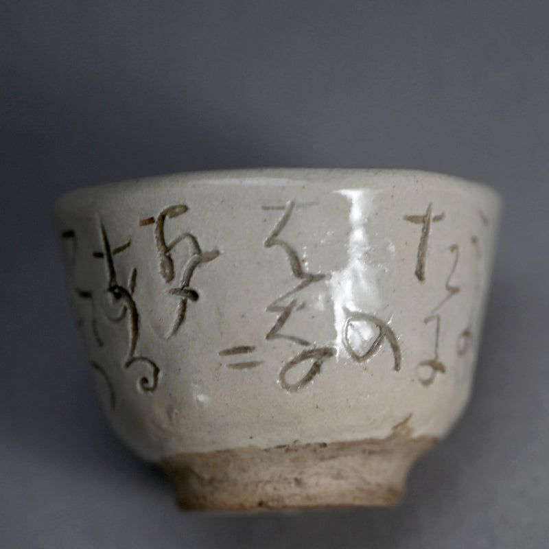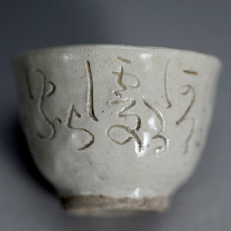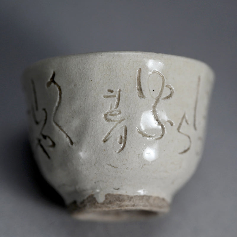 芸術家/尼僧の太田垣蓮月による詩が刻まれた、指でつまむタイプの煎茶碗5客セットです。シンプルに「ちやわん」と題された 署名入りの珍しいオリジナルの木箱に収められています。このセットのために特別に作られた箱は 片側が切り取られているため、小さく繊細なボウルを簡単に取り出せます。各カップの直径は6cm、高さは4.5cmで すべて良好な状態です。