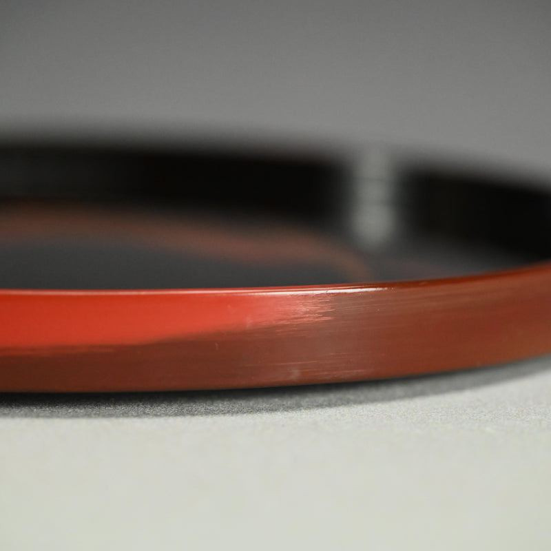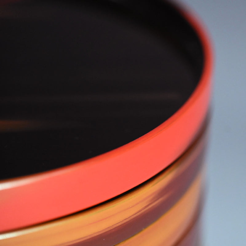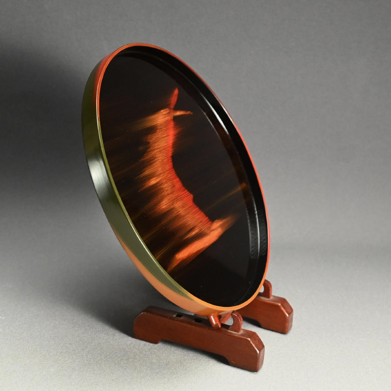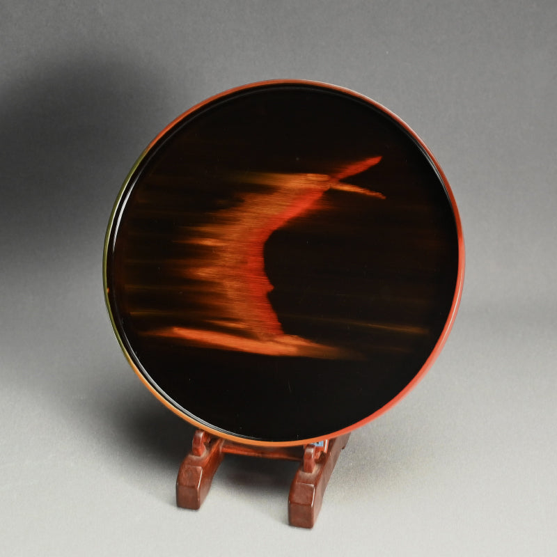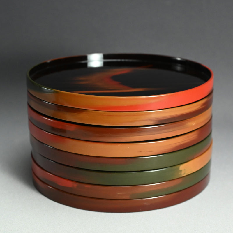縁が低い美しい丸盆8枚セットです。内側は黒漆で覆われ、赤と黄色の霧のような三日月が描かれています。まるで荒れ狂う曇り空に浮かぶ月のような模様です。縁の外側は、落ち着いた様々な色彩で彩られています。直径27.5cmで 全体的に良好な状態ですが、わずかな使用感があります。