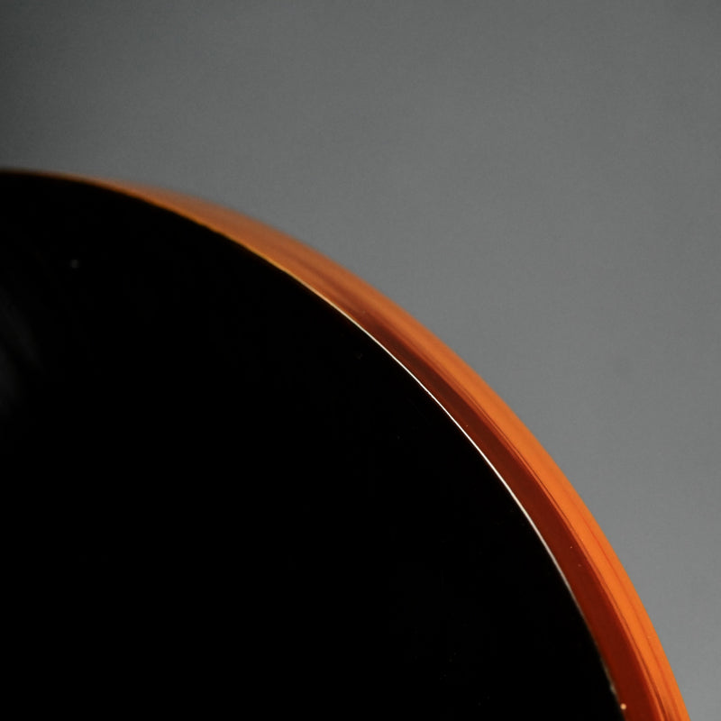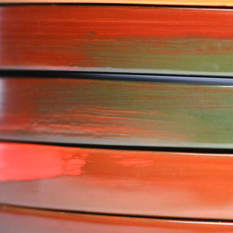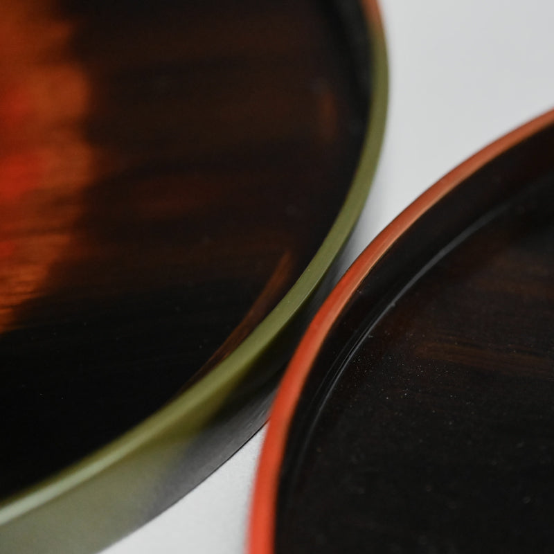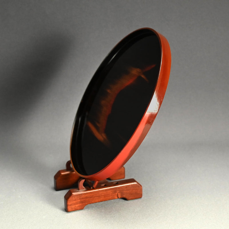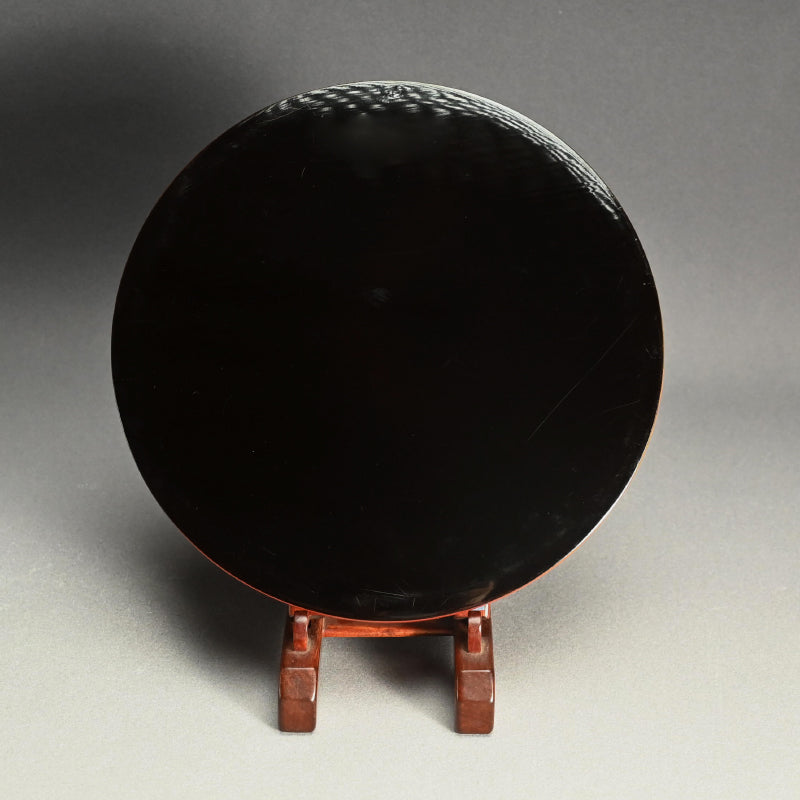 縁が低い美しい丸盆8枚セットです。内側は黒漆で覆われ、赤と黄色の霧のような三日月が描かれています。まるで荒れ狂う曇り空に浮かぶ月のような模様です。縁の外側は、落ち着いた様々な色彩で彩られています。直径27.5cmで 全体的に良好な状態ですが、わずかな使用感があります。