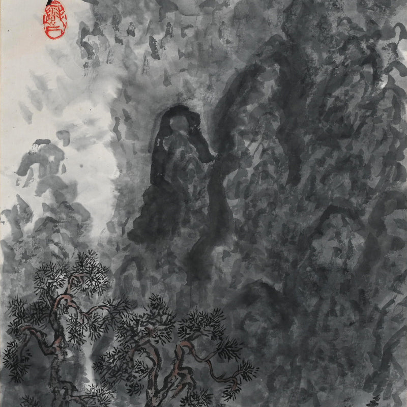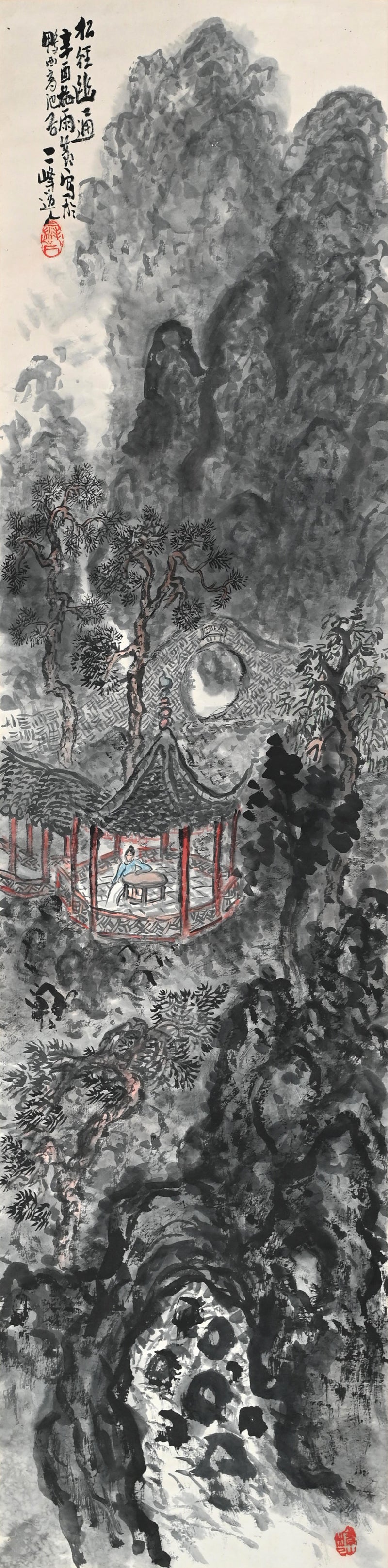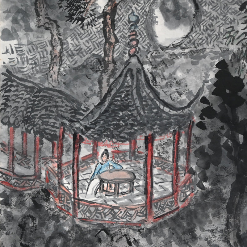 舞台は深い山間の峡谷。水墨画のような断崖が、まるで暗い雲のようにそびえ立っています。幾重にも重なる淡彩と質感豊かな筆致で描かれた、まだら模様の断崖は、漂う霧を通して半分だけ見える風景、つまり視覚と想像力が融合する異次元の世界のような印象を与えます。この陰影の深い地形の中に、老松が群生しています。幹は温かみのある赤褐色で、針葉樹の枝は黒く鮮やかに浮かび上がっています。これらの「松並木」、つまり「松景」は、構図の垂直構造を形成し、絵画のタイトルにもなっています。松並木は、自然界の秘められた共鳴(ユツ)を感じ取るための揺るぎない存在です。ねじれた枝は、月明かりに照らされた遠くの崖の開口部を縁取り、精神と風景が繊細に交わる宇宙的な通路を示唆しています。木々に囲まれた、赤漆塗りの東屋が山の斜面に佇み、リズミカルな柱と模様のある欄干が、周囲の単色の墨と鮮やかなコントラストを織りなしている。中には、青と白の柔らかな色調のローブをまとった人物が一人、円形のテーブルに寄りかかり、物思いにふけっている。彼女は読書でも執筆でもなく、ただそこに存在し、自然との自然な一体感という文人の理想を体現している。東屋は開放的な設計で、自然が空間を貫いている。月光が床を照らし、松の木々が周囲を囲み、人物は岩や木々と同様に風景の一部となっている。下には、尖った石や洞窟のような裂け目が、深みのある墨の渦巻く筆致で下方に伸び、構図に地盤をつくり、劇的な奥行き感を与えている。この場面全体は、学者の心と自然界は沈黙の中で一致するという道教の影響を受けた考えを伝えています。つまり、松や崖、月は、じっと座って耳を傾ける人にのみ、その内なる真実を明らかにするということです。