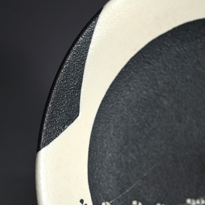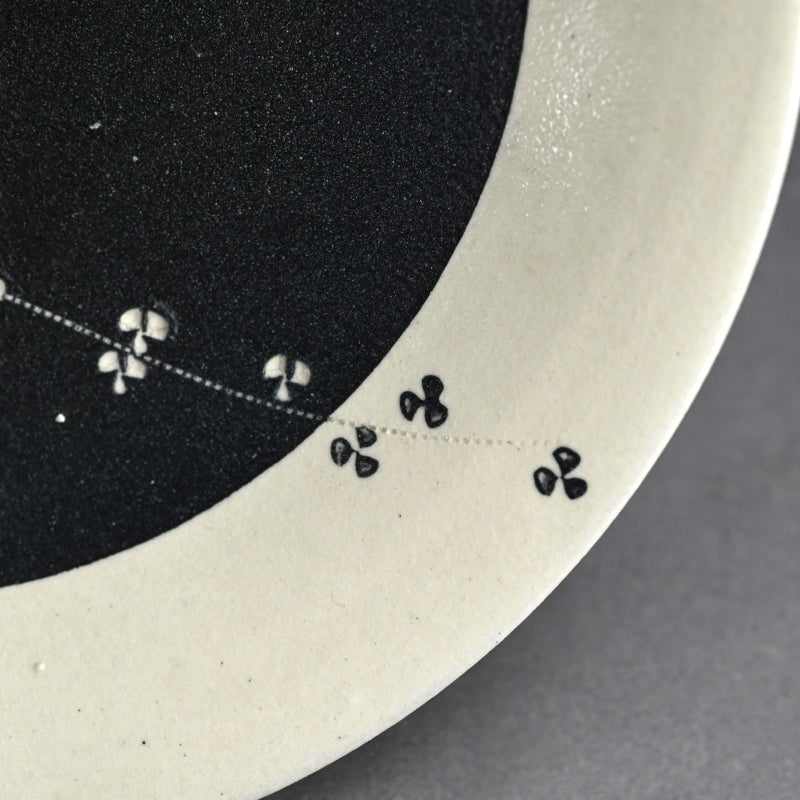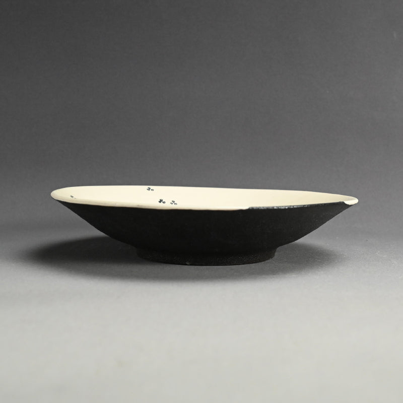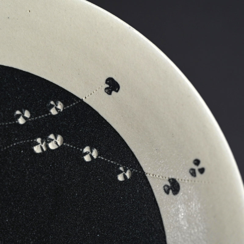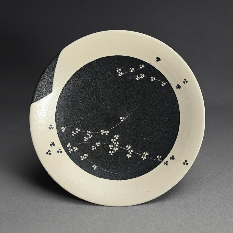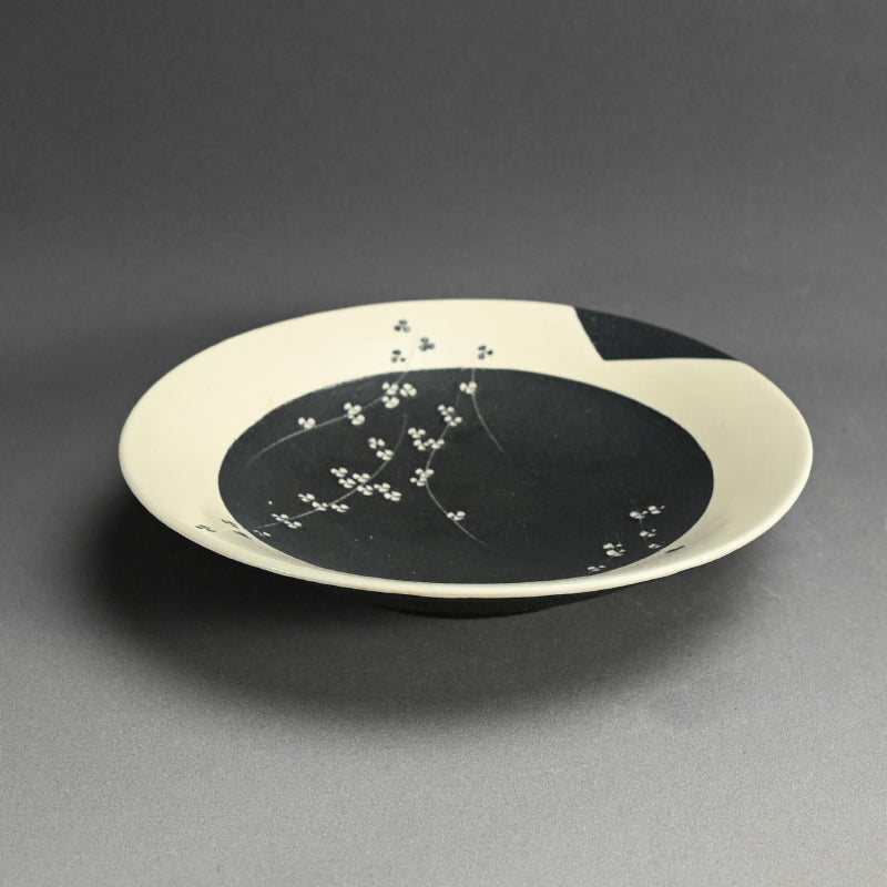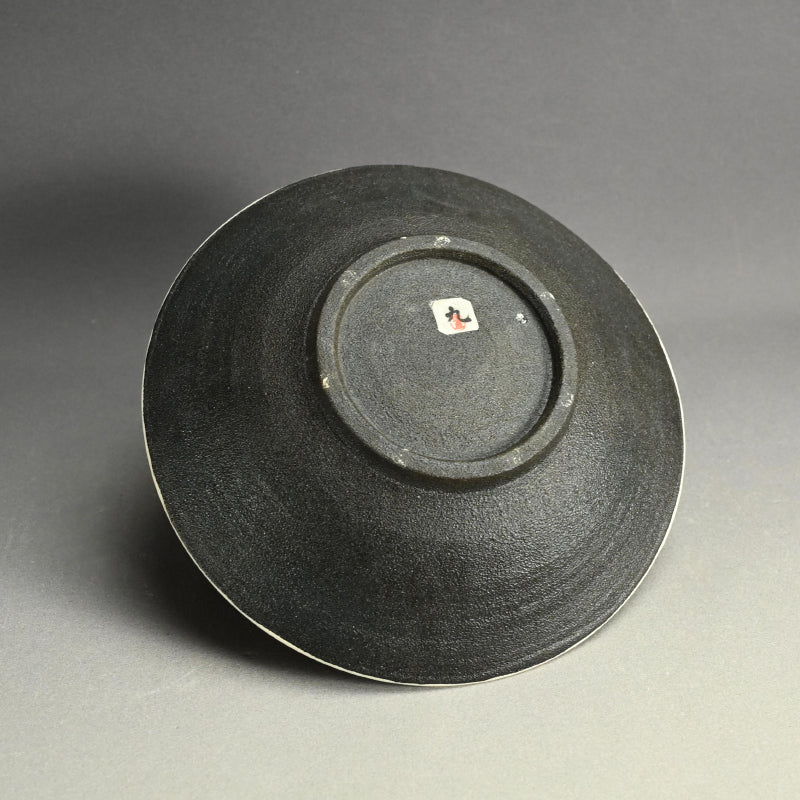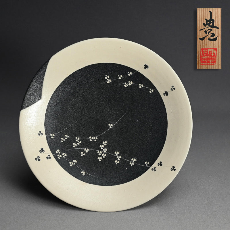 近藤豊作のこの優美な盆は、中央に黒い月を配し、その前に花が咲き誇る格子模様の蔓を描いています。「Funka-sara」と銘打たれたオリジナルの木箱に収められています。「Funka」は、この作家の最も人気のあるシリーズであることは間違いありません。直径32cm(13インチ)、高さ6cm(2 1/4インチ)で、状態は良好です。