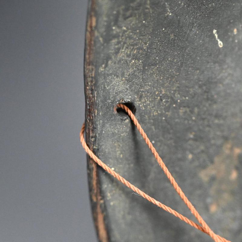 鎌倉時代から室町時代にかけて制作された烏天狗の鬼面です。赤と黒の多彩色で覆われた木彫りで、奇抜な顔立ちと巻き毛が描かれています。鳥のような嘴を持つ天狗のこの面は、眉を寄せ目を大きく突き出し鼻は大きく、12世紀から14世紀にかけて制作されました。背面のノミ跡を含む全体的な彫刻様式と色彩は、この年代と一致しており、下を向き瞳孔が密集している点は、この初期の時代の特徴です。面の寸法は21.5 x 14.5 x 8 cmで、破損していたため顔の左側に再接着されています。古い桐箱に入っています。