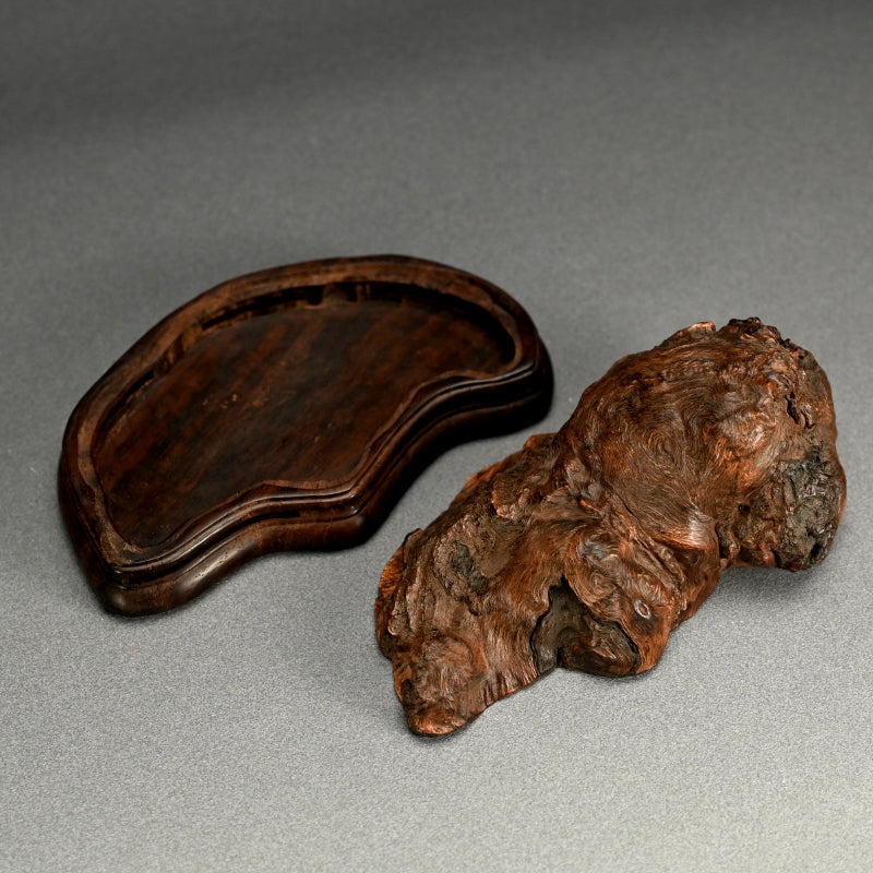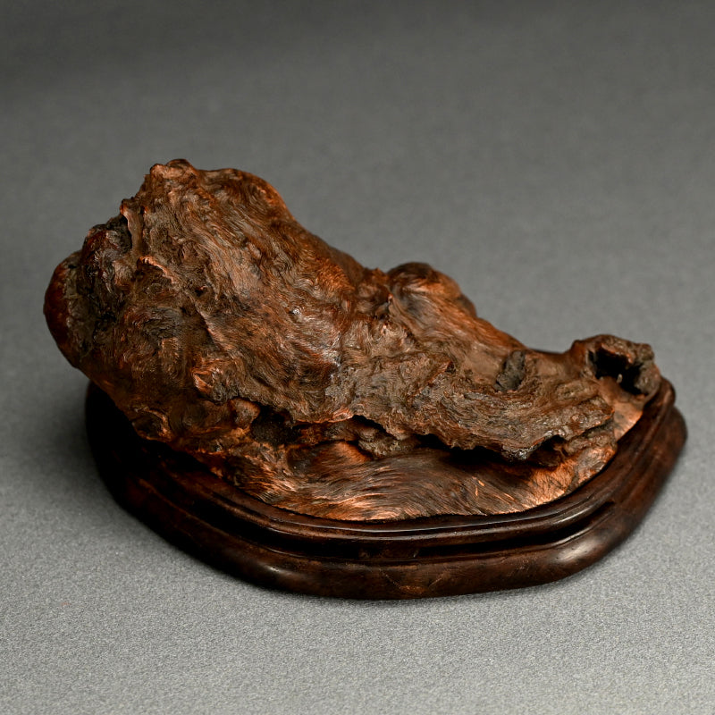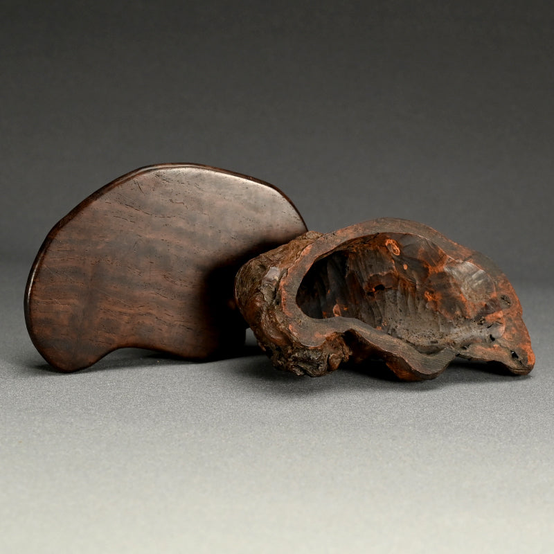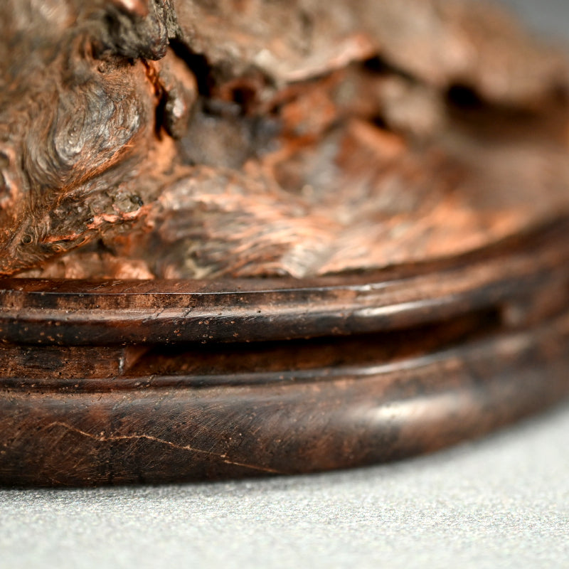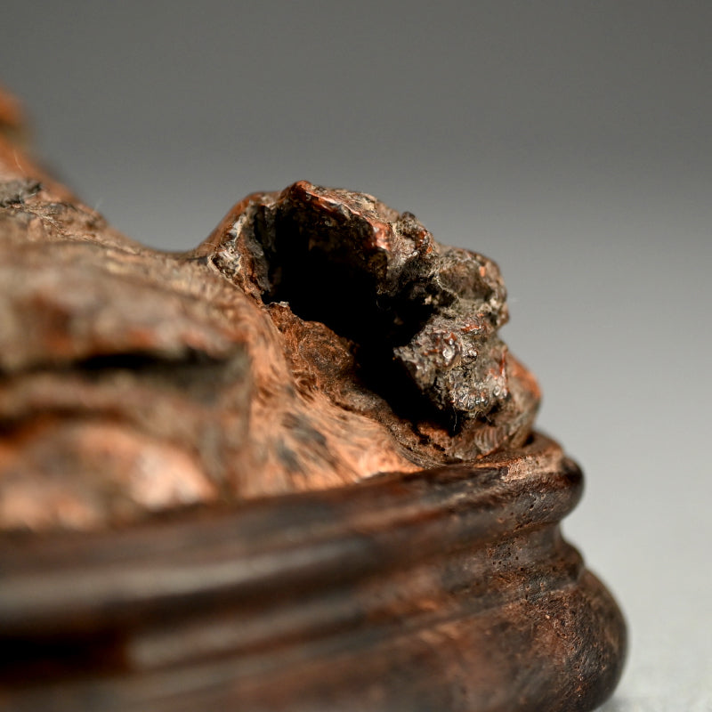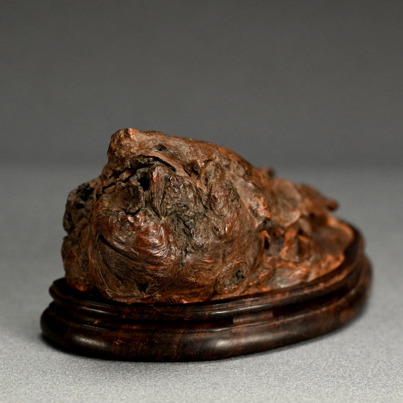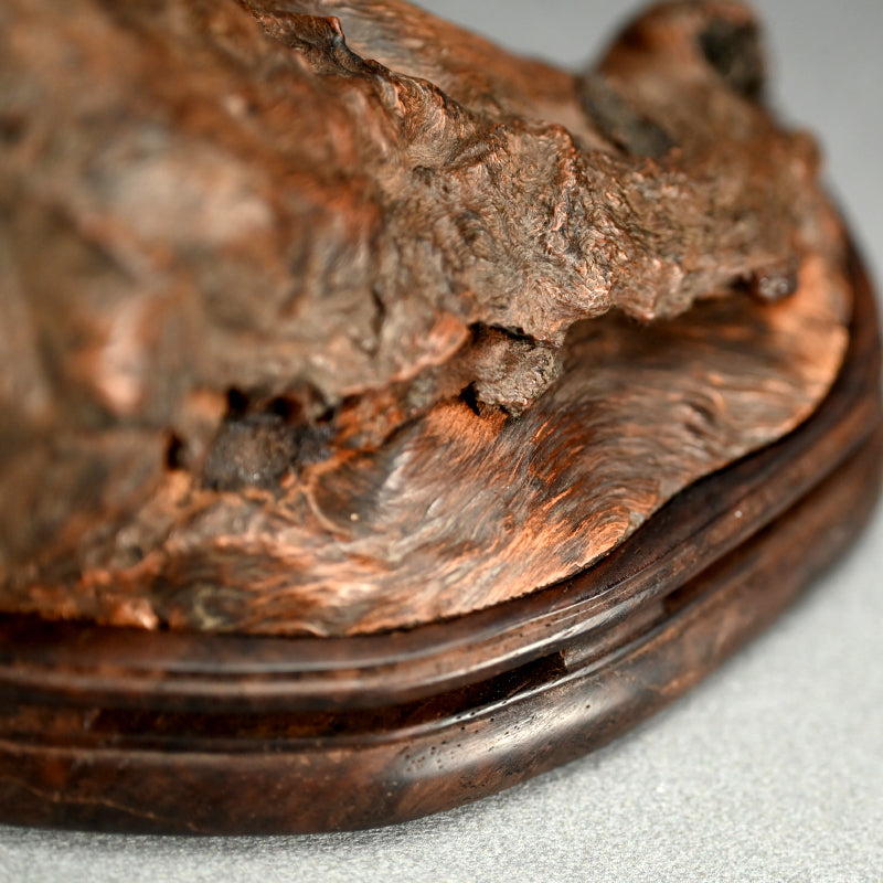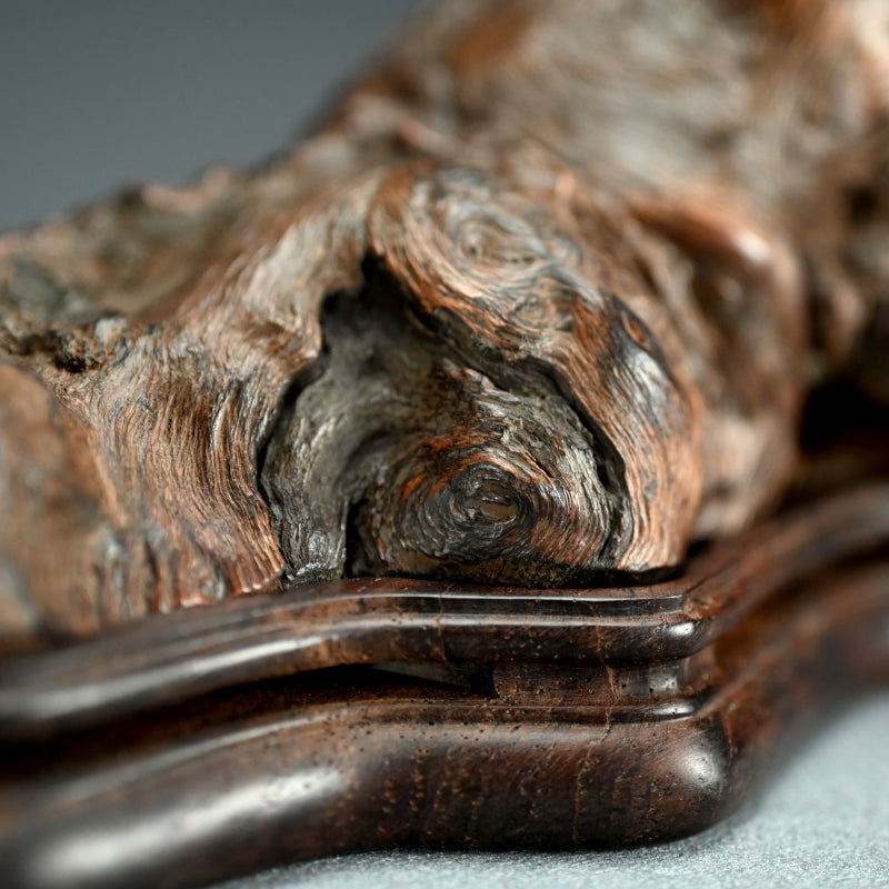 19世紀から 20世紀初頭の、学者に高く評価された方法でくり抜かれた木の節で作られた置香炉です。美しくエキゾチックなダークウッドの台にセットされています。内部の金属の台に置かれた香炉で燃やされた香の煙は、煙突の高い部分の穴から、そして底部の周囲へと流れ出て、まるで霧の中に見える山のようです。サイズは 17 x 10.5 x 9 cmで、全体的に良好な状態です。