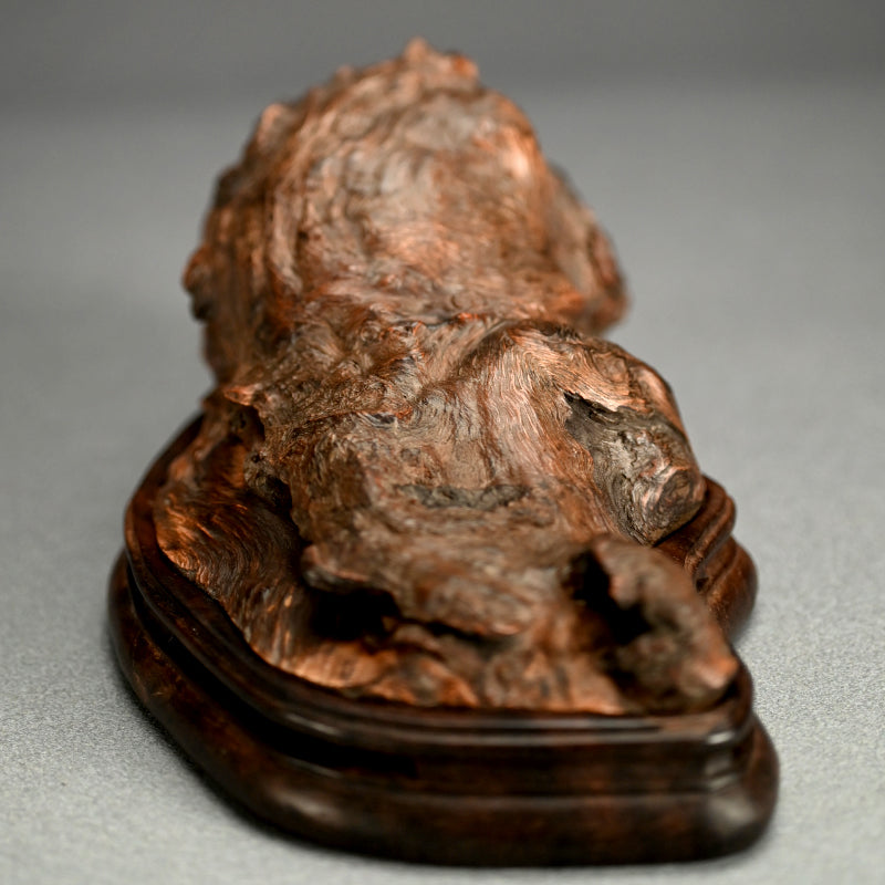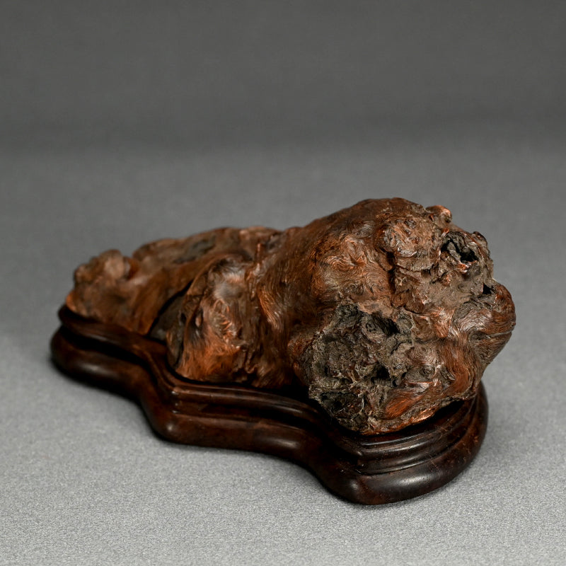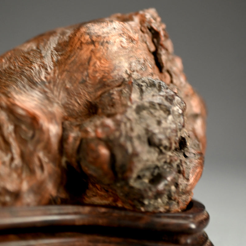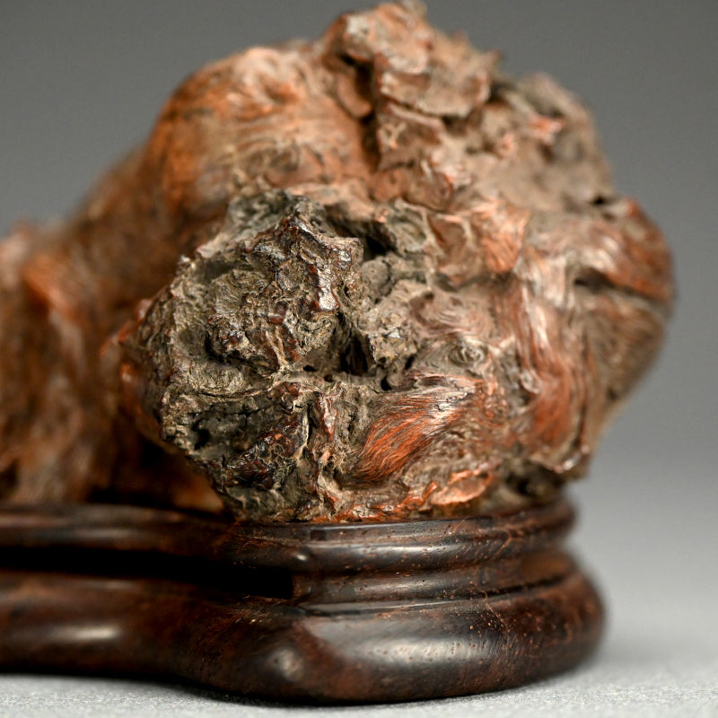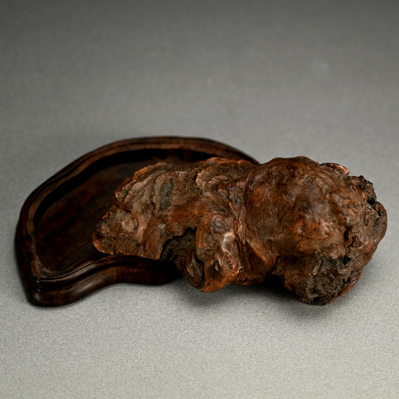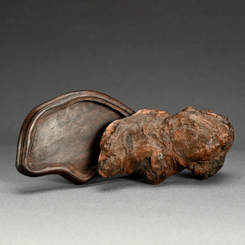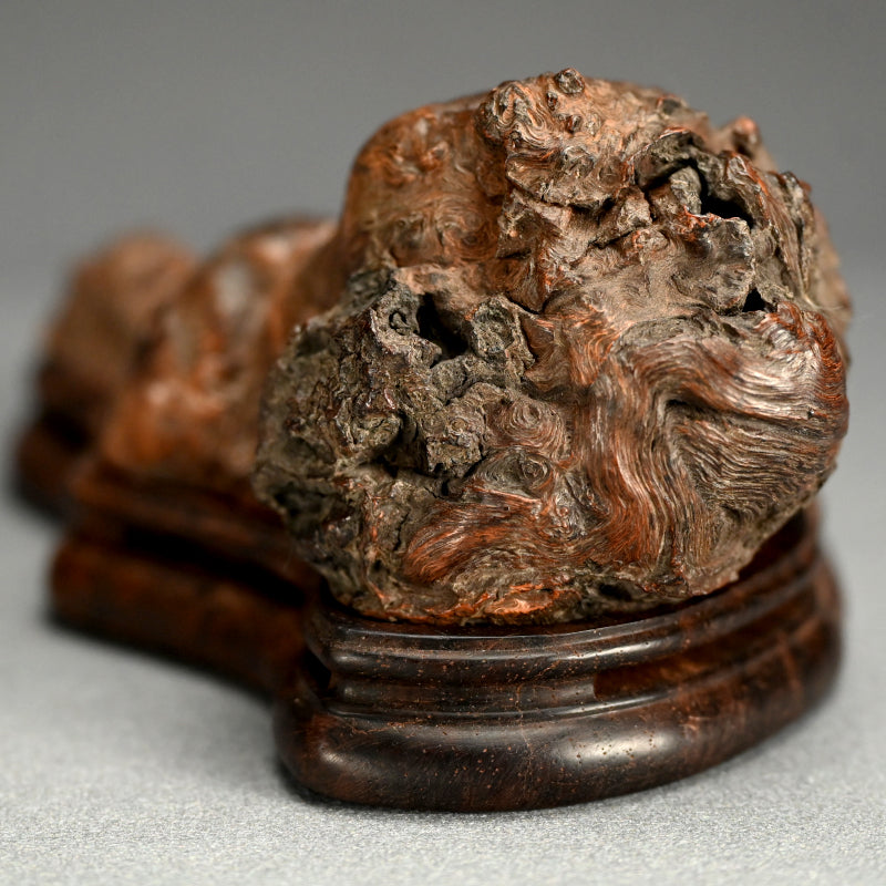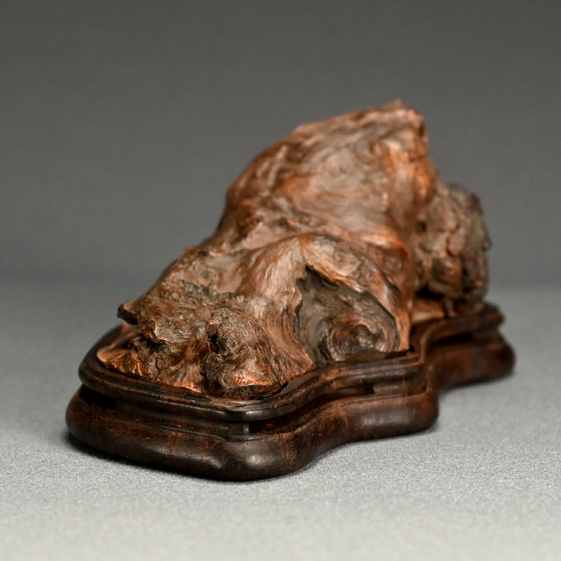 19世紀から 20世紀初頭の、学者に高く評価された方法でくり抜かれた木の節で作られた置香炉です。美しくエキゾチックなダークウッドの台にセットされています。内部の金属の台に置かれた香炉で燃やされた香の煙は、煙突の高い部分の穴から、そして底部の周囲へと流れ出て、まるで霧の中に見える山のようです。サイズは 17 x 10.5 x 9 cmで、全体的に良好な状態です。
