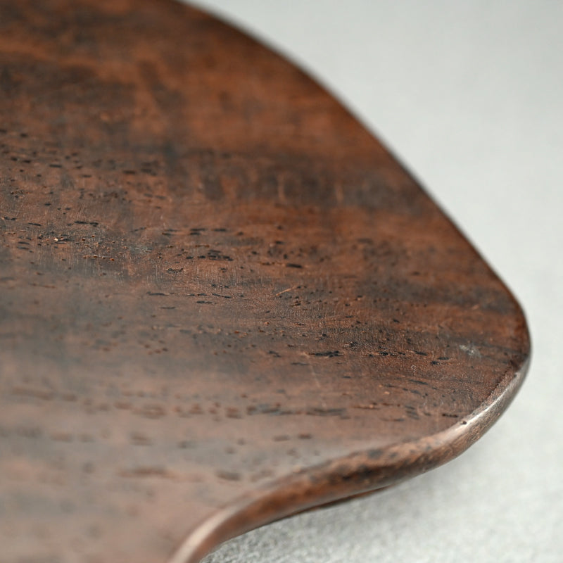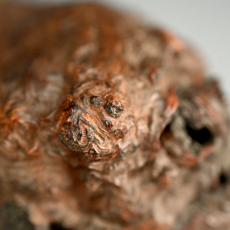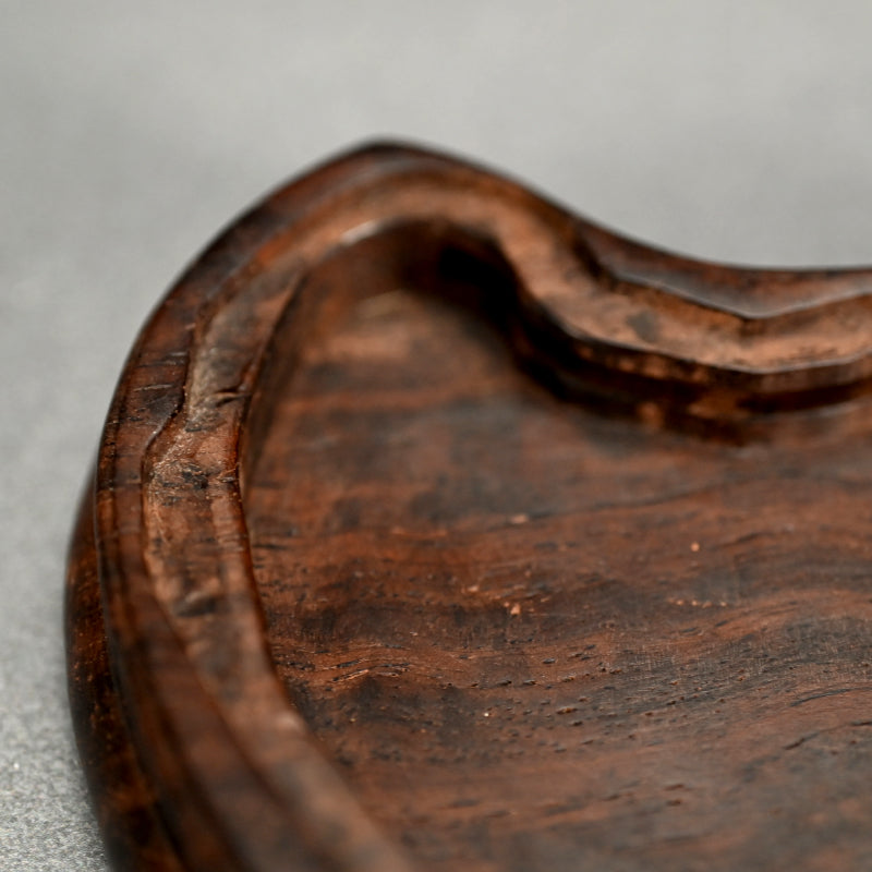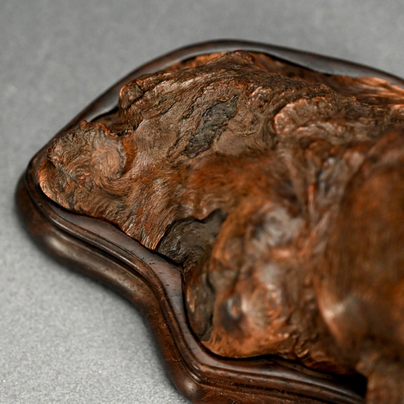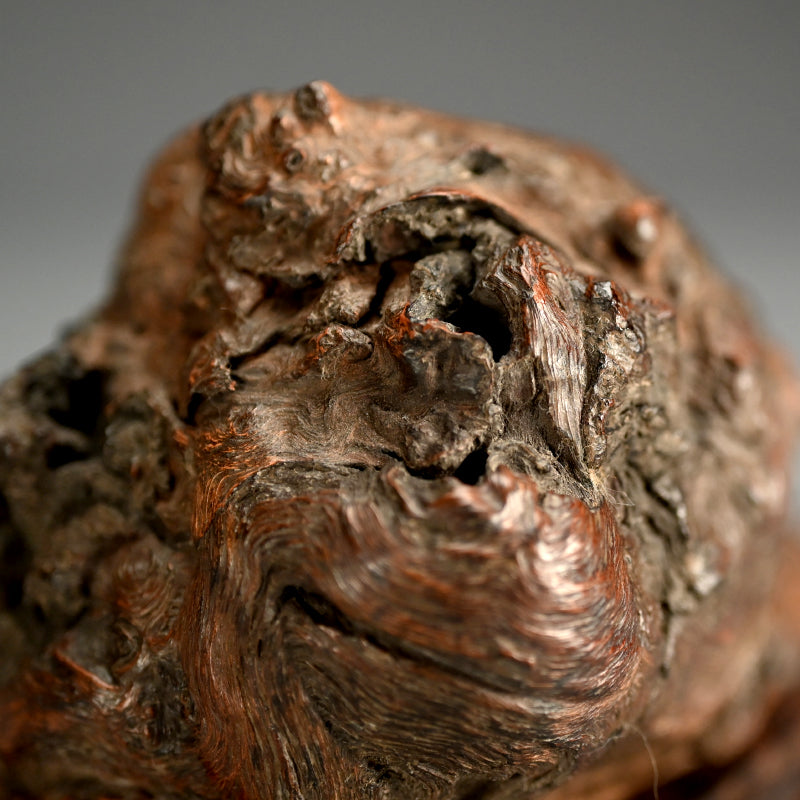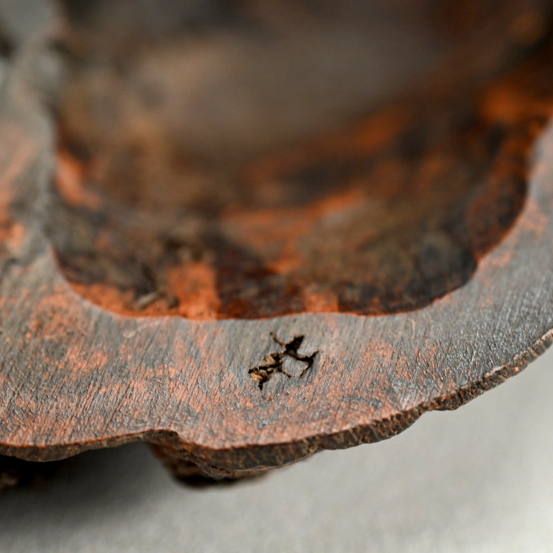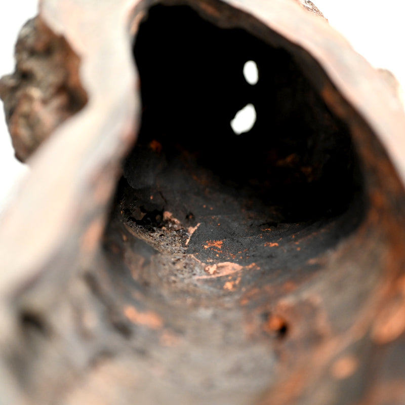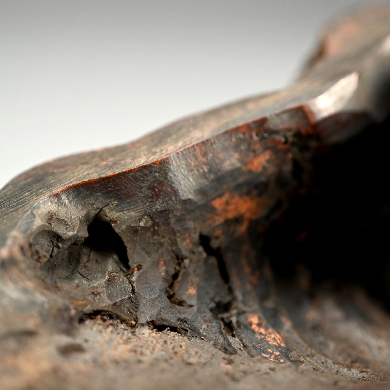 19世紀から 20世紀初頭の、学者に高く評価された方法でくり抜かれた木の節で作られた置香炉です。美しくエキゾチックなダークウッドの台にセットされています。内部の金属の台に置かれた香炉で燃やされた香の煙は、煙突の高い部分の穴から、そして底部の周囲へと流れ出て、まるで霧の中に見える山のようです。サイズは 17 x 10.5 x 9 cmで、全体的に良好な状態です。