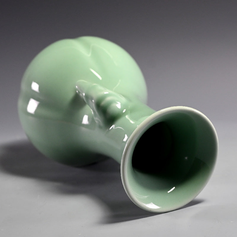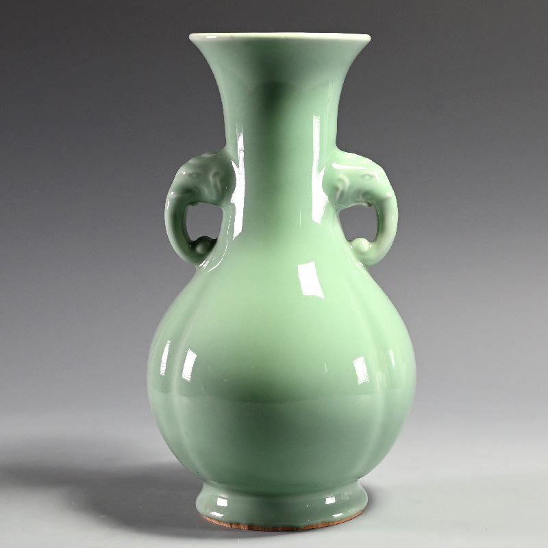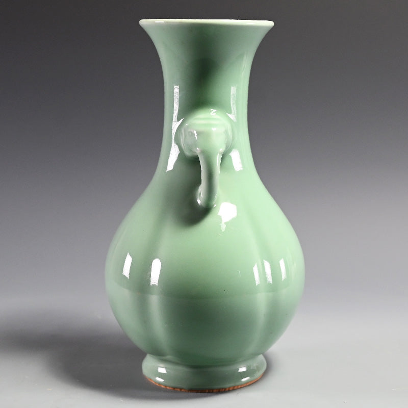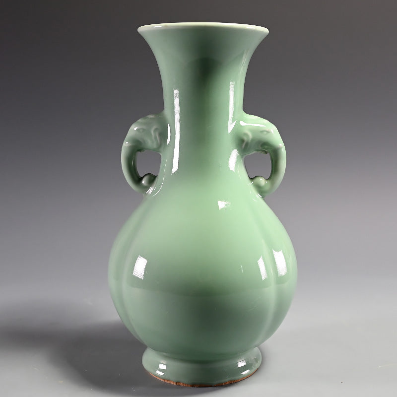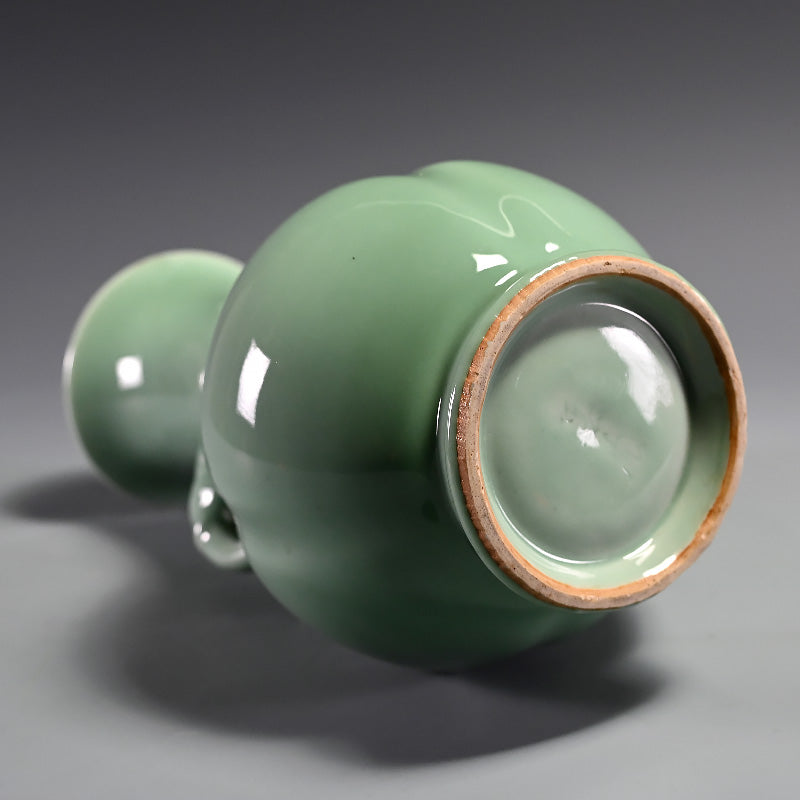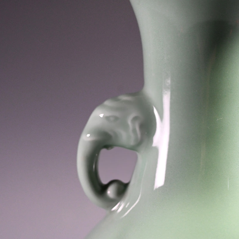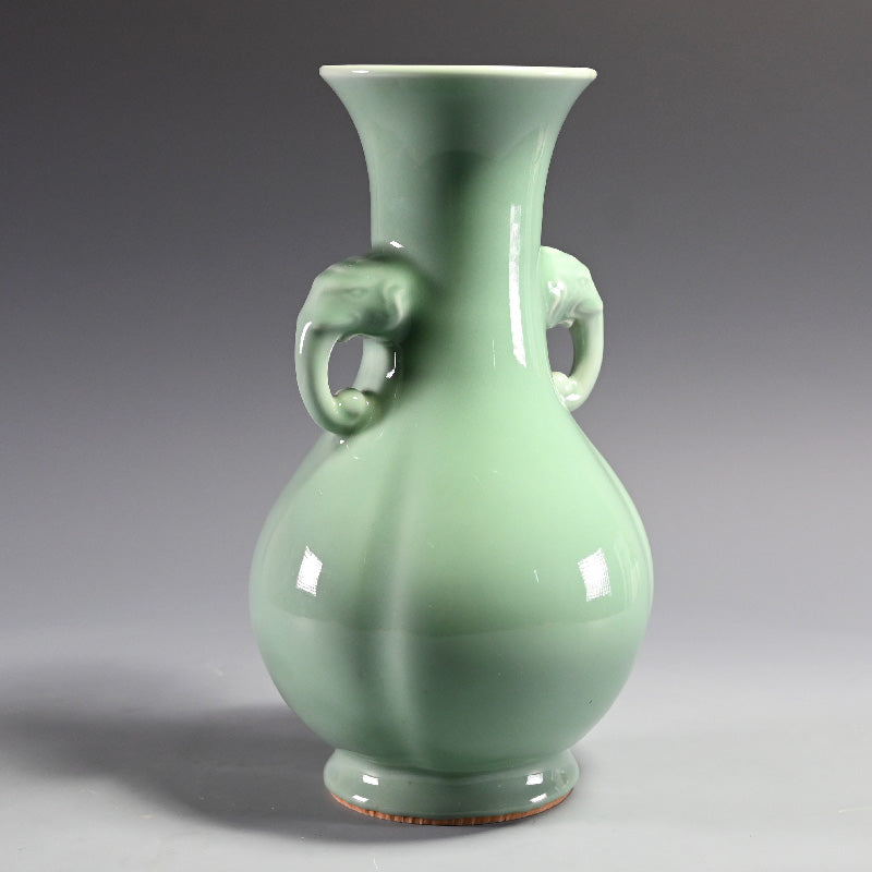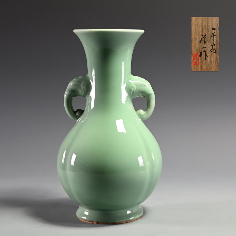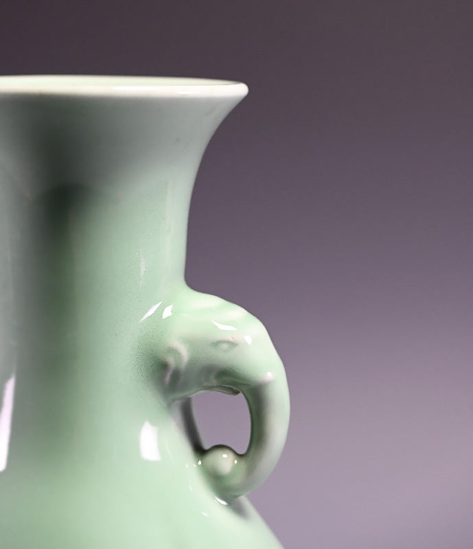 Antique Celadon Vase with Elephant Handles ー加藤 渓山 "砧青磁象耳木瓜胴形花瓶"