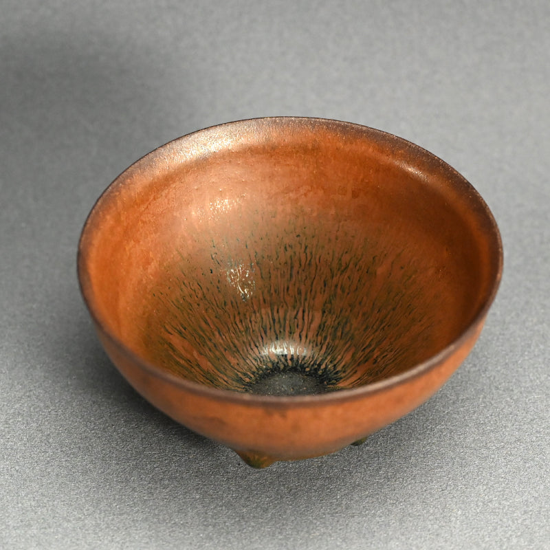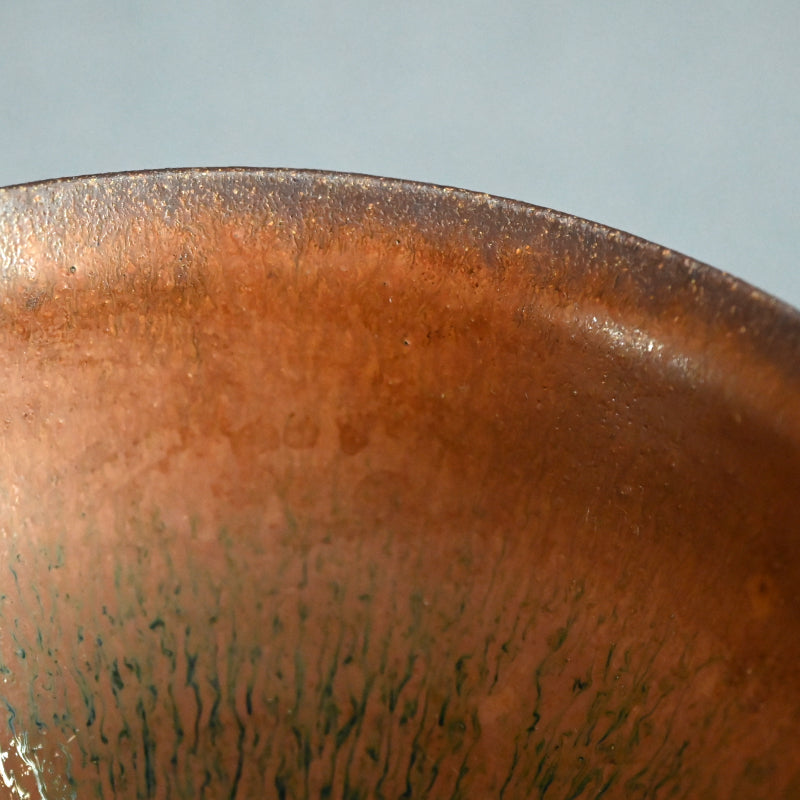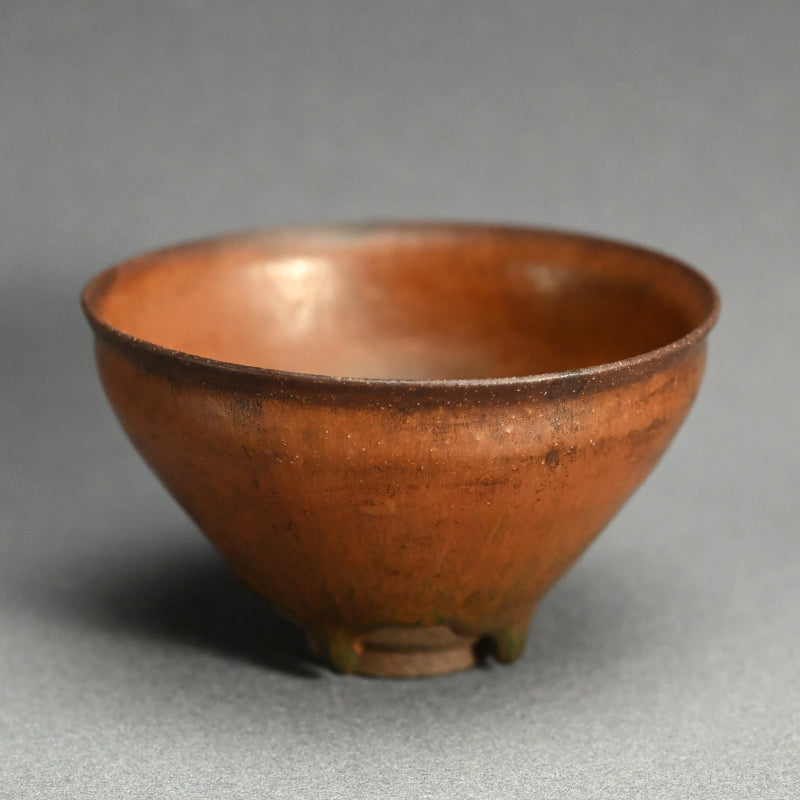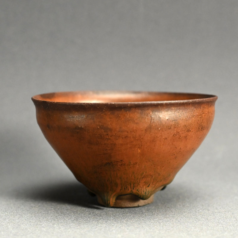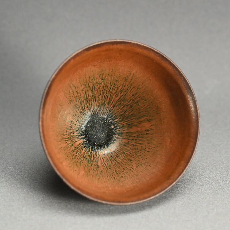 中国の天目茶碗は、日本の古典的な茶文化において重要な位置を占めています。もともと宋王朝(960~1279年)に中国の寺院から輸入されたこれらの茶碗は、そのシンプルで洗練された形と 縞模様や斑点、鏡のような黒仕上げを特徴とするダイナミックな釉薬で賞賛されました。その暗く光沢のある表面は、明るい緑色の抹茶との視覚的なコントラストを高め、印象的な視覚的調和を生み出しました。これらの茶碗は日本の茶陶の進化に影響を与え、新しい釉薬や形を刺激し、戦国時代を通じて高く評価されました。