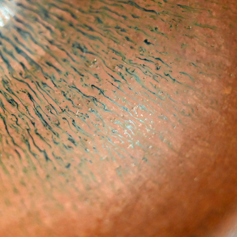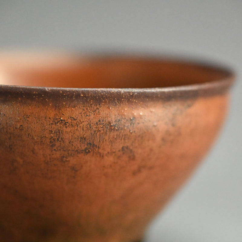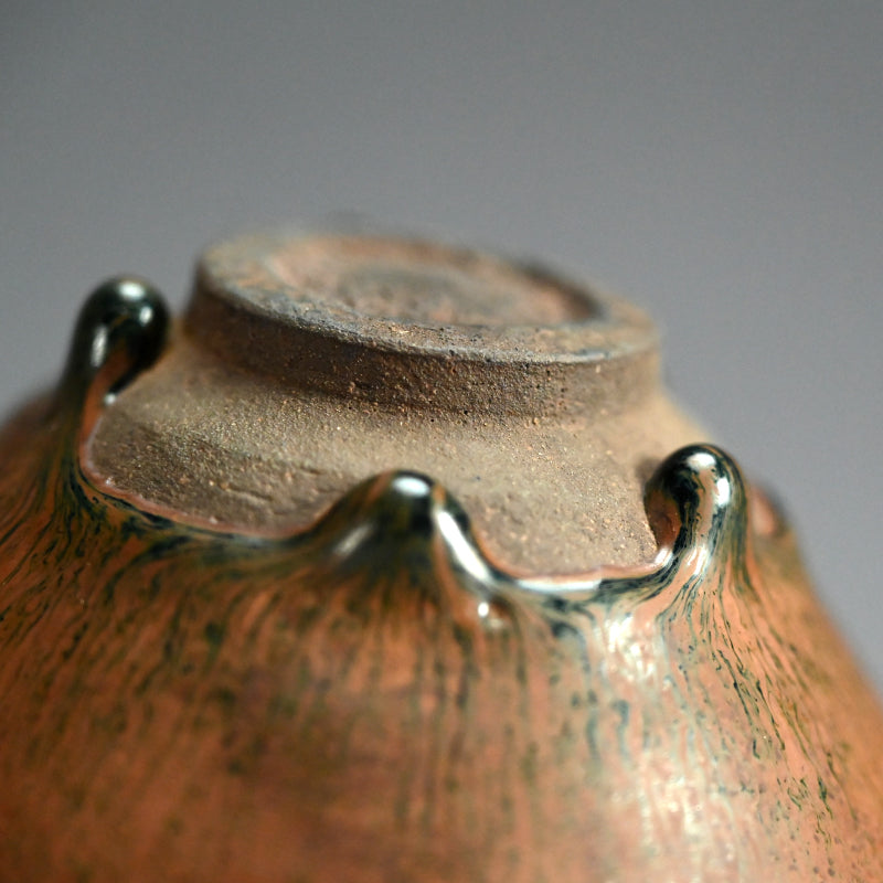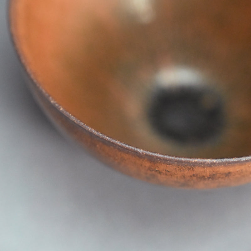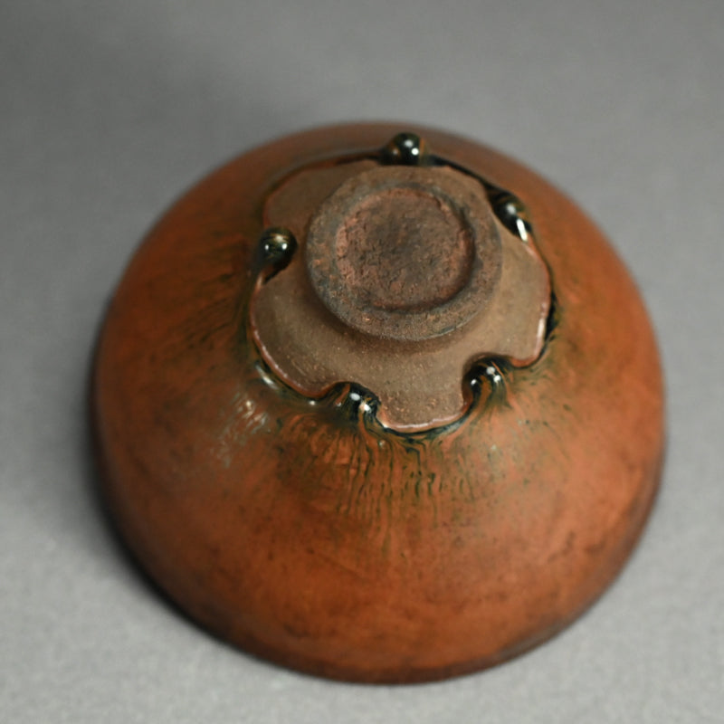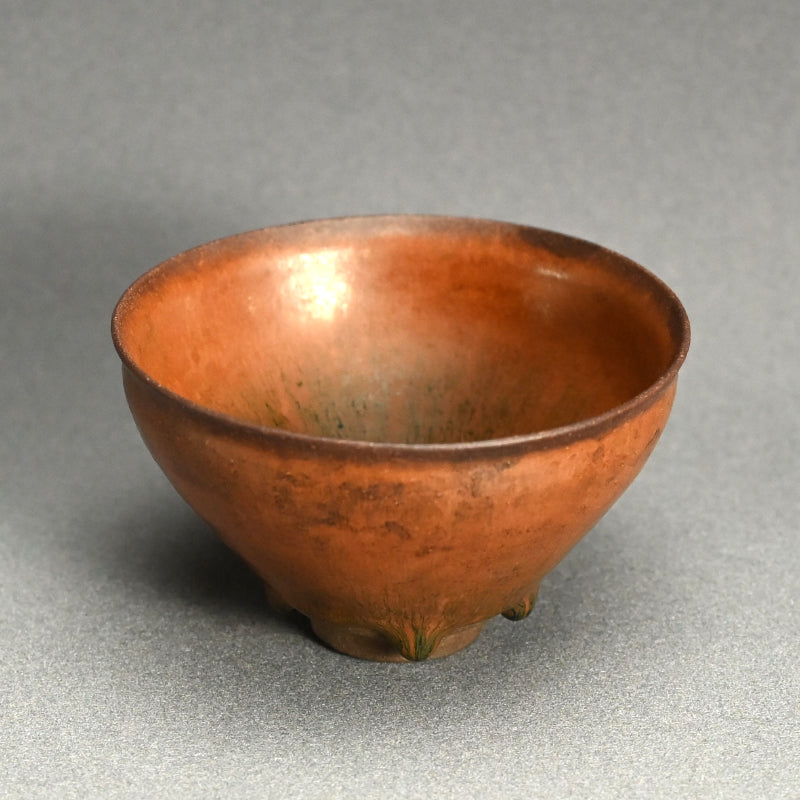 中国の天目茶碗は、日本の古典的な茶文化において重要な位置を占めています。もともと宋王朝(960~1279年)に中国の寺院から輸入されたこれらの茶碗は、そのシンプルで洗練された形と 縞模様や斑点、鏡のような黒仕上げを特徴とするダイナミックな釉薬で賞賛されました。その暗く光沢のある表面は、明るい緑色の抹茶との視覚的なコントラストを高め、印象的な視覚的調和を生み出しました。これらの茶碗は日本の茶陶の進化に影響を与え、新しい釉薬や形を刺激し、戦国時代を通じて高く評価されました。