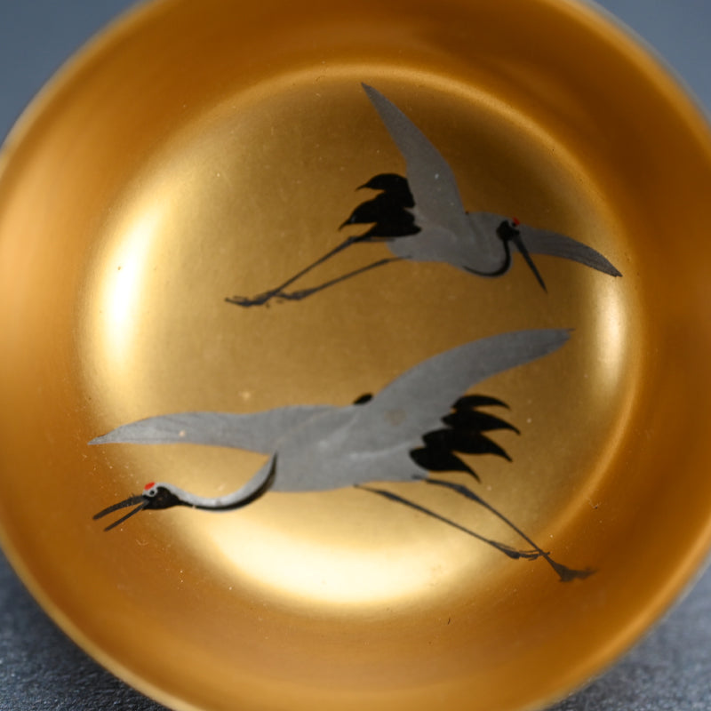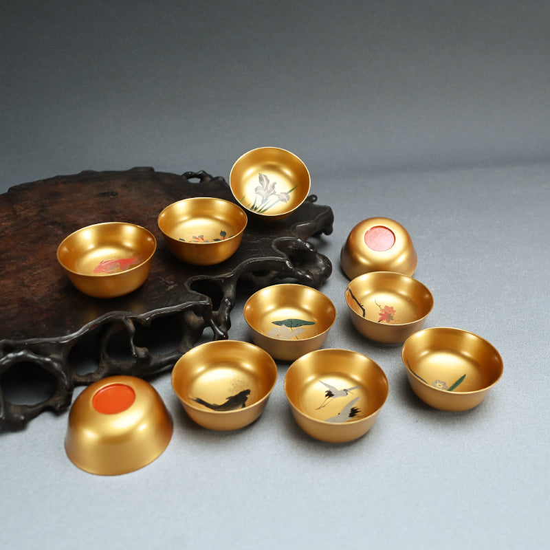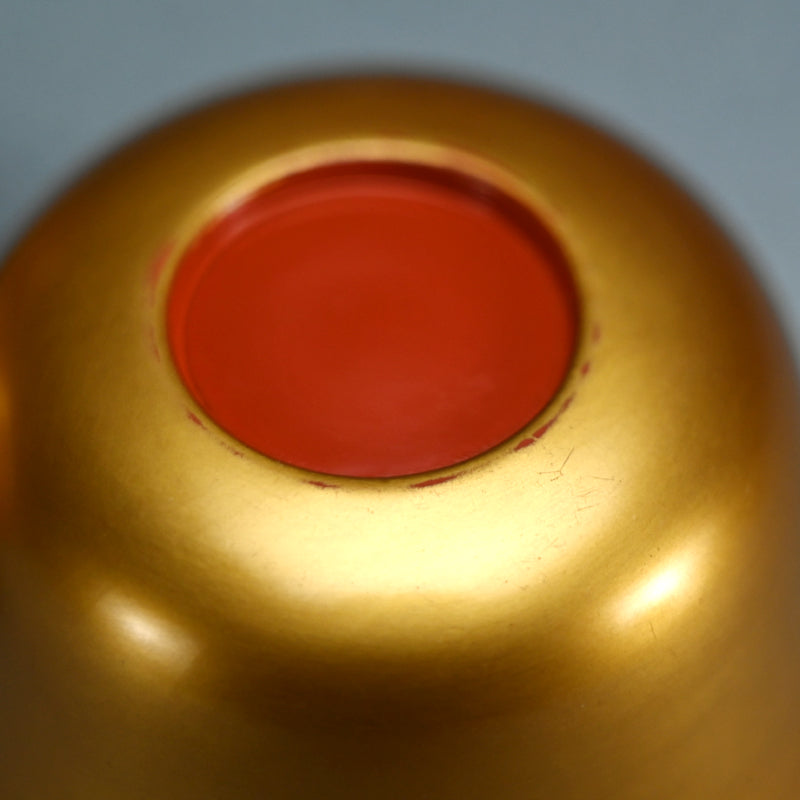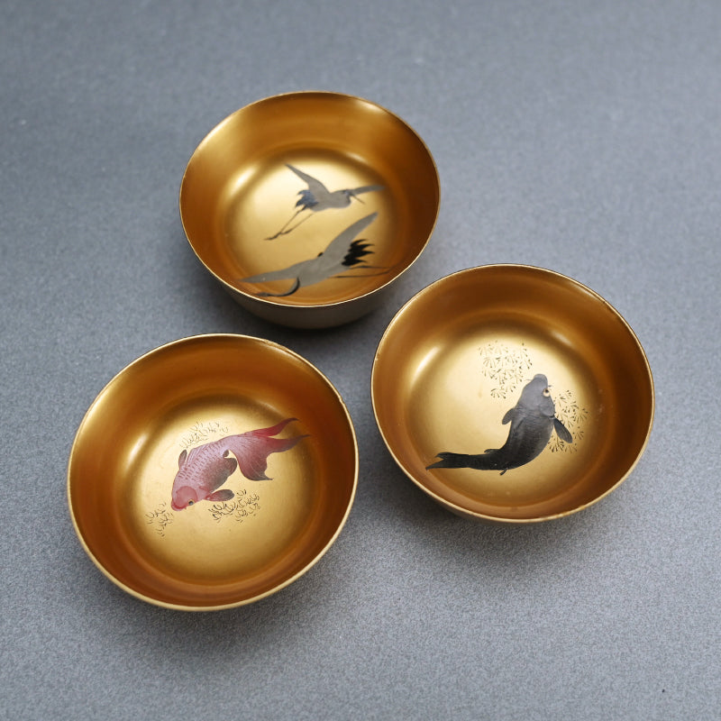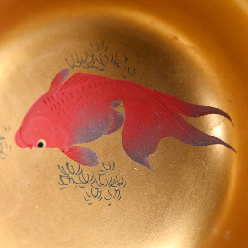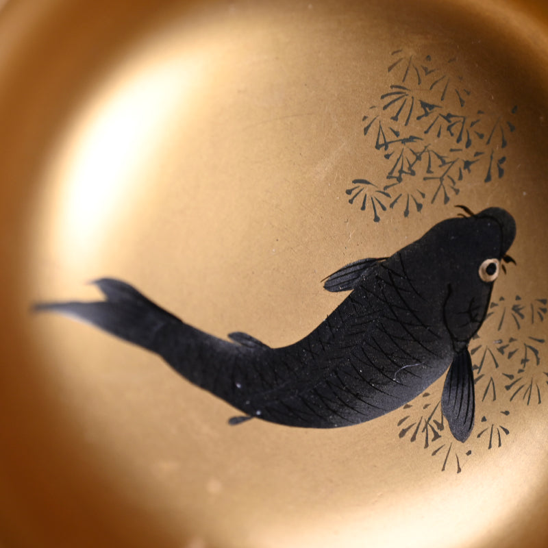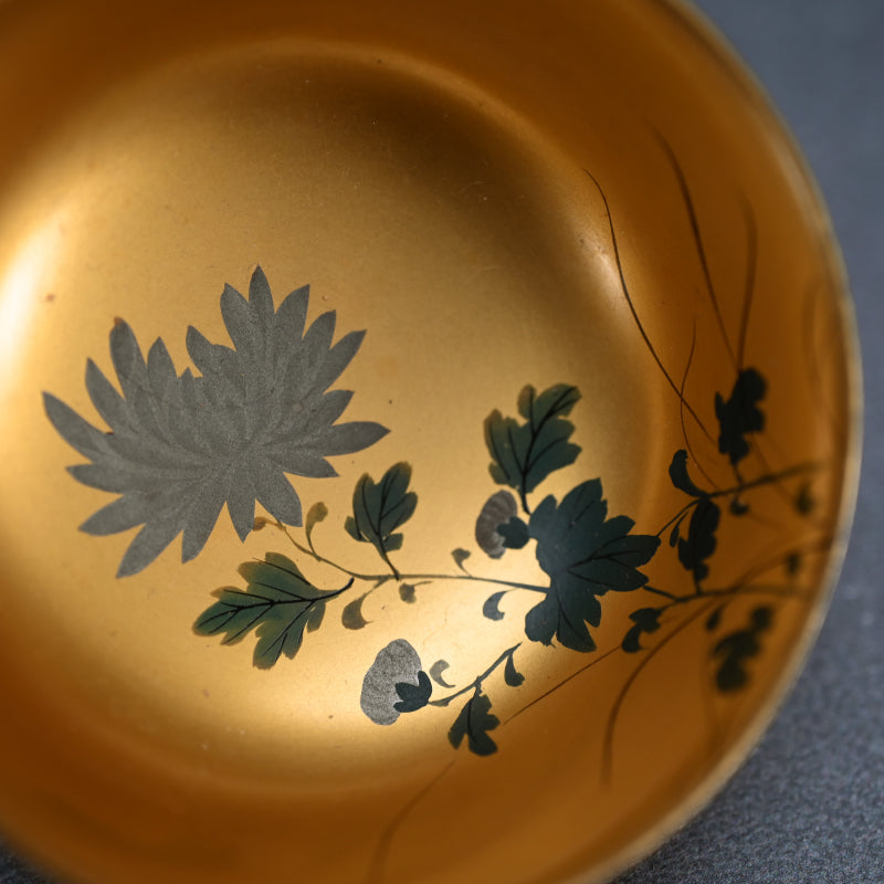 20世紀初頭に作られた、季節の花や魚が描かれたきらきらと輝く金色の酒器10個セットです。経年変化した桐箱に収められています。いずれも木を削り出し、金粉を混ぜた漆で覆い、四季折々の花々などを描いた繊細な蒔絵で装飾されています。直径 6.5 cm、高さ 3 cmで、状態は良好です。