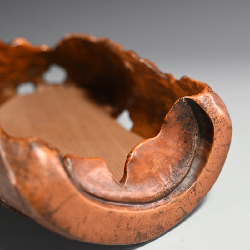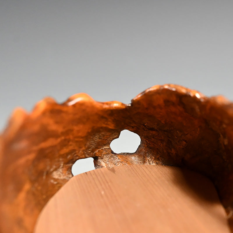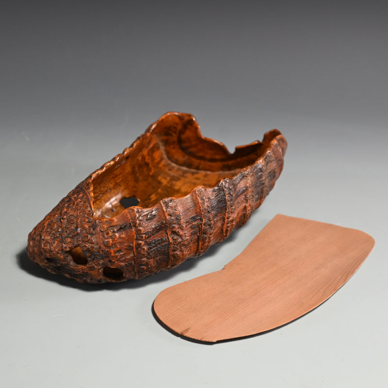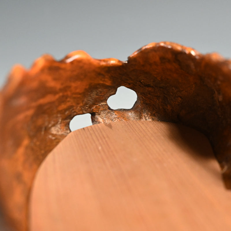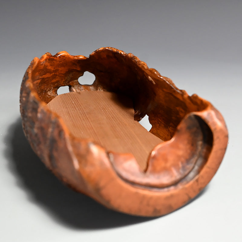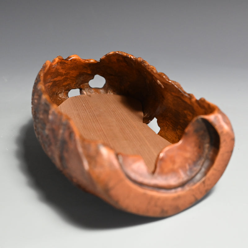 美しく磨かれ くり抜かれた竹の根をお盆に仕上げました。表面が平らになるように 木目の整った杉材を内側に挿入しています。自然の穴や老朽化が長い年月の間に生じ 根は磨り減っており、切られたり根こそぎにされたりして地中から露出しています。これは日本の侘び寂びの美学に表現された哀愁の素晴らしい例です。はかないものと衰退していくものすべてに対する感謝の気持ちです。 サイズは 27 x 17 x 10cm で 特注の古い木箱に入っており、状態は良好です。購入時に箱に入っていた新聞には 昭和7年10月10日の日付が書かれています。