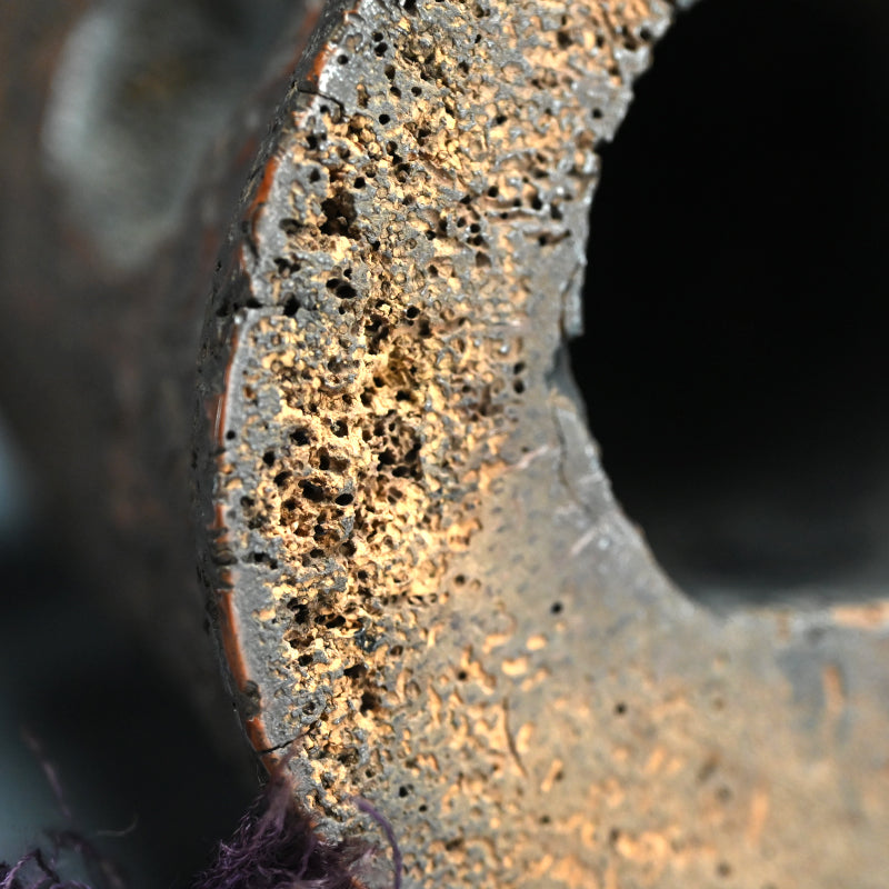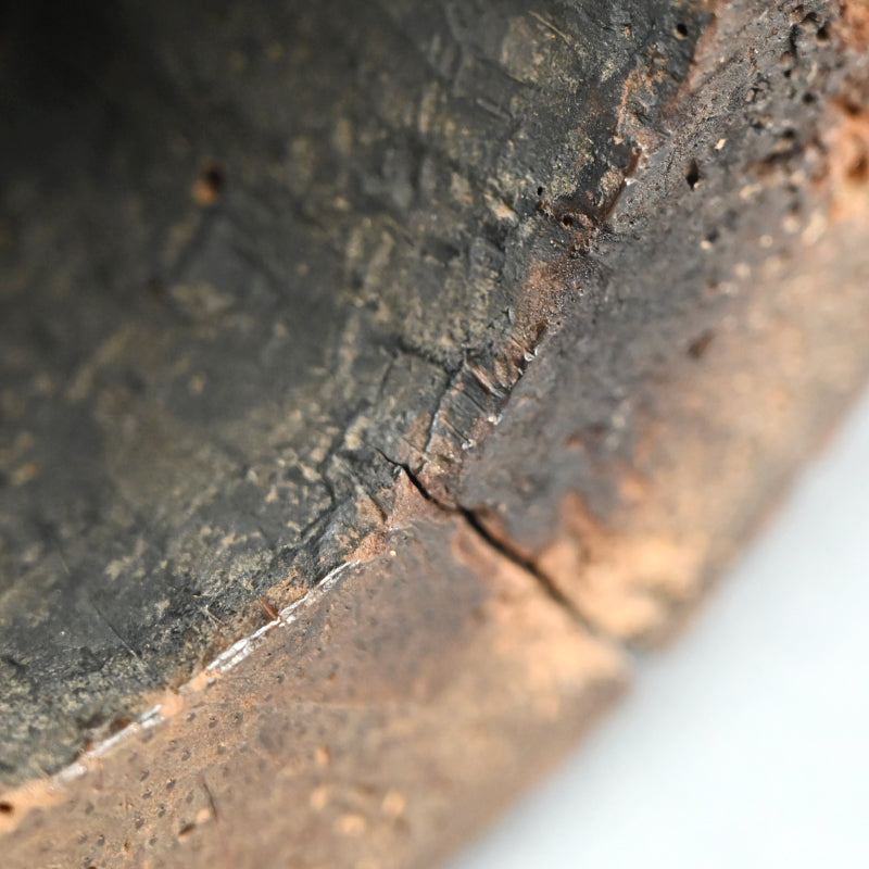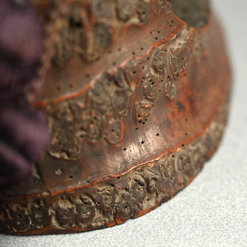 竹の根をくりぬいて作った鐘を、良質の桑の木で作った小さな木槌で打ち、虫のついた桐箱に収めた「時代竹根鐘」です。 何世紀にもわたる使用により、美しい黒っぽい緑青が生まれています サイズは 14.5 x 18.5 x 23.5 cmで、竹製品特有の小さな虫食い穴があるものの 良好な状態です。 このような作品はおそらく机の上に置かれ、召使を呼んだりお茶を頼んだりするときにハンマーで叩かれたものと思われます。