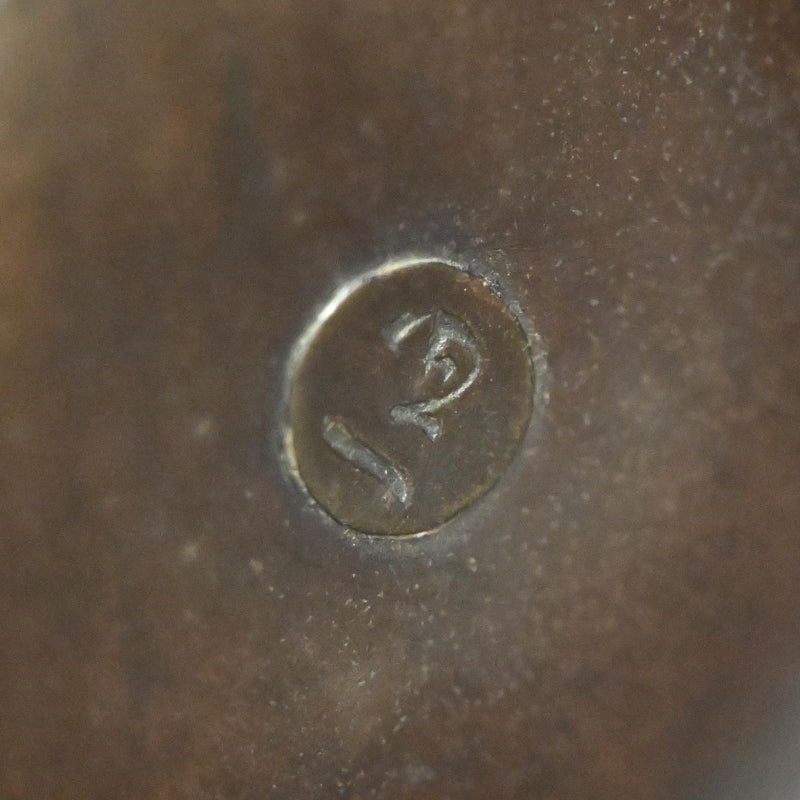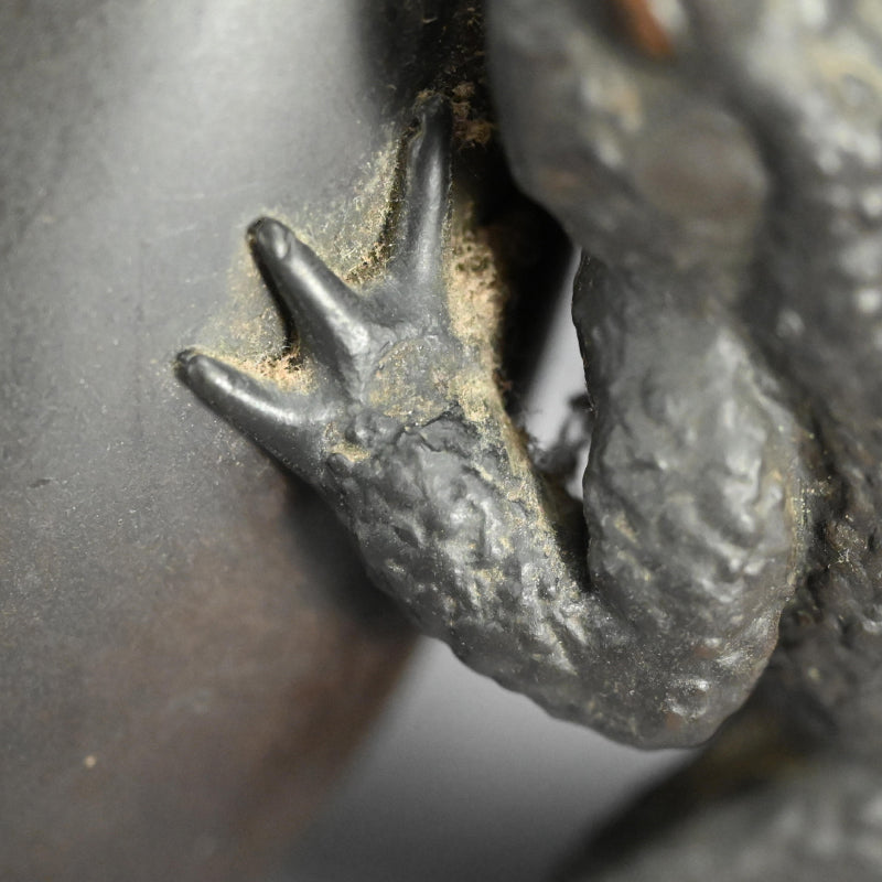 瓢箪の形をしたブロンズの花瓶です。屈強なウシガエルが 瓢箪を立てさせようと格闘している様子が描かれています。台座には、一生と思われる円形のサインが刻まれています。非常に精巧に鋳造された珍しい形状で、高さは32cmで 状態は良好です。