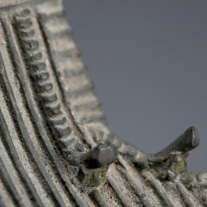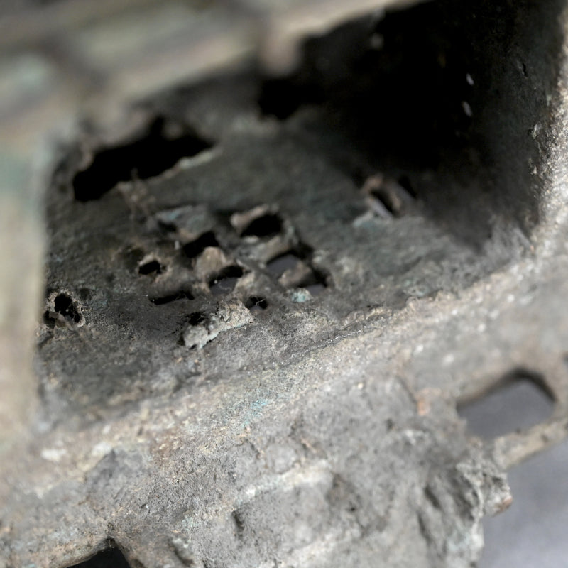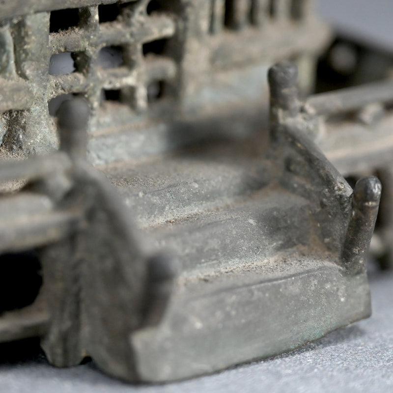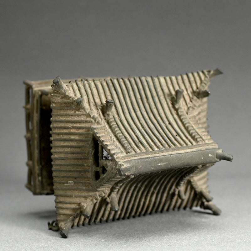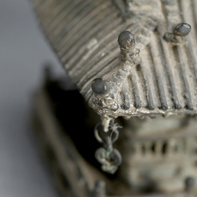19世紀に建てられた寺院の形をした小さな青銅像です。おそらく置香炉として使用されていたものと思われます。サイズは15 x 12.5 x 15.5 cmで、全体的に良好な状態です。 もともとは四隅に飾りが付いていましたが、現在残っているのはそのうちの 1つだけです。
