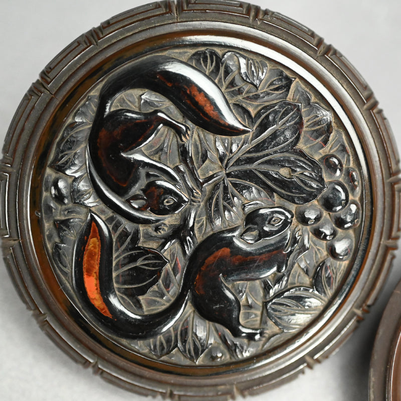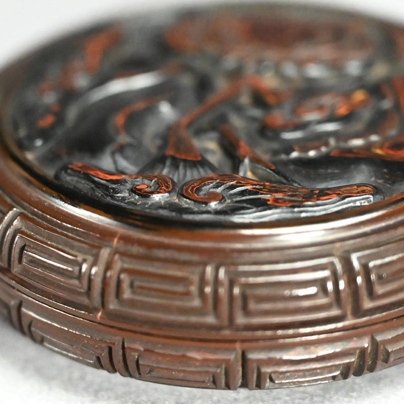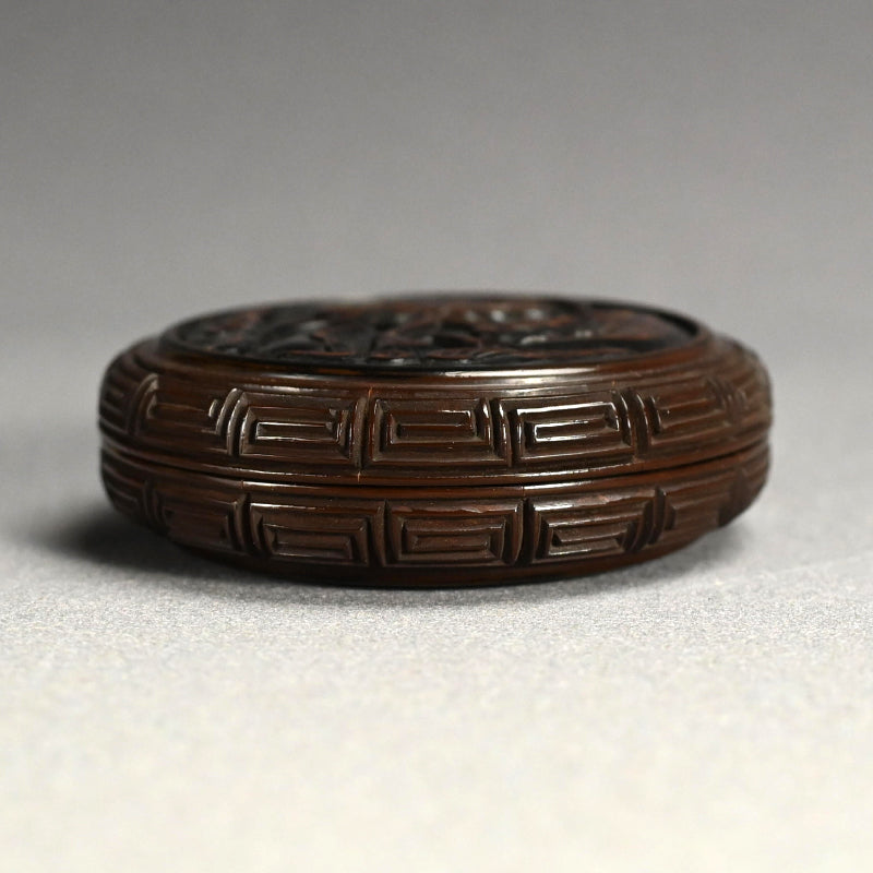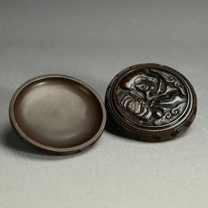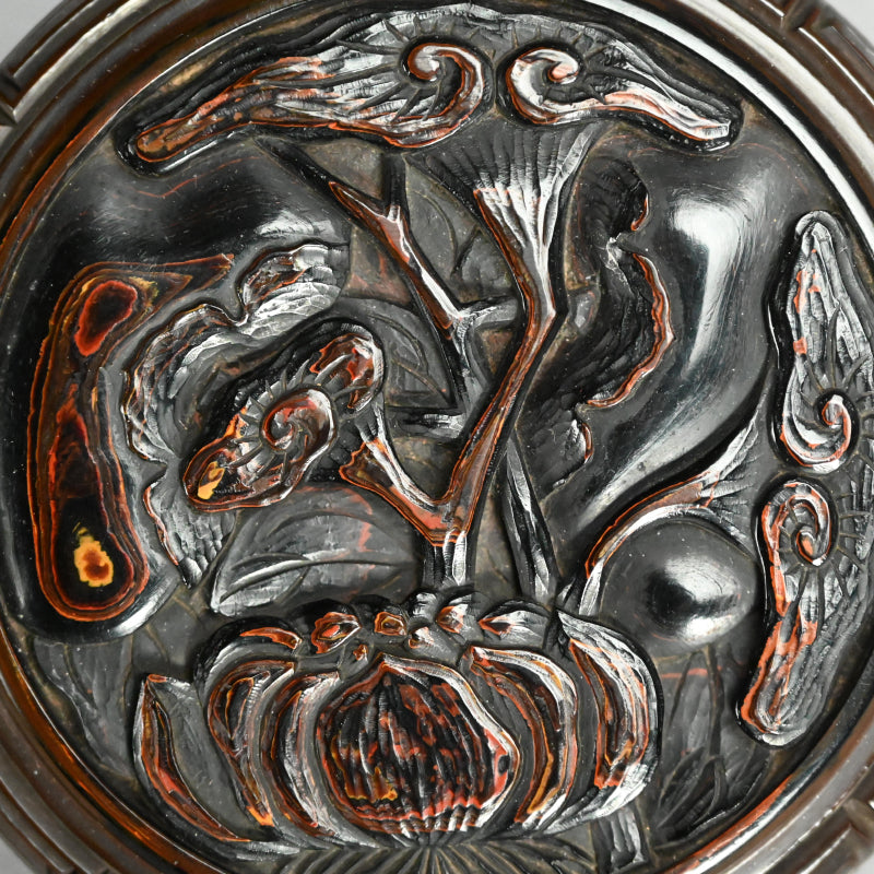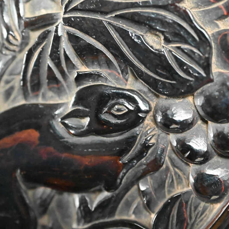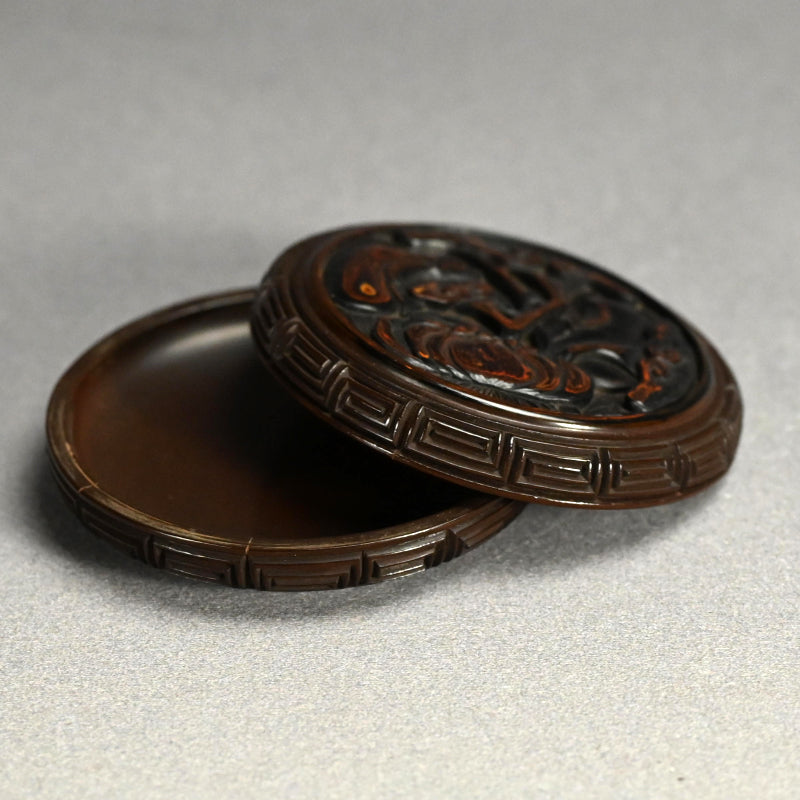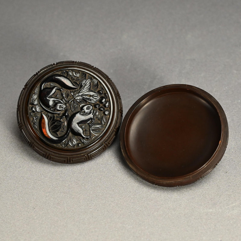 片面にはブドウの蔓にリスが描かれ、反対側には霊芝茸が描かれた木製の香箱です。2枚のパネルは深く刻まれた鍵盤のフレットで仕切られており、左右に分かれています。19世紀に熟練の職人の手によって作られ、黒漆で内張りが施され 当時の木箱に収められています。直径9.5cm、高さ3cmで 全体的に良好な状態ですが、鍵盤のフレット間には経年による細かなひび割れが見られます。