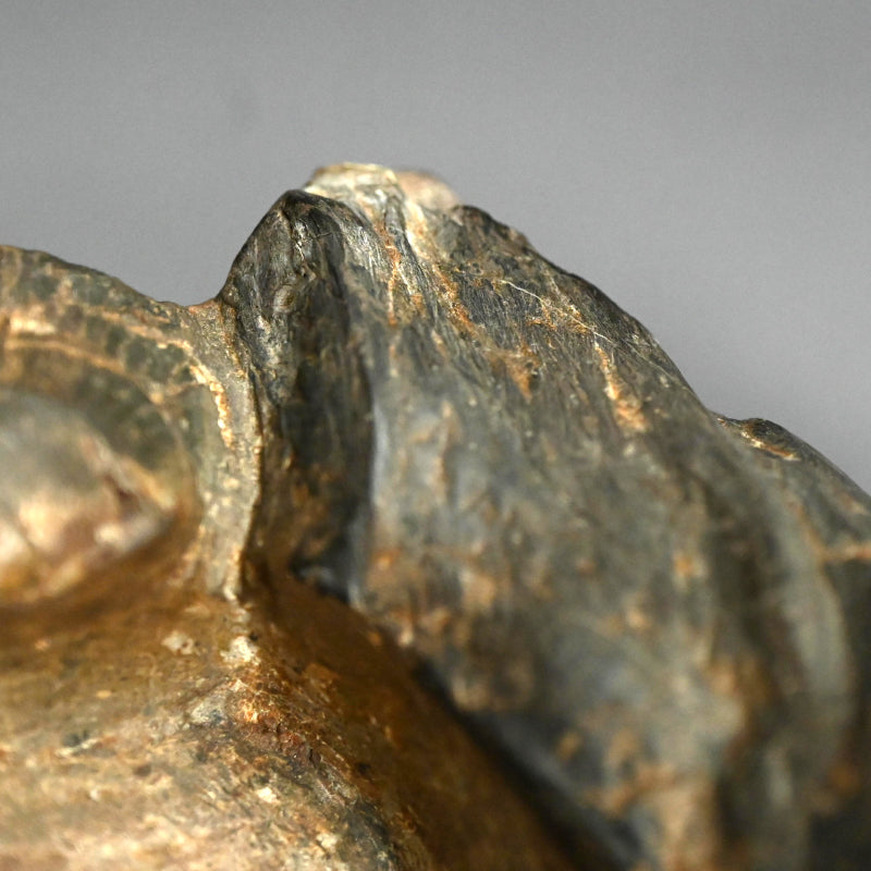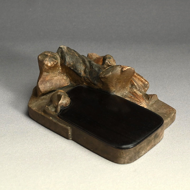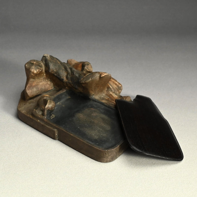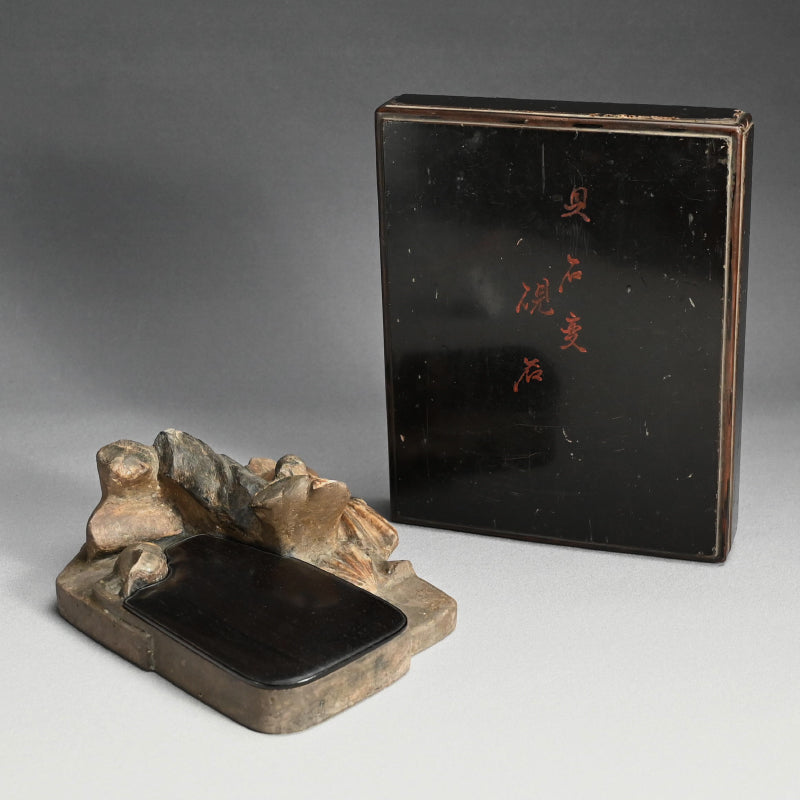 化石化した貝殻を含んだ粘板岩で作られた硯墨砥石は、これまで見たことがありません。貝殻そのものを意匠に取り入れた大変珍しい作品で、墨壺は表面に深く刻まれ、美しく彫刻された紫檀の蓋で覆われています。砥石は、紛れもなく江戸時代の黒漆塗りの木箱に収められています。砥石のサイズは20 x 26 x 8.5cm(8 x 10.5 x 3.5インチ)で、状態は良好です。