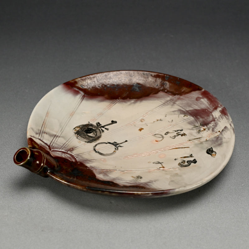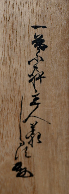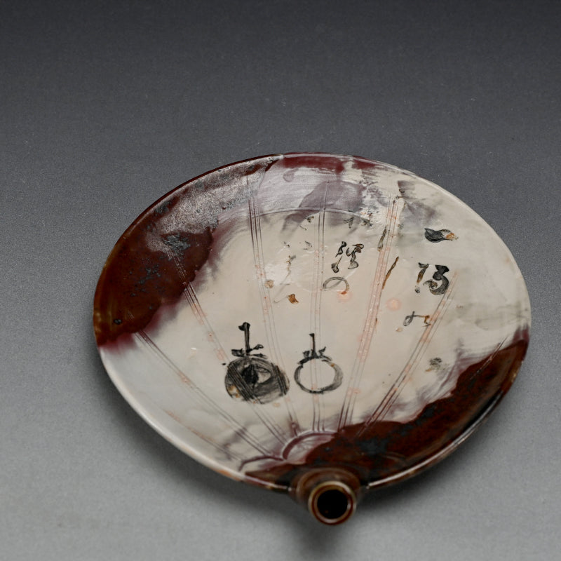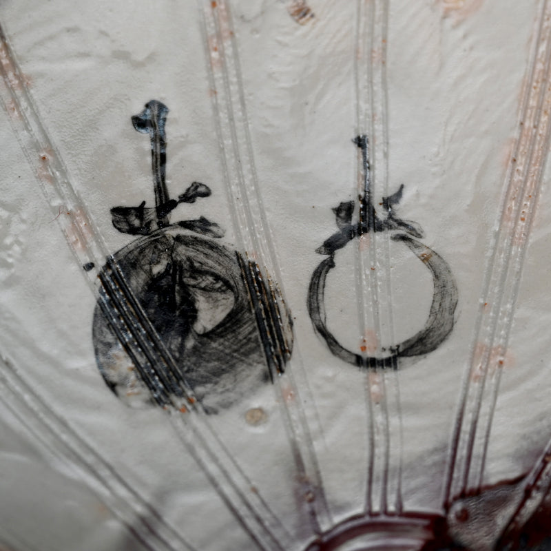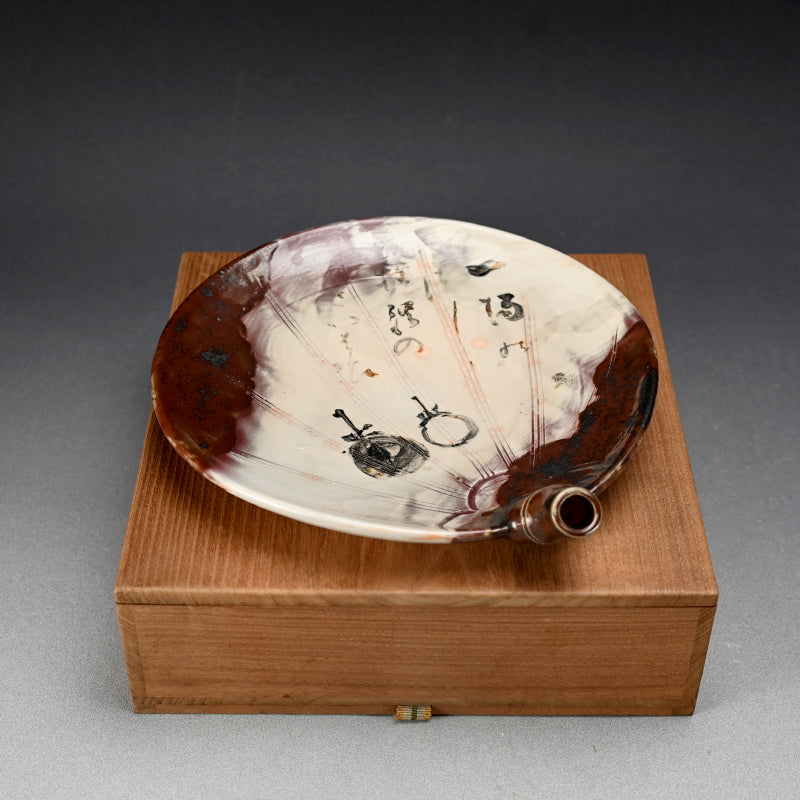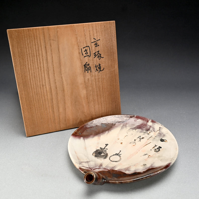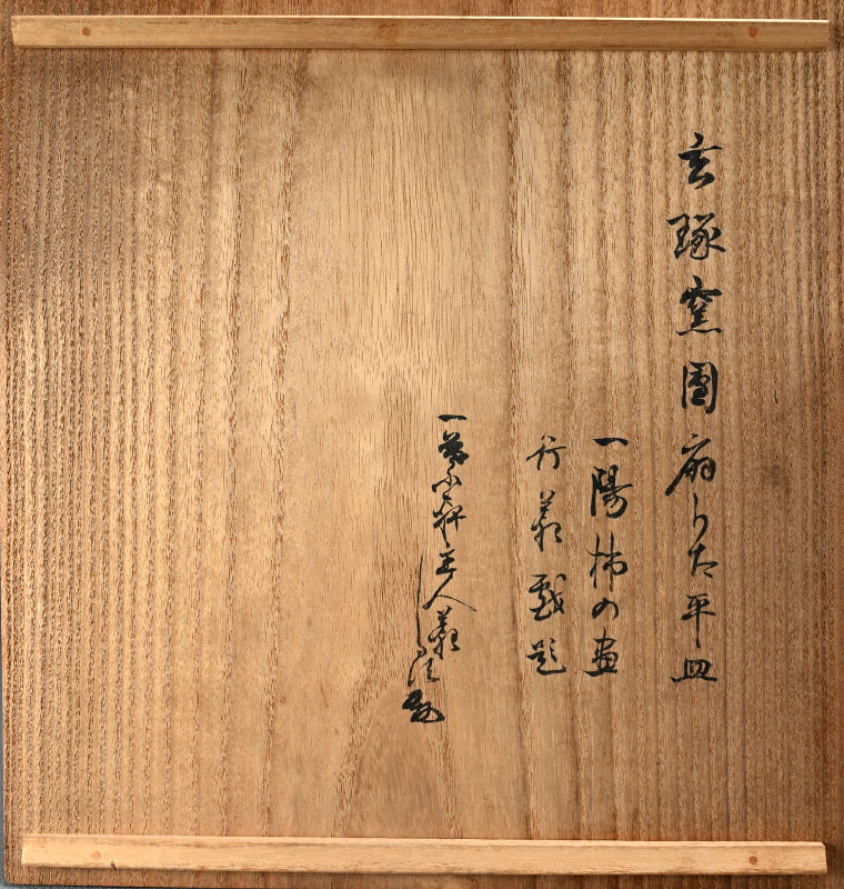 A fan shaped dish from the Gentaku Kiln dating from the first half of the 20th century decorated with a poem and autumn persimmon fruits. It comes enclosed in a wooden collectors box annotated inside with a description of the piece in delicate brush strokes. The dish is 25 x 28 x 5.5 cm (10 x 11 x 2 inches) and is in excellent condition, stamped Gen on the underside. A very intriguing bit of Japanese Ceramic history. In the early Showa period, the first generation, Kahei, built the Gentaku Mountain Villa and established the Gentaku Kiln to produce pottery for guests. However, the kiln naturally fell into disuse with the onset of the Second World War. Oshima Rakuan and various potters were invited to create work there.