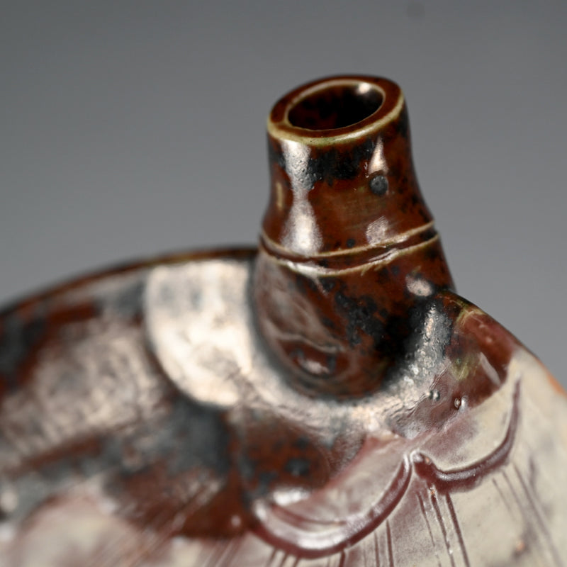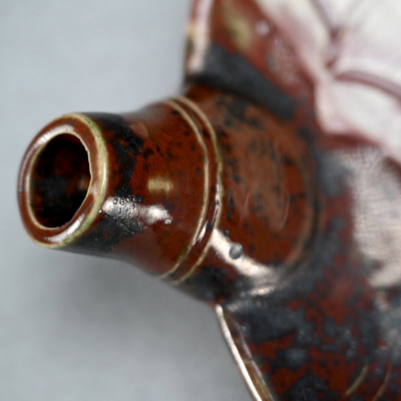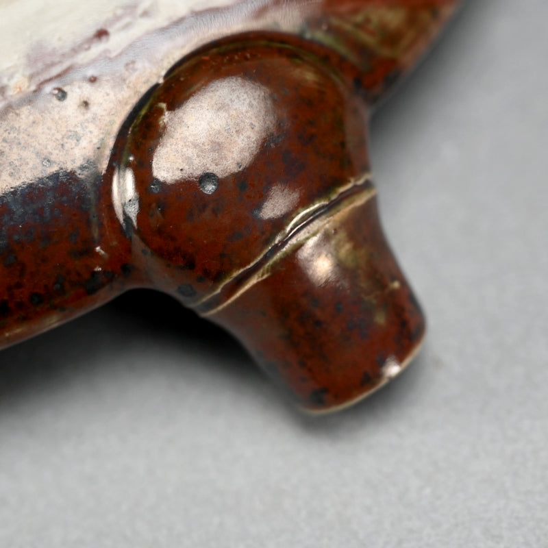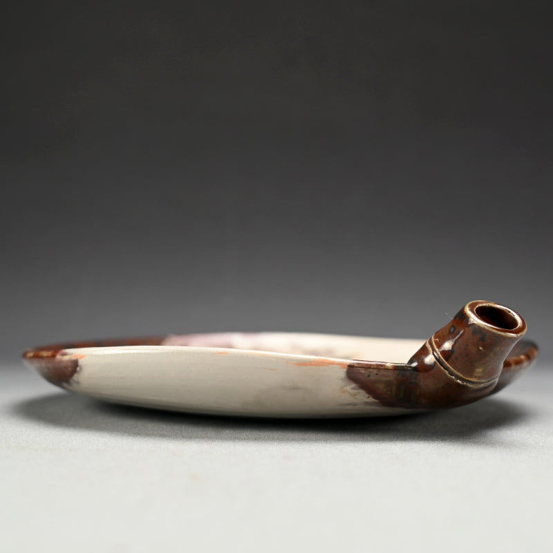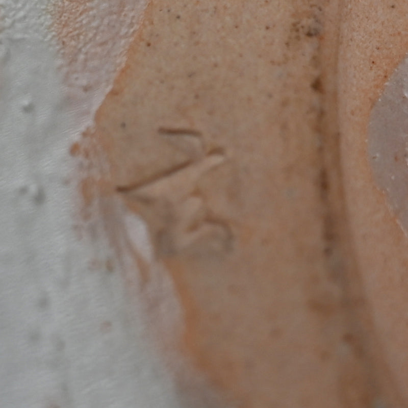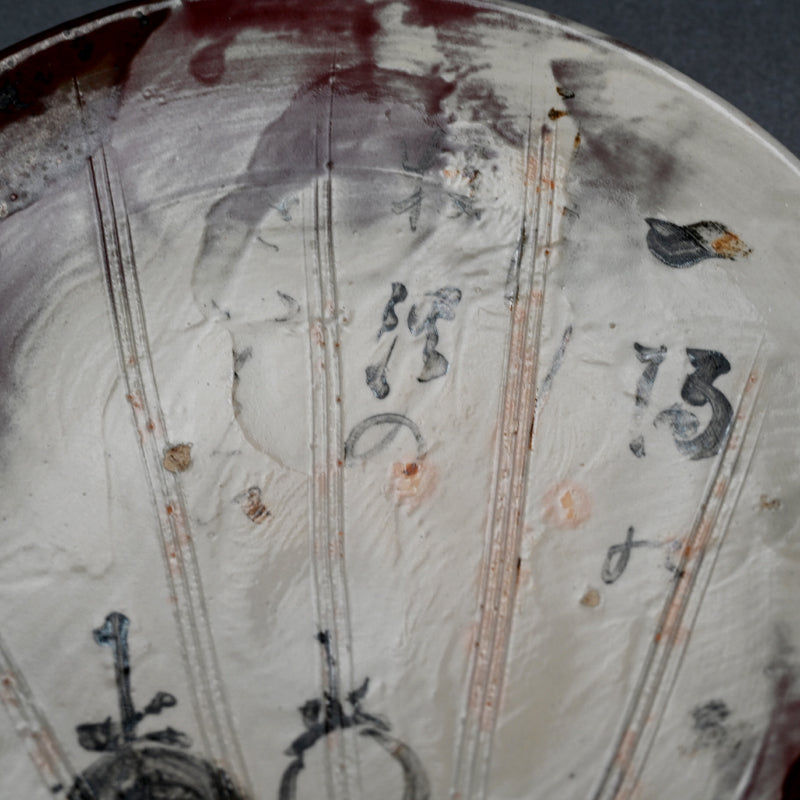 A fan shaped dish from the Gentaku Kiln dating from the first half of the 20th century decorated with a poem and autumn persimmon fruits. It comes enclosed in a wooden collectors box annotated inside with a description of the piece in delicate brush strokes. The dish is 25 x 28 x 5.5 cm (10 x 11 x 2 inches) and is in excellent condition, stamped Gen on the underside. A very intriguing bit of Japanese Ceramic history. In the early Showa period, the first generation, Kahei, built the Gentaku Mountain Villa and established the Gentaku Kiln to produce pottery for guests. However, the kiln naturally fell into disuse with the onset of the Second World War. Oshima Rakuan and various potters were invited to create work there.