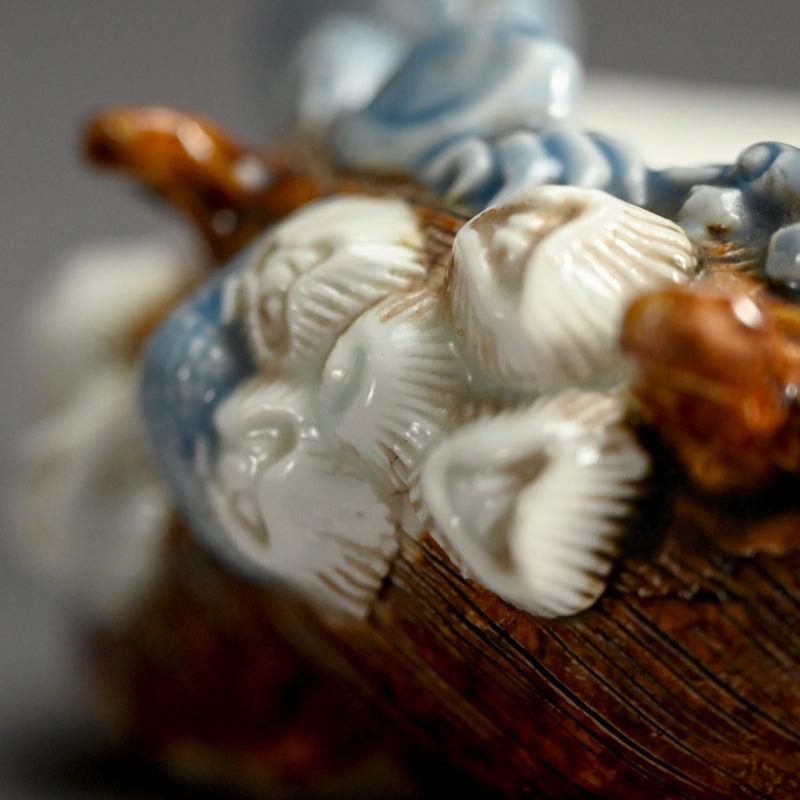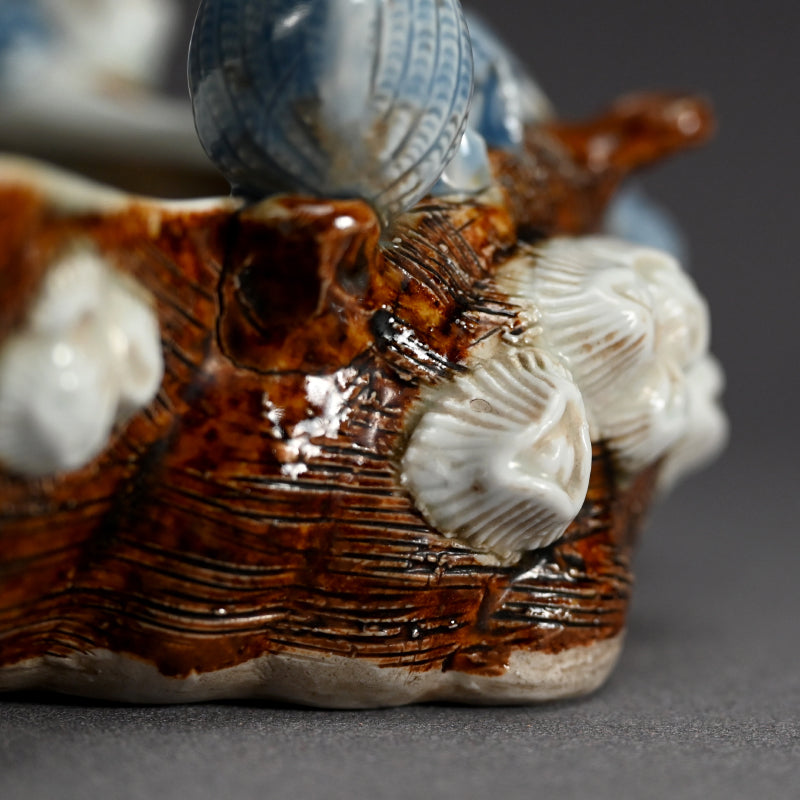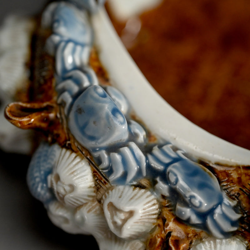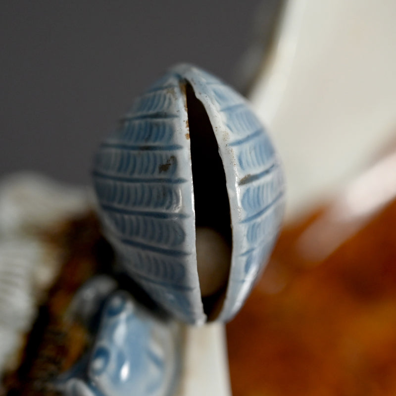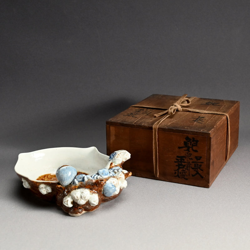 フジツボ、カニ、その他の海の生物で覆われた大きな牡蠣の殻の形をした 19世紀の磁器椀です。青いハマグリの貝殻の中には 小さな真珠が入っており、皿を動かすと鐘のように鳴ります。サイズは19 x 23 x 7 cmで 状態は良好で、「鮑 肥前平戸焼」と題された経年による黒ずんだ木箱に収められています。