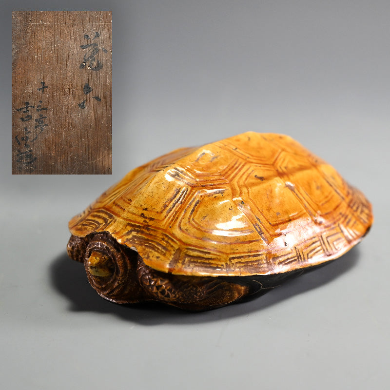 19世紀後半に大阪の吉向窯で作られた鮮やかな黄色の陶器の亀で、オリジナルの署名入り木箱に入っています。サイズは16.5 x 11.5 x 6 cmで、カメの甲羅の脆い縁の周りには古い欠けがあります。同じ部分にはいくつかの漆の補修がありますが、ひび割れはありません。