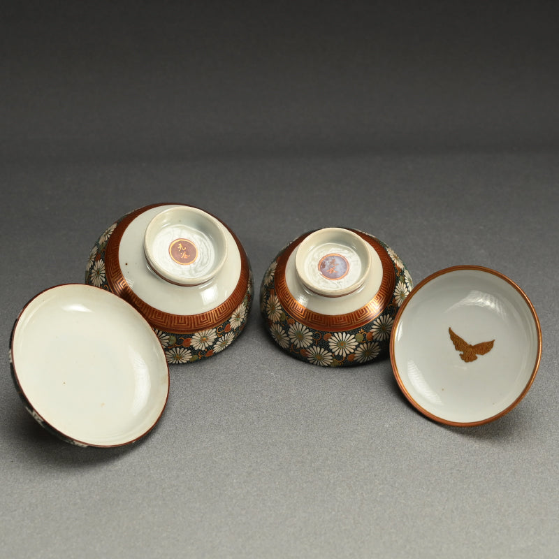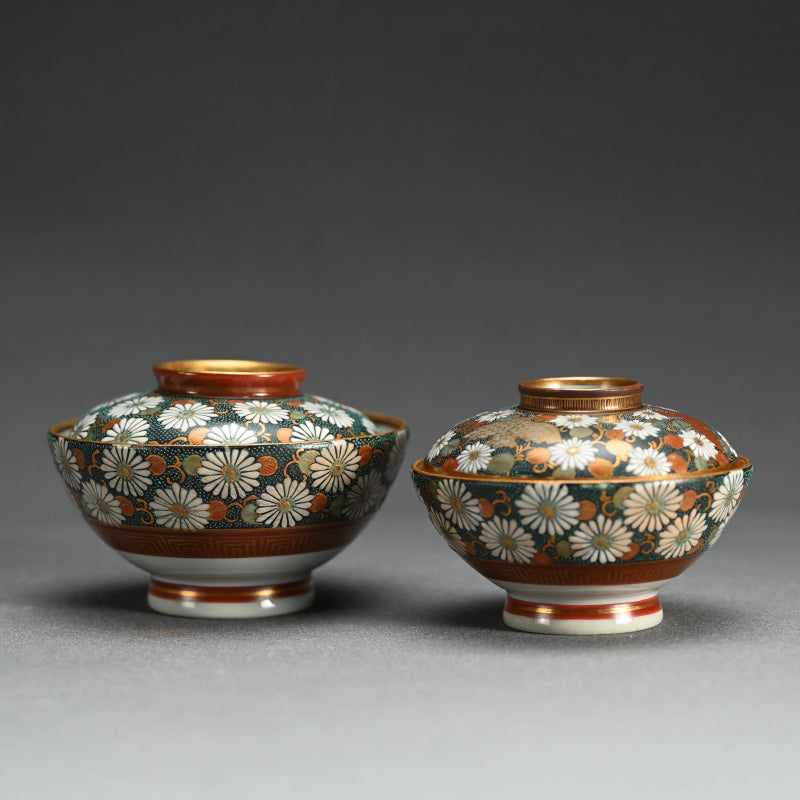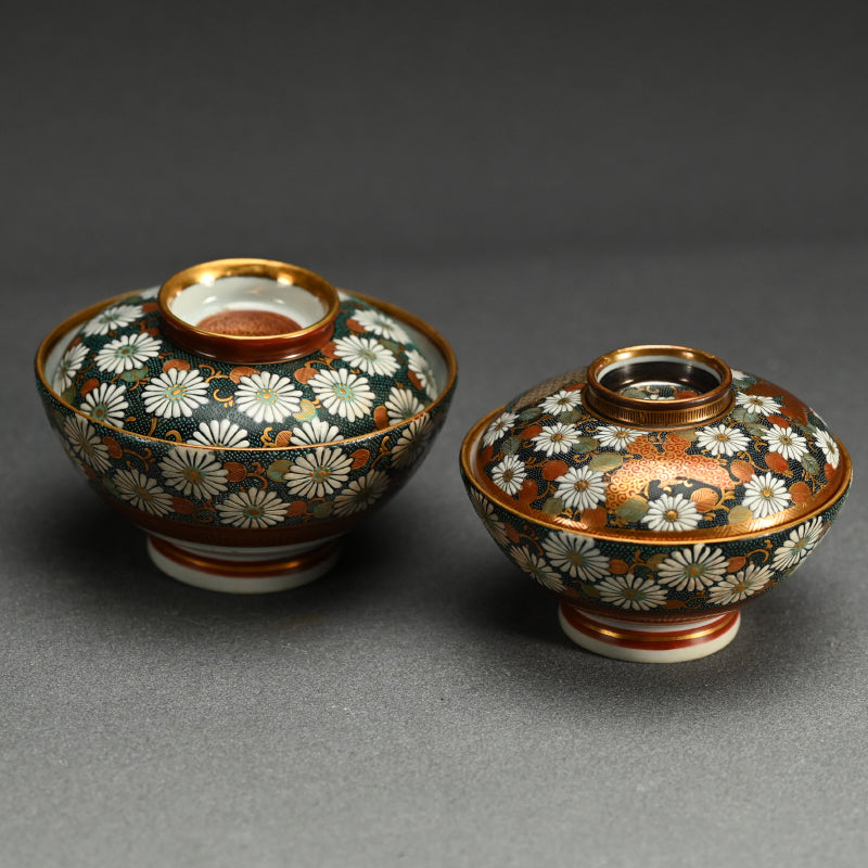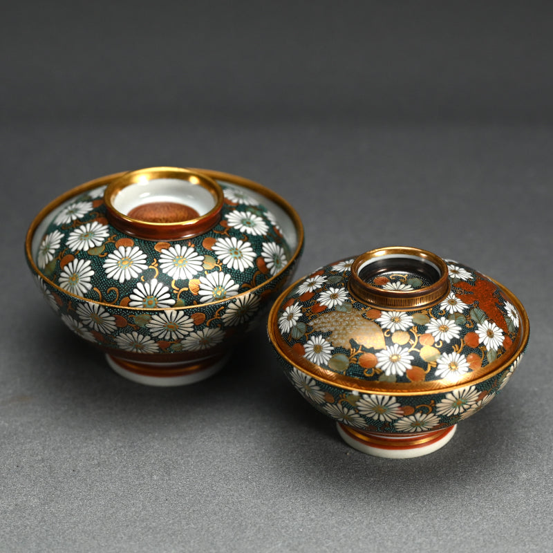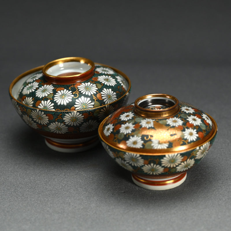 石川県九谷焼の蓋付磁器鉢2客セットです。盛り上げ模様の菊と金襴手の模様に赤い蝶が描かれており、精巧に装飾されています。台座の内側に九谷焼の銘が入っていて、大きい碗は直径11cm、高さ8cm、小さいお椀は直径10cm、高さ7.5cmでどちらも状態は良好です。