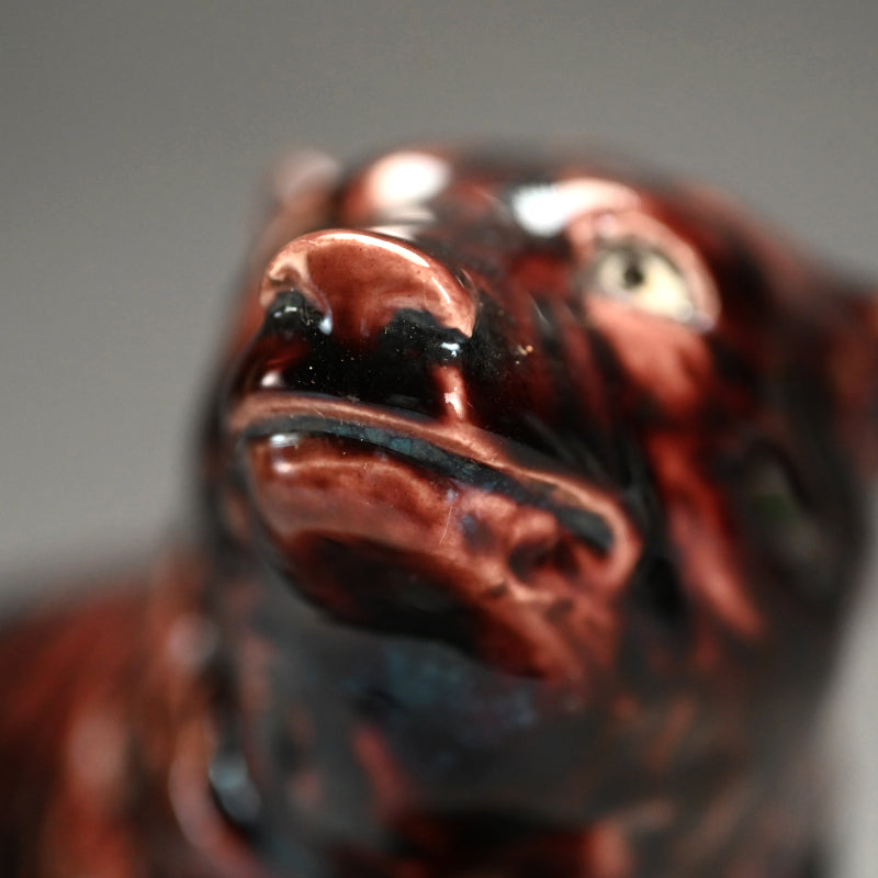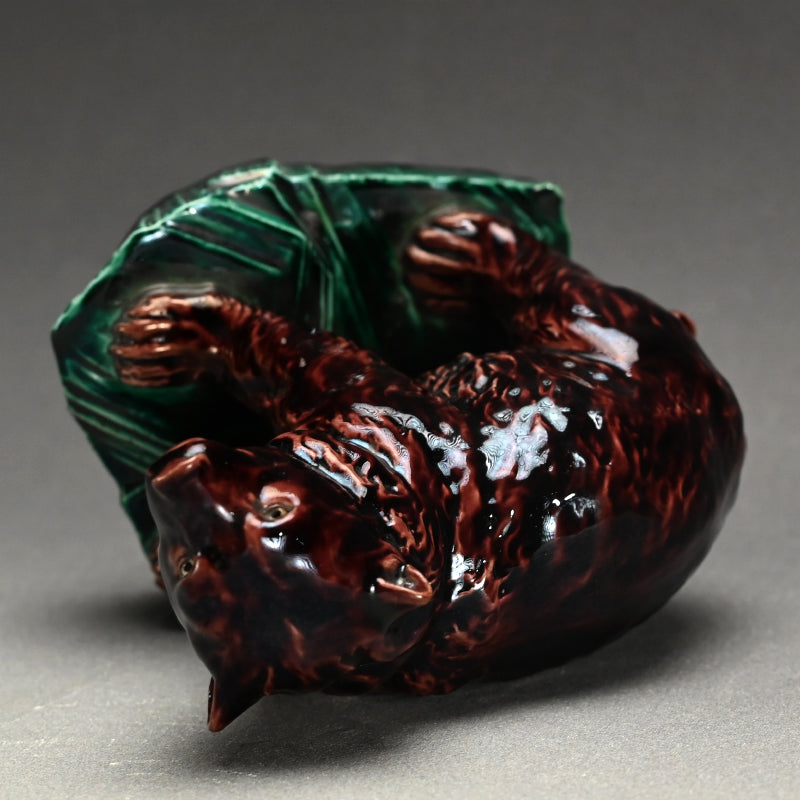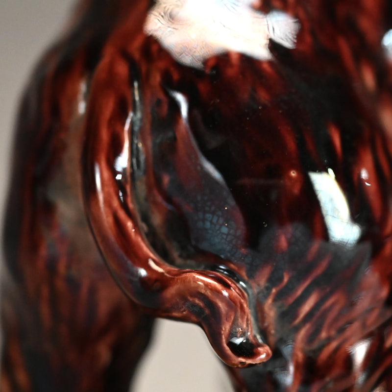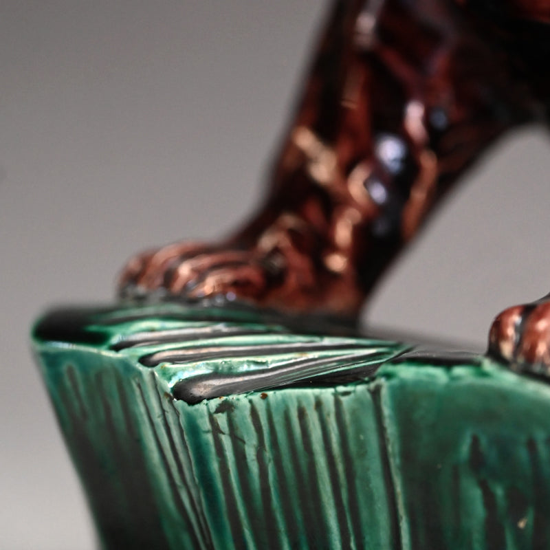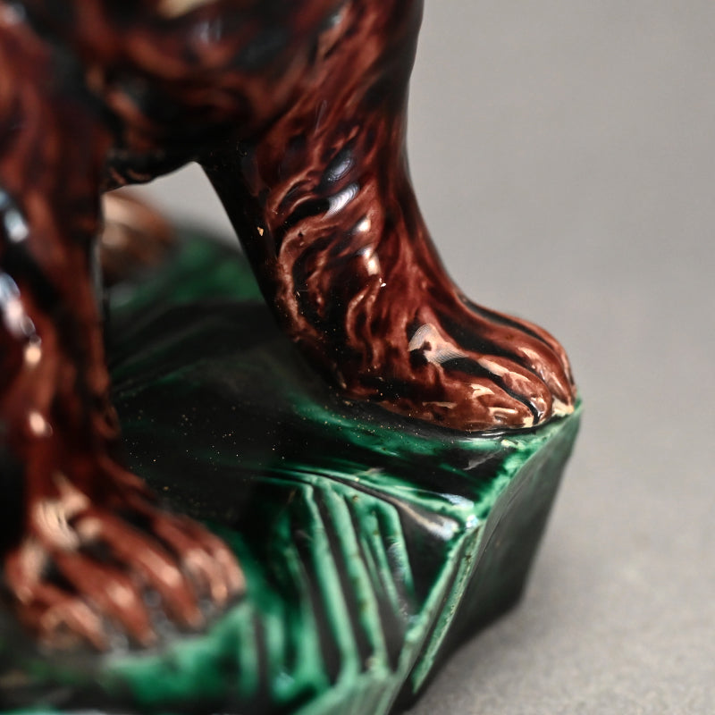 日本有数の磁器生産地である石川県の九谷焼窯で作られた、緑色の台座の上に立ち 茄子色の毛皮で覆われたツキノワグマの像。戦前の物と思われます。サイズは17.5 x 13 x 18 cmで、九谷庄助の印が入ったオリジナルの木箱に収められており、状態は良好です。