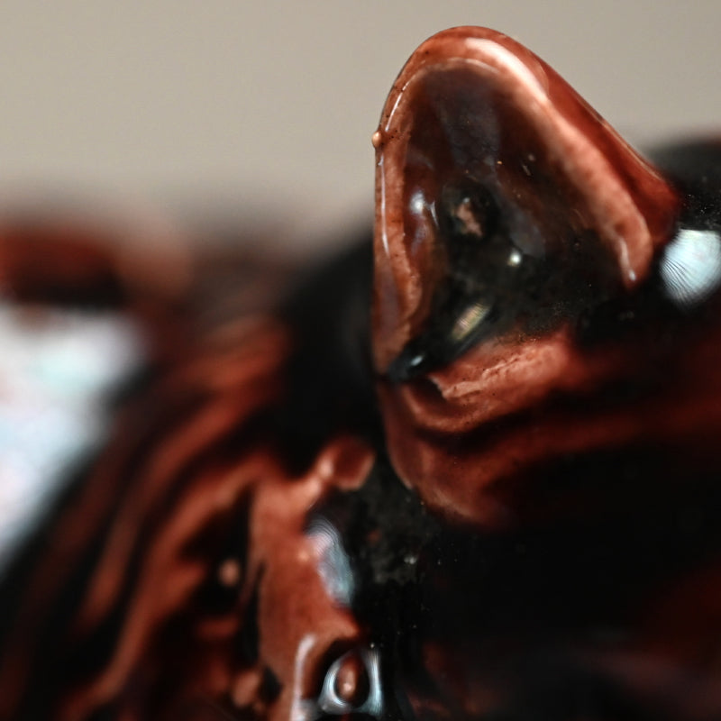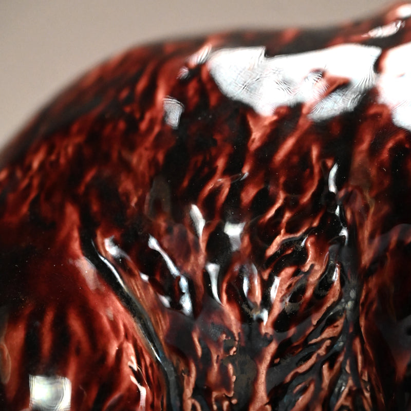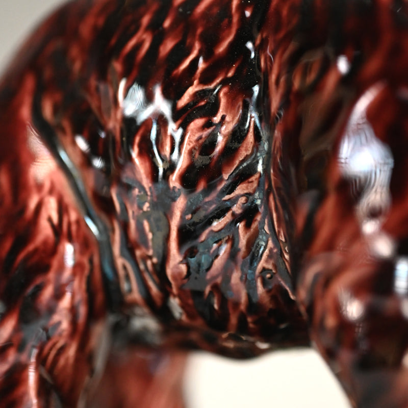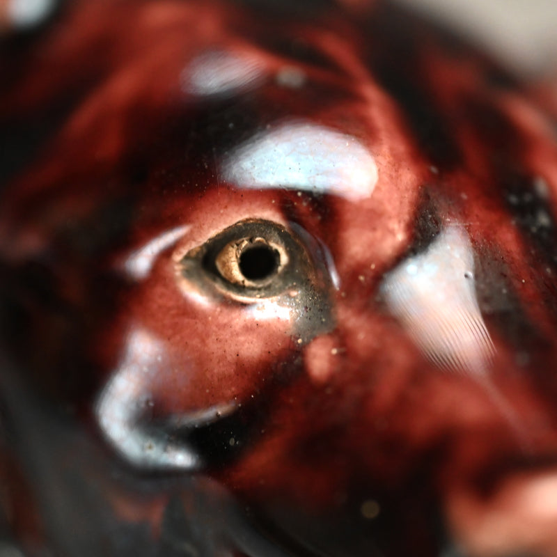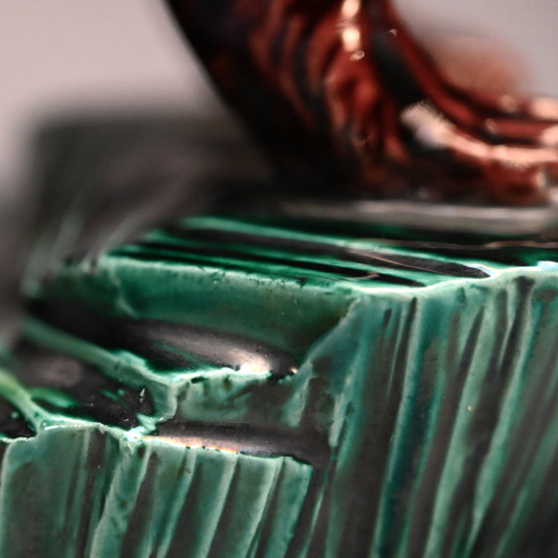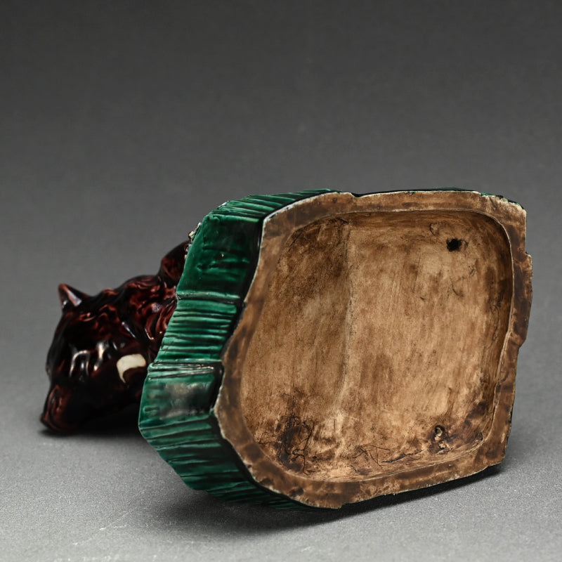 日本有数の磁器生産地である石川県の九谷焼窯で作られた、緑色の台座の上に立ち 茄子色の毛皮で覆われたツキノワグマの像。戦前の物と思われます。サイズは17.5 x 13 x 18 cmで、九谷庄助の印が入ったオリジナルの木箱に収められており、状態は良好です。
