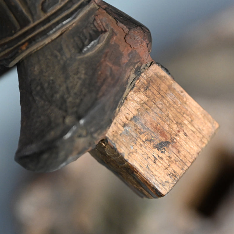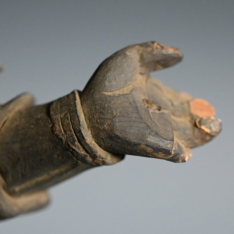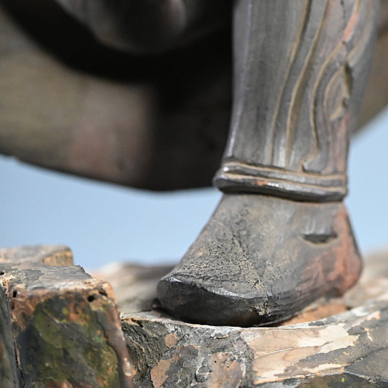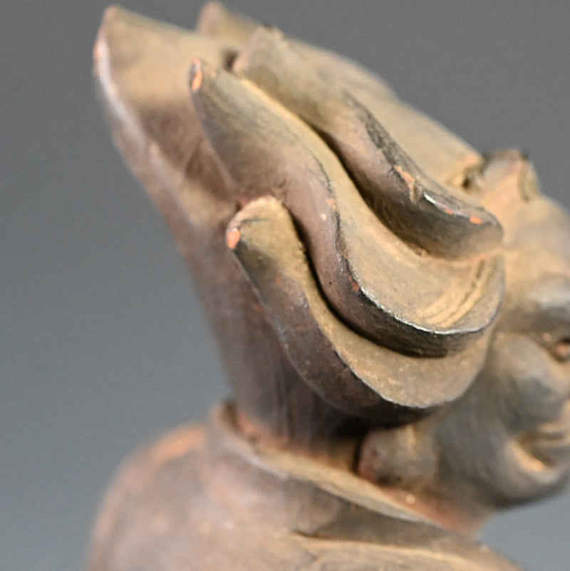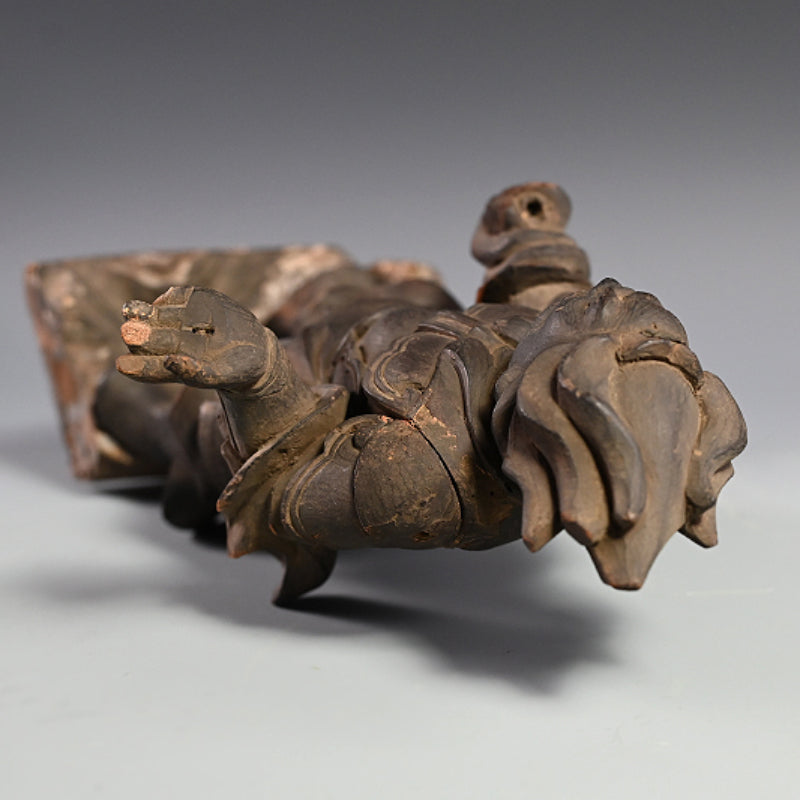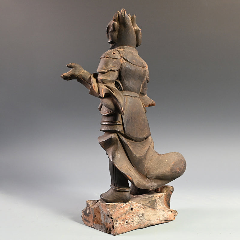 仏教の12人の守護王(天将、十二神将、十二神将)の一人が、髪を炎のように後ろに燃え立たせ 自信に満ち "やって来い" という表情で力強いポーズをとっています。この素朴な彫刻は江戸時代中期のもので、毘沙門天の伝統的な像の特徴を借用した婆娑羅の像であると考えられます。台座(12.5 x 26 cm)を含めた高さは 42 cmで、像自体の高さは37cmです。左手の指先が数本失われており、重装甲の両肩は時間の経過と共に再接合されています。