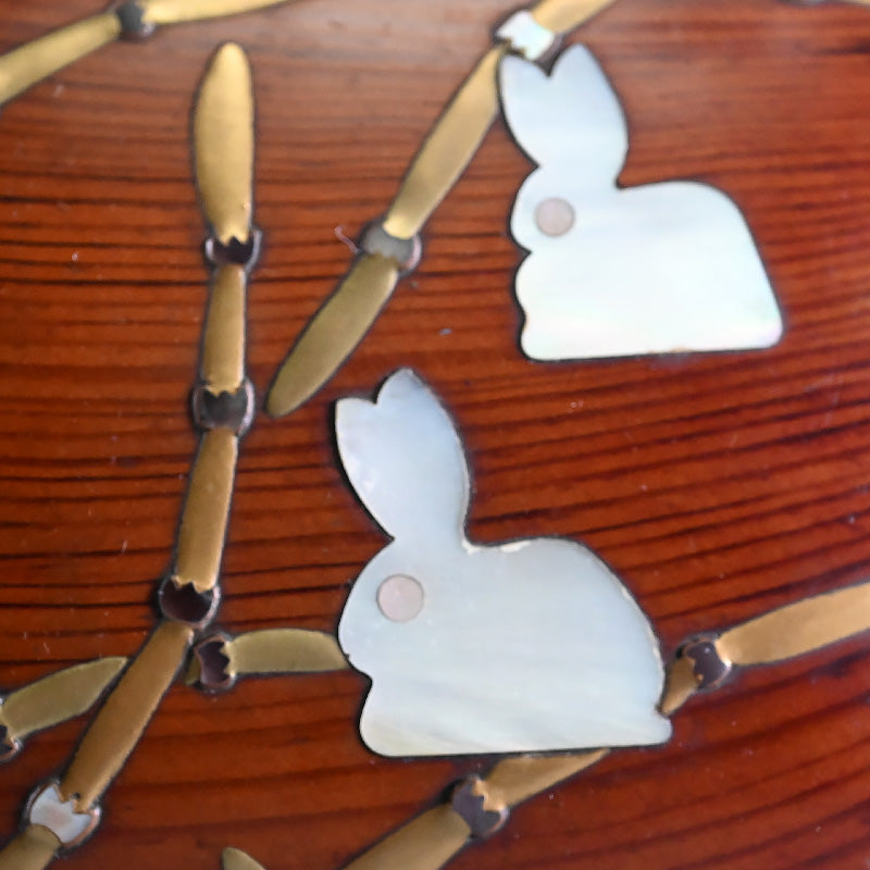 かわいい! オリジナルの署名入り木箱に入った小さな松の箱と盆の生木目に、螺鈿から切り出した白うさぎが十草の葦の間に蒔絵で象嵌されています。 箱自体は 13.5 x 16.5 x 6 cmで、箱とトレイは両方とも良好な状態です。