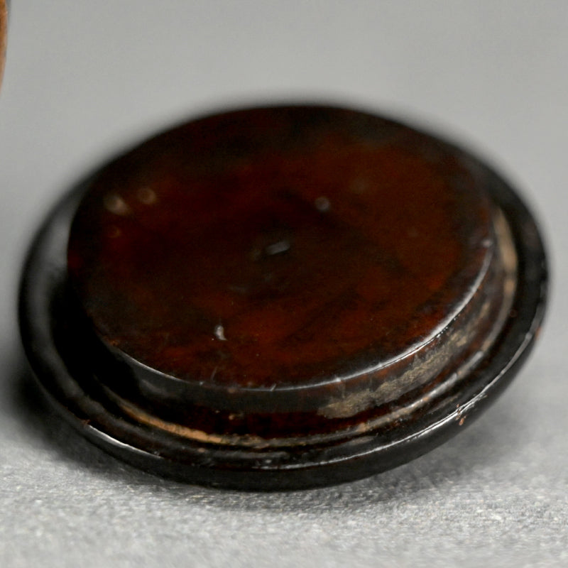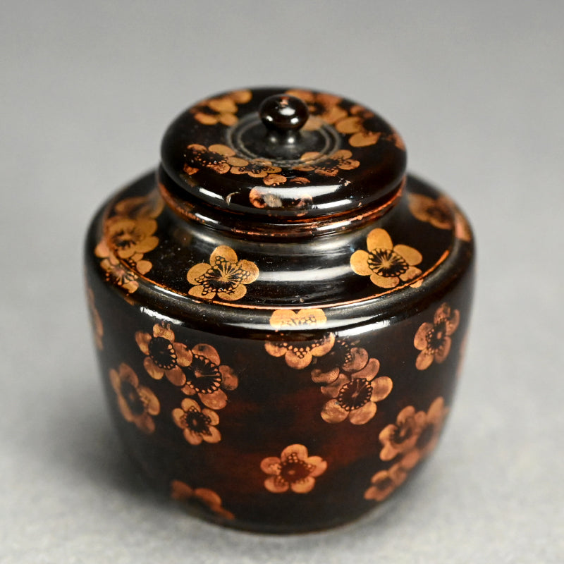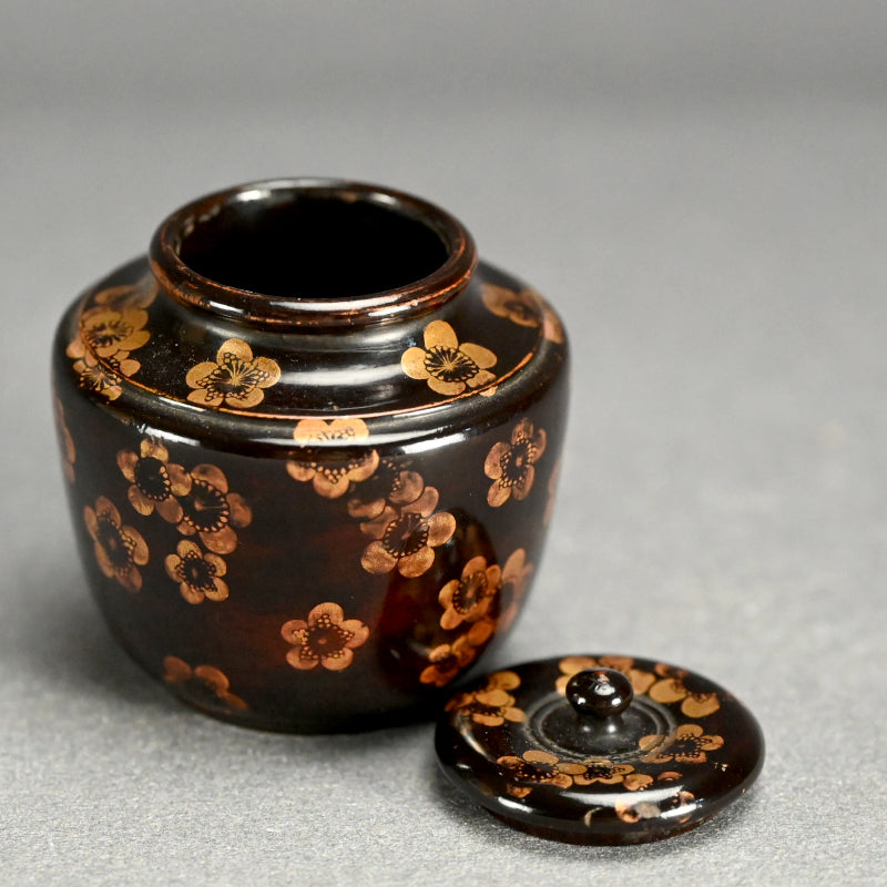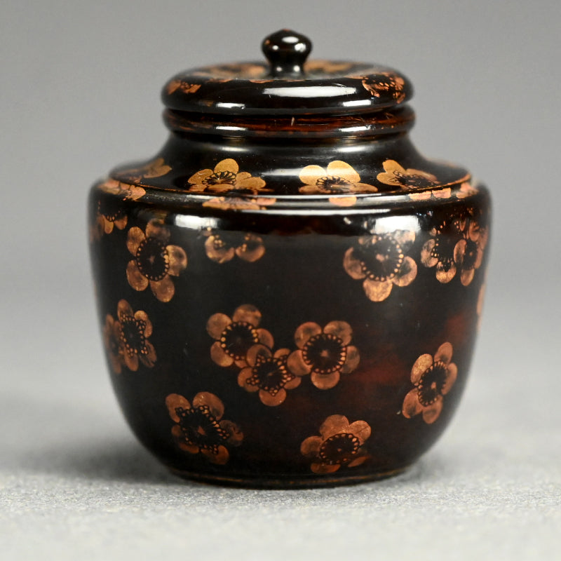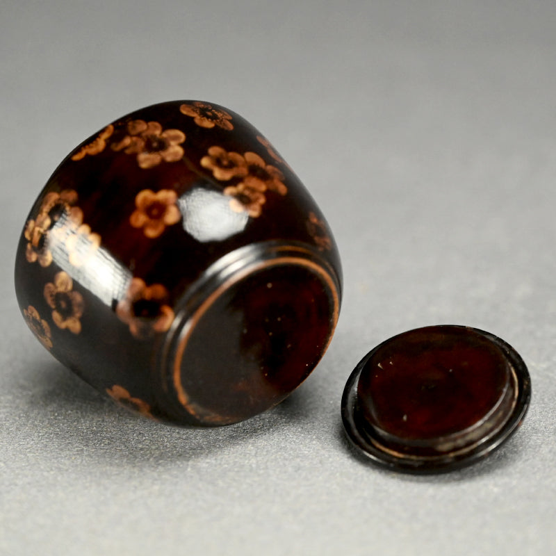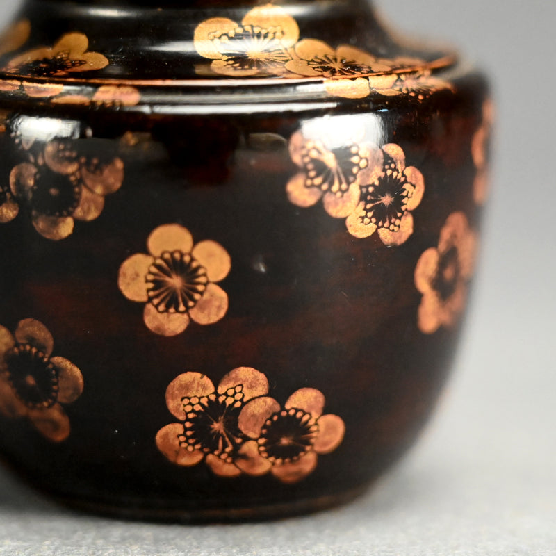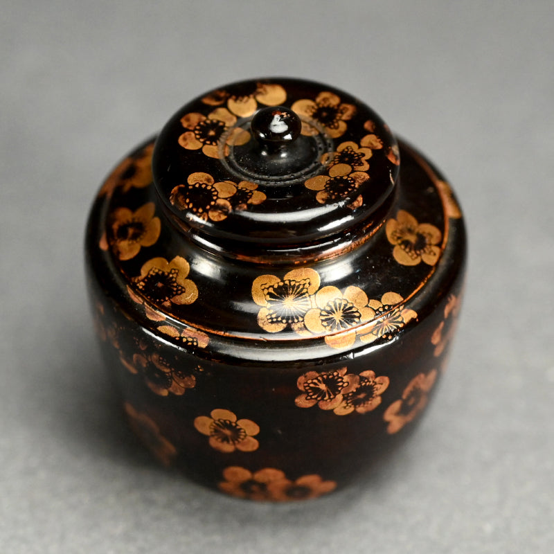 木製の蓋付きの美しく小さな壺で、黒漆塗りで覆われています。金色の梅の花で飾られ、絹袋で包まれ 古い桐箱に入っています。19世紀のもので、直径6cm、高さ7cmで状態は良好です。