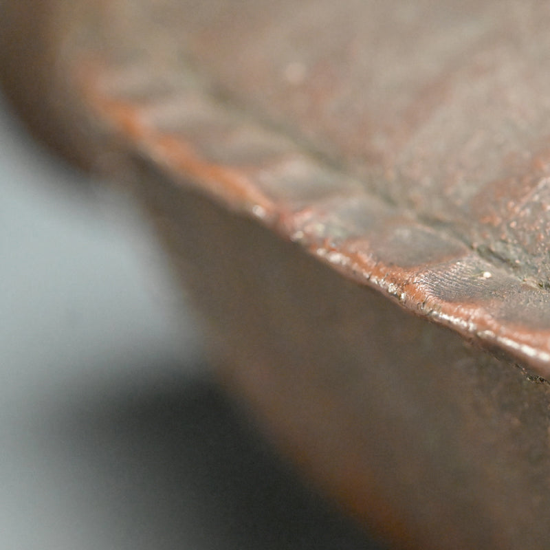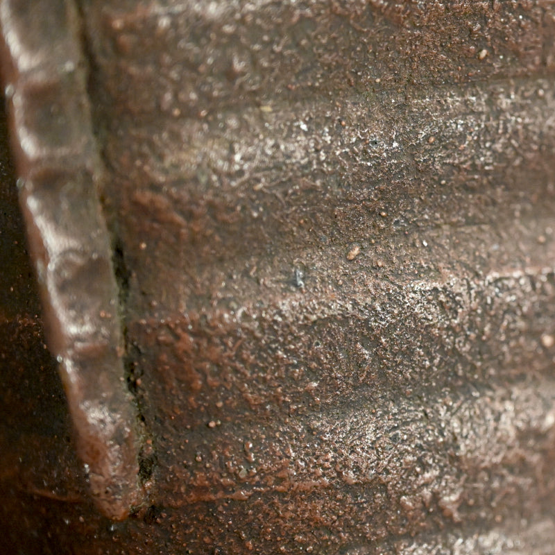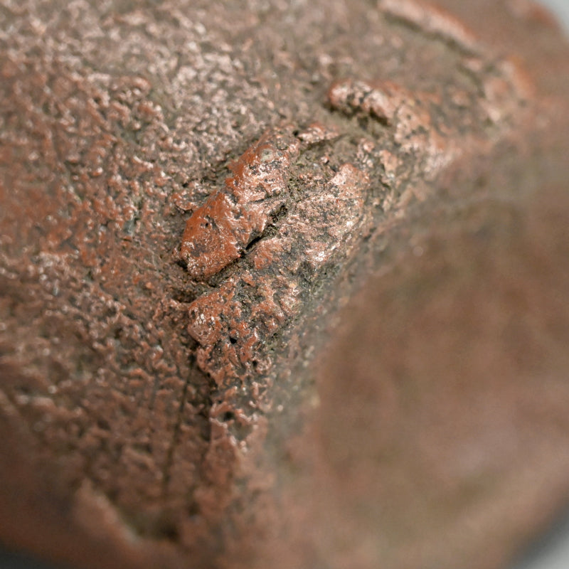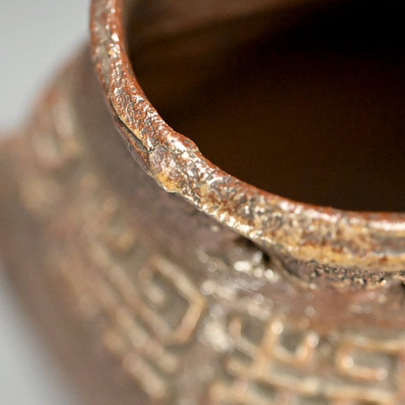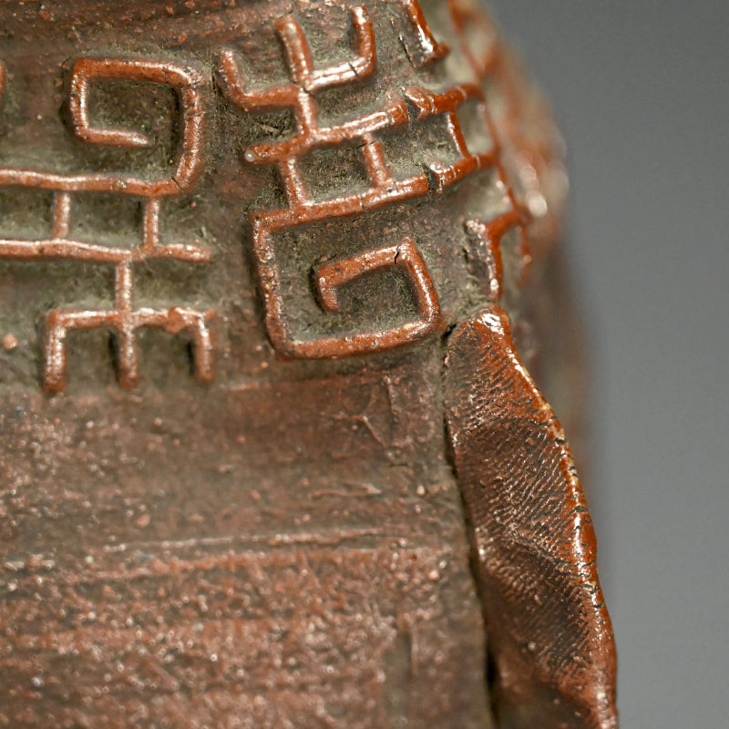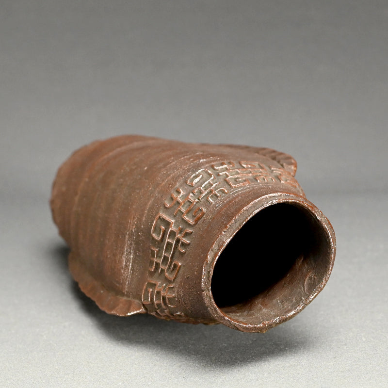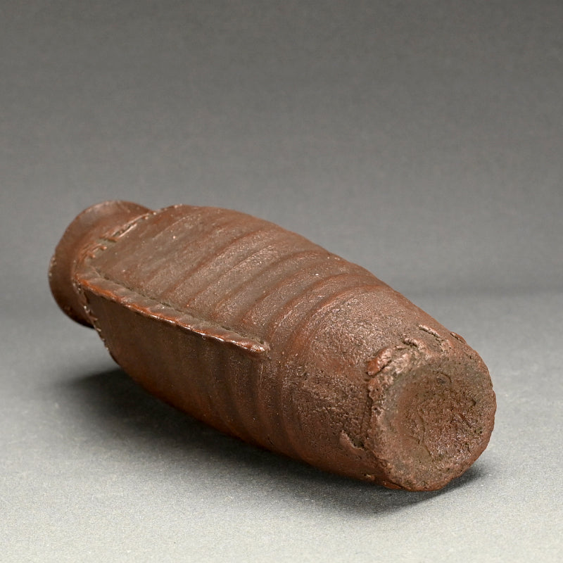 岡山県の虫明窯で発見された 19~20世紀初頭にかけての舟虫型土瓶です。海岸沿いで発見された背の広い昆虫の形をした壺で、底には 幸運の象徴であり「よろこぶ」の異字である数字の「㐂」が3つ彫られています。サイズは14.5 x 9 x 25 cmで 状態は良好です。